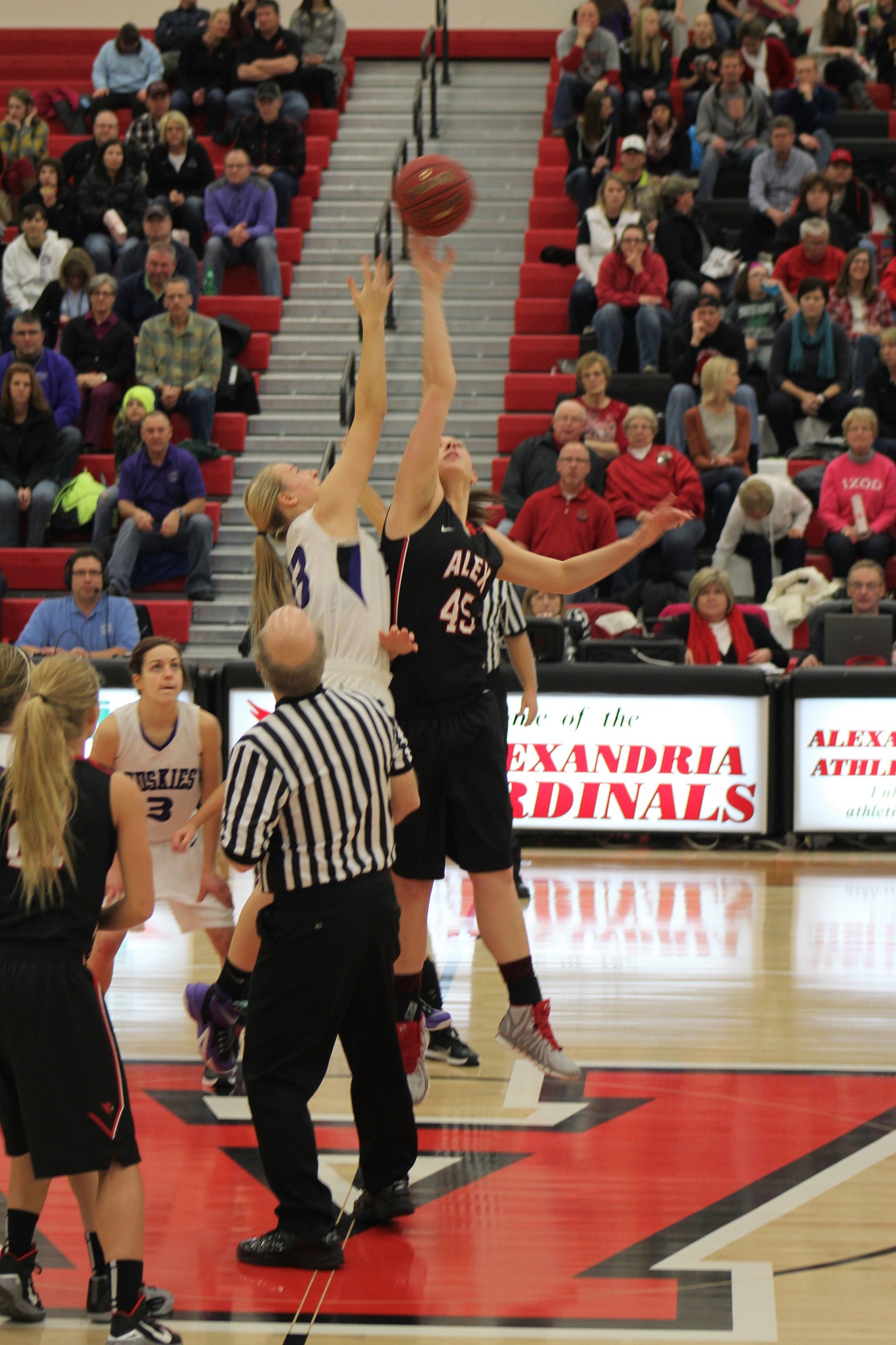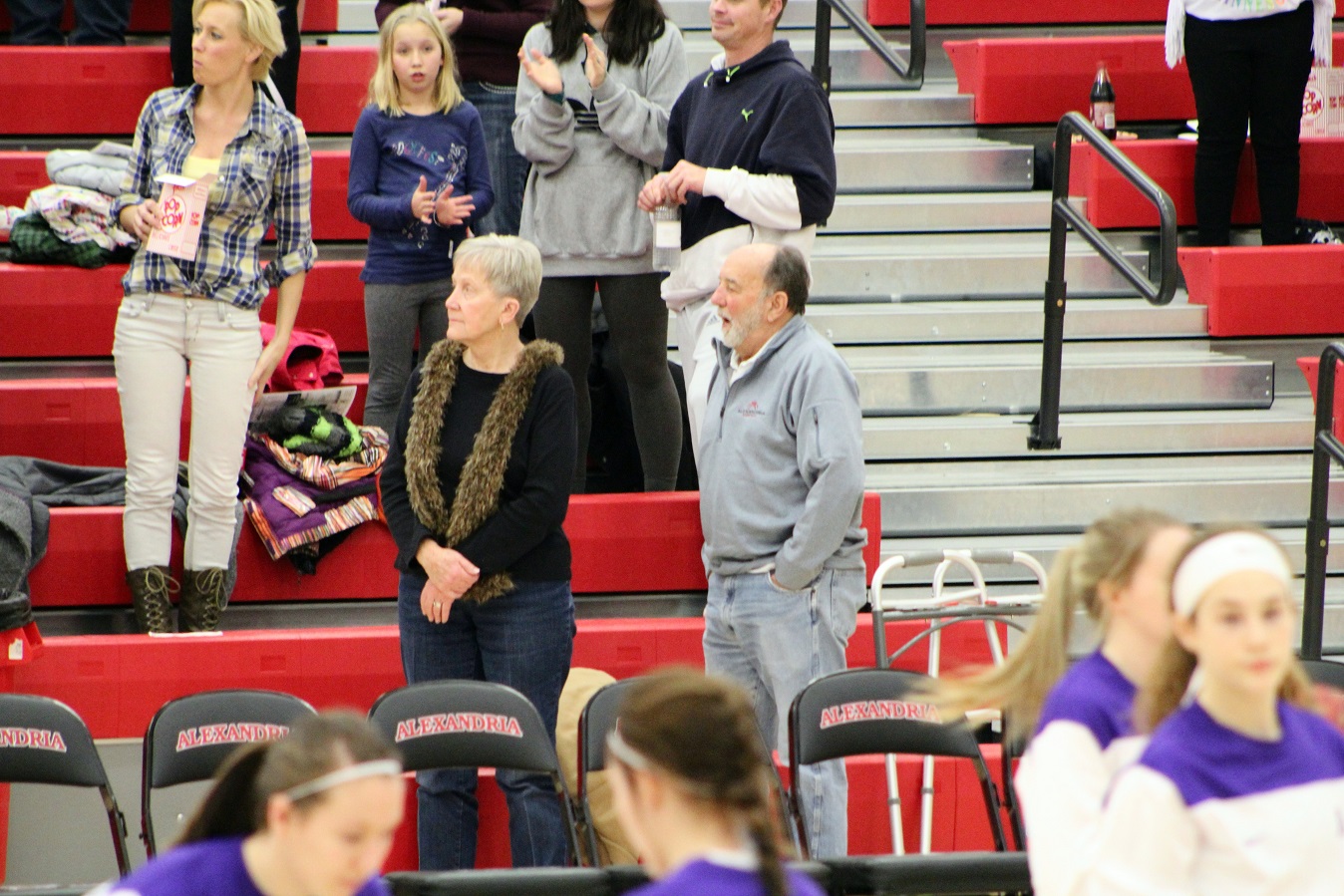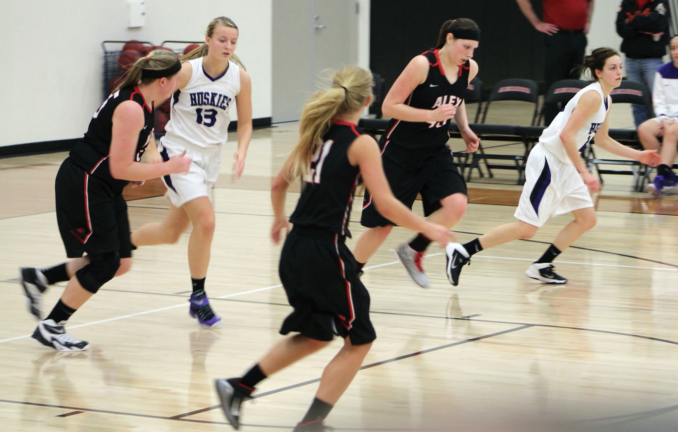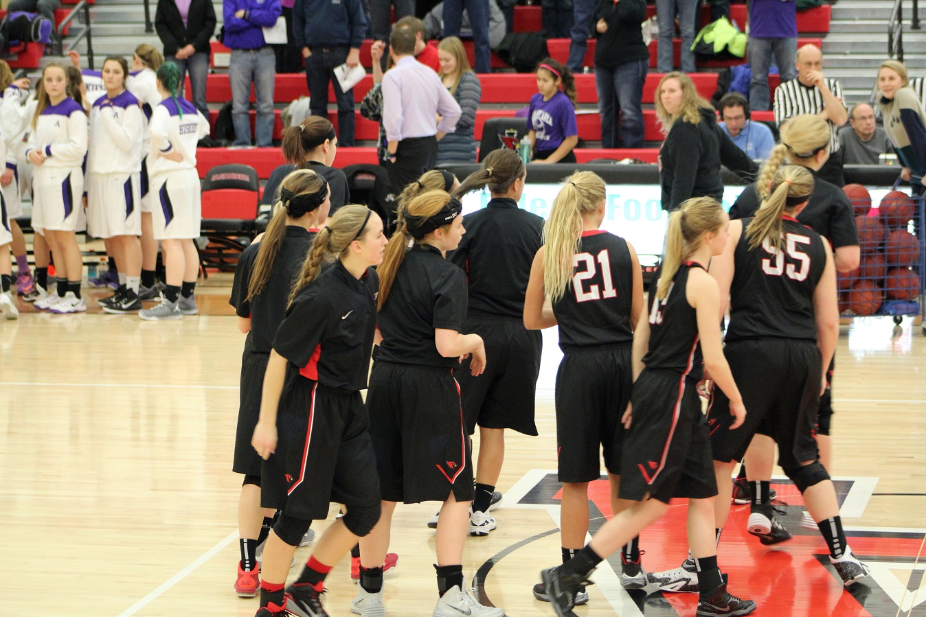 [The half ends, our best of the year. The Huskies were 14 – 14 from the free throw line in the half. Obviously, they can shoot. We didn’t let them shoot much from the floor. And we must have shot over 50% per cent from the floor, with 3’s from Kendall, Macy, Brooke, and Gretchen Revering (25), senior, came in to swish a long one. Now you can look at the video at the top for the first 5 minutes of the 2nd half – true, Kendall bricked a 3 in the video, but she also drained a howitzer from about 5-feet beyond the line.]