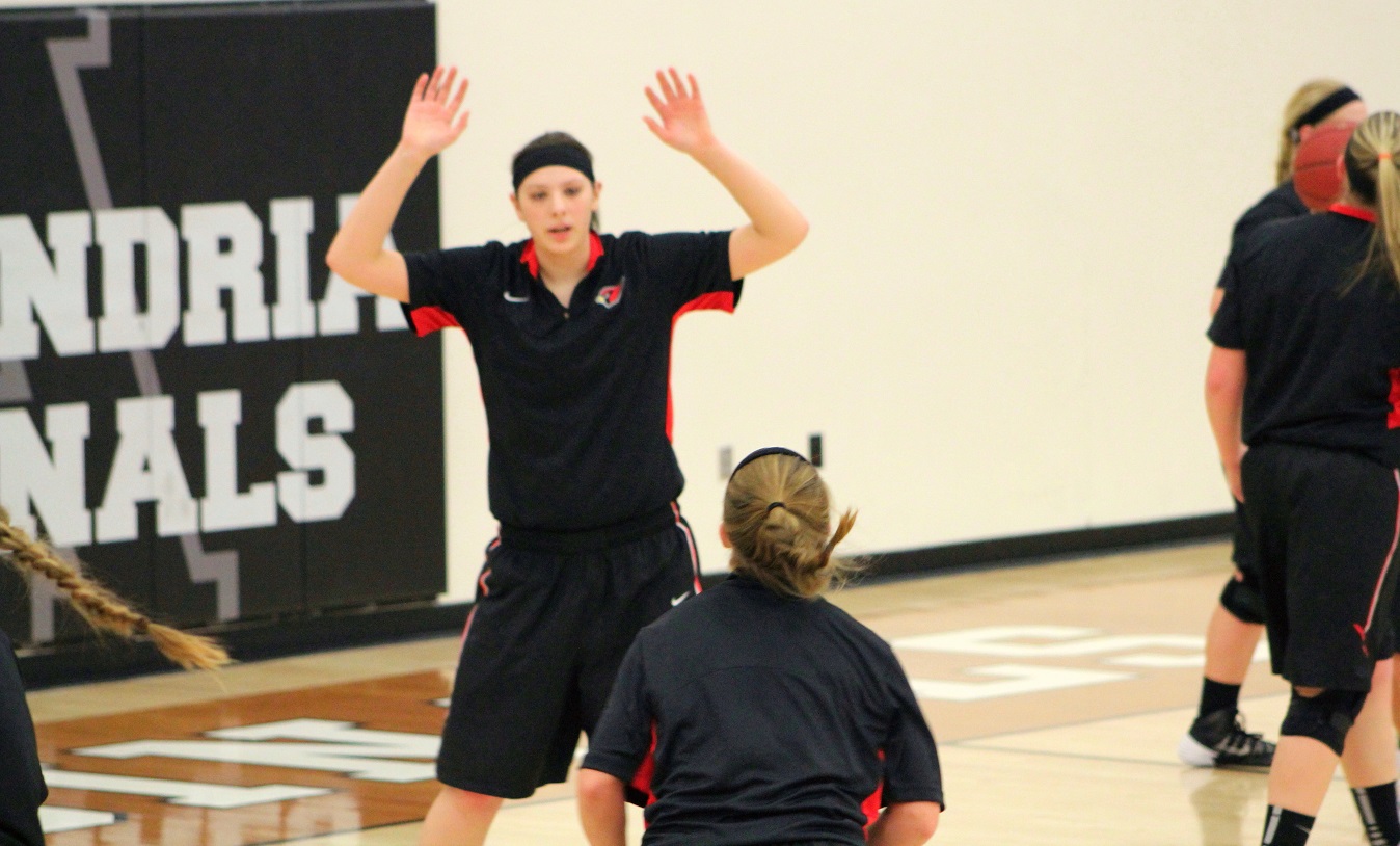 [Cheyenne Hendrickson (55), senior, anchors the half-court defense.]