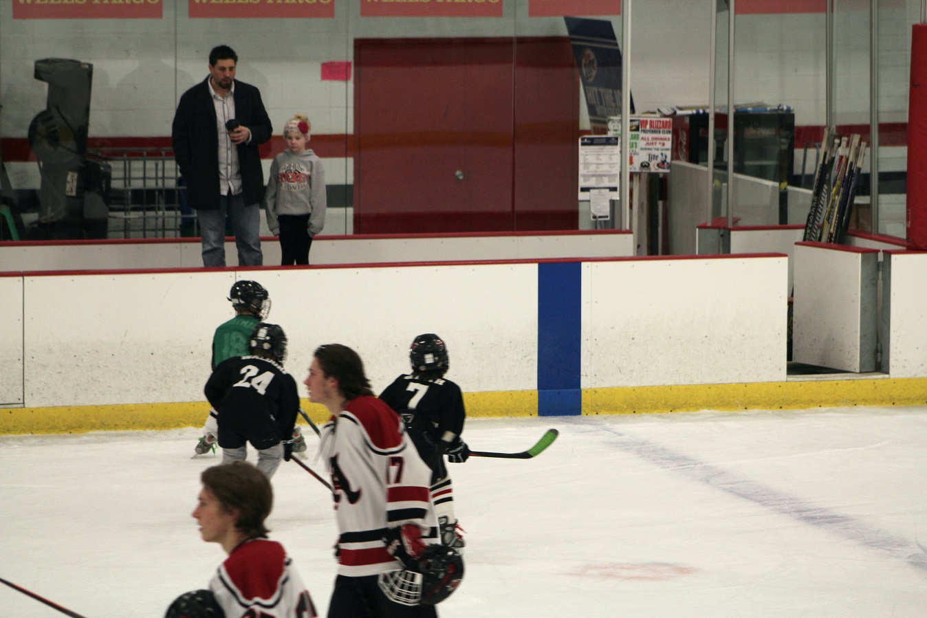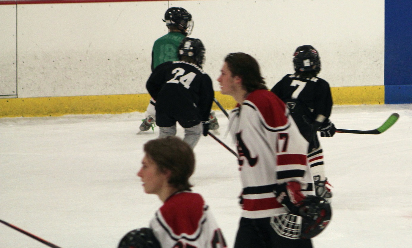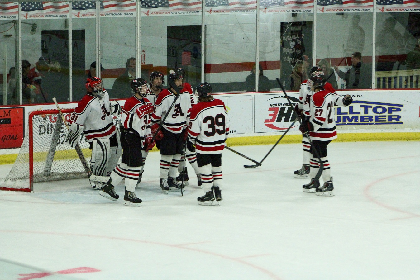[In the 3rd period, play was disjointed throughout – the Cardinals took 4 penalties (why?), the Flyers took 2, so no rhythm was ever established. Leary scored the final goal late in the game on assists from Wyatt Wittenburg (9) and Bigger. Then everybody went to congratulate Christian Reimers (31) for pitching a shut out.]