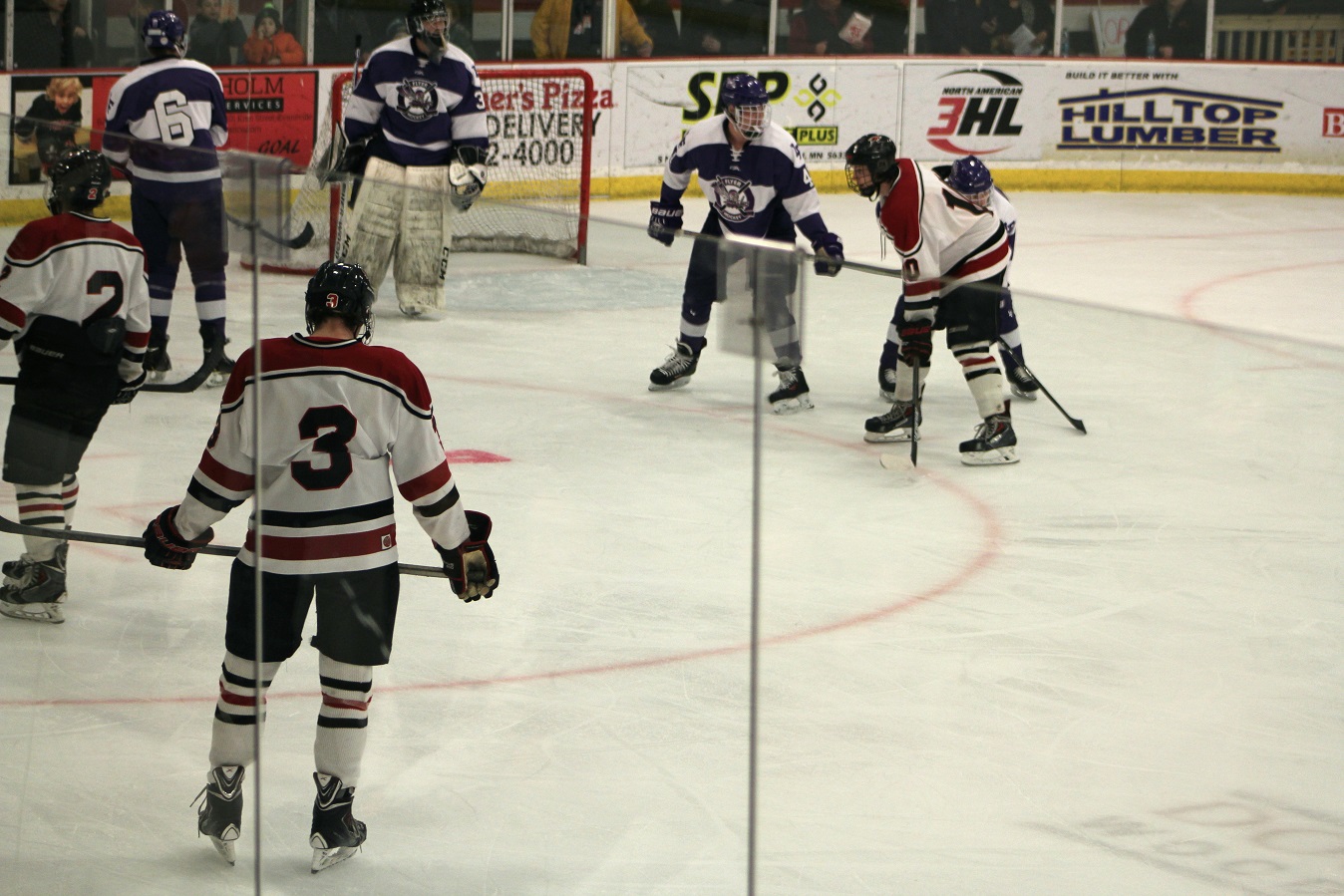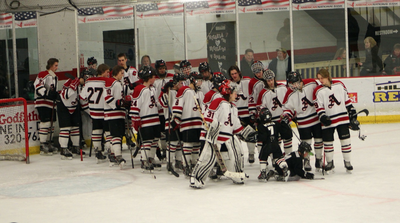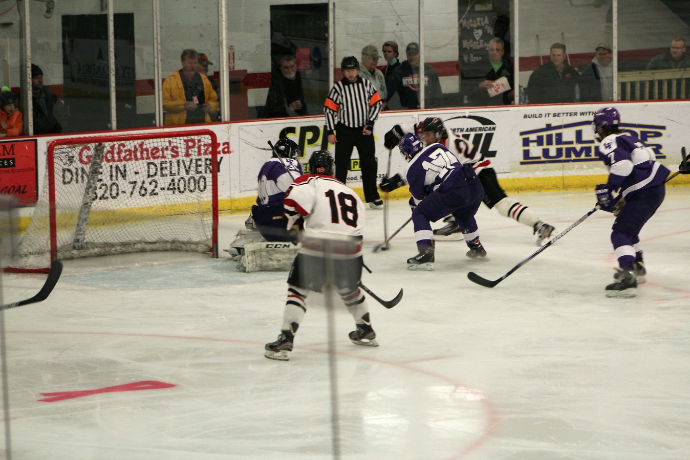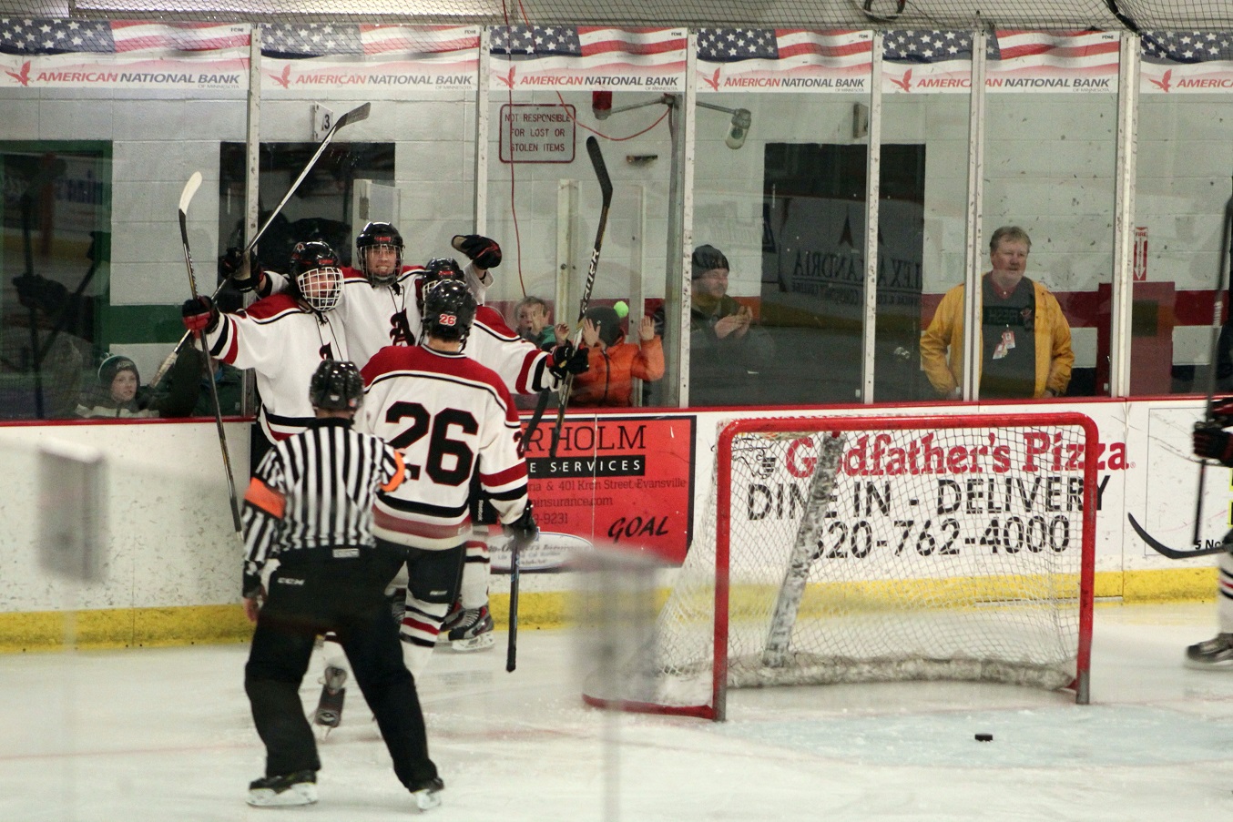 [In the 3rd period, play was disjointed throughout – the Cardinals took 4 penalties (why?), the Flyers took 2, so no rhythm was ever established. Leary scored the final goal late in the game on assists from Wyatt Wittenburg (9) and Bigger. Then everybody went to congratulate Christian Reimers (31) for pitching a shut out.]