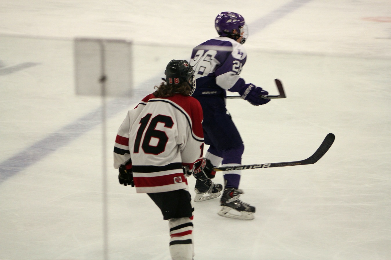 [Mack Strong (16) zeroes in on a Flyer – just don’t nail him from behind into the boards!]