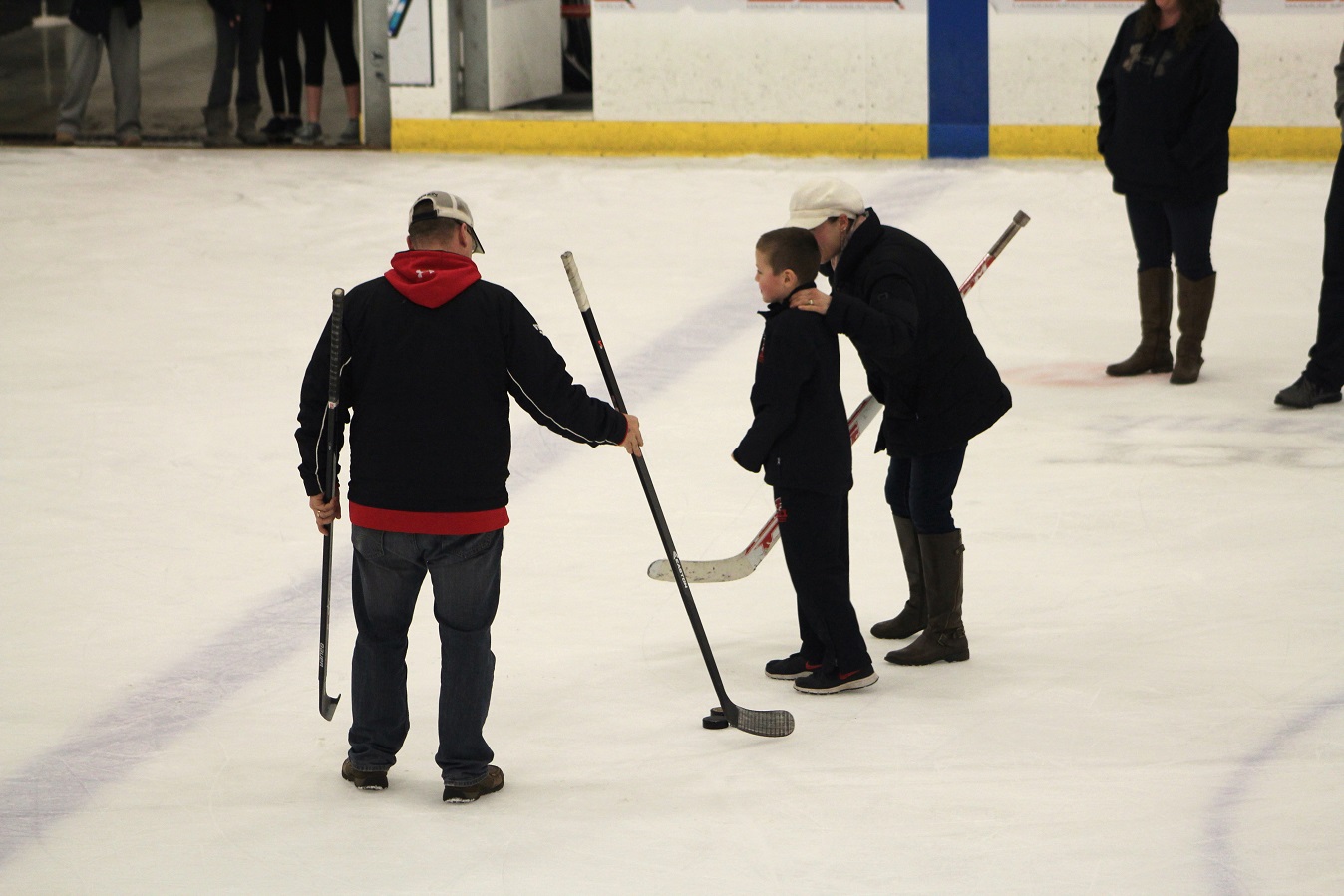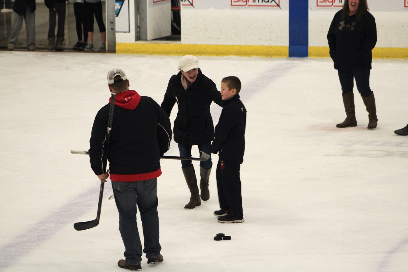 [The between 2nd and 3rd period puck shoot. As I reported at the time on FB: The Cardinal Puck Shoot had not had a winner all year . . . until last night. This young man stepped up and put it right down the middle through the $100 slot! He seemed nonplussed about the whole thing. But we laughed when a whole gaggle of young ladies greeted him happily as he came off the ice . . . pizza at The Depot, on him? The video I shot in 2010 – just including it so you can get an idea about what it’s all about.]