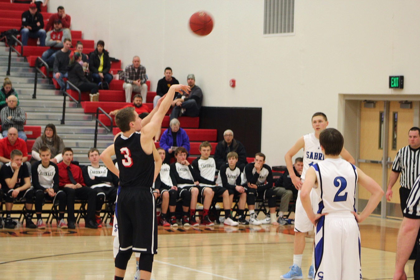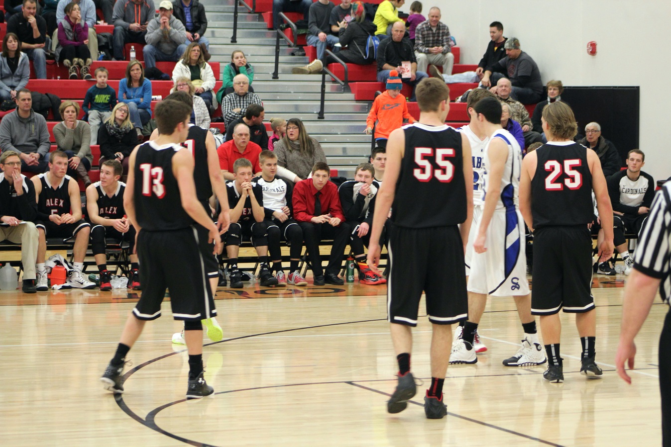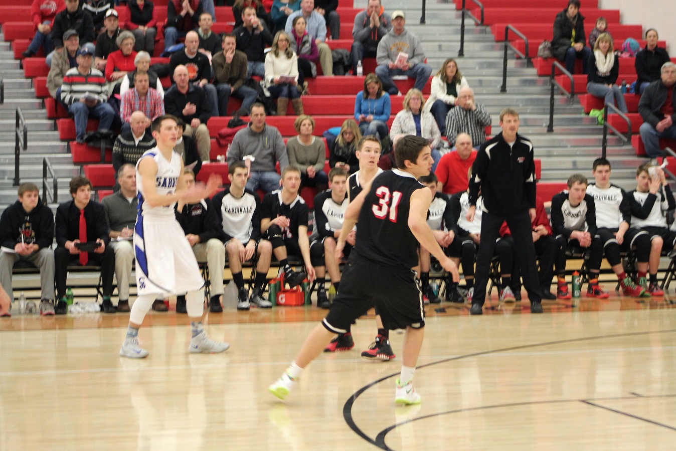 [Didn’t shoot many photos in the the 2nd half – just watched the game. Here Alec Wensman (55), 6’6″ junior forward joins the fray. Noticing Kruger in the photo, he was the key sequence in the 2nd half. I think at one time the Cards got down by 5. Krueger hit two key 3-pointers to get our mojo back. I don’t know if we had more than one other 3-pointer the whole game?]