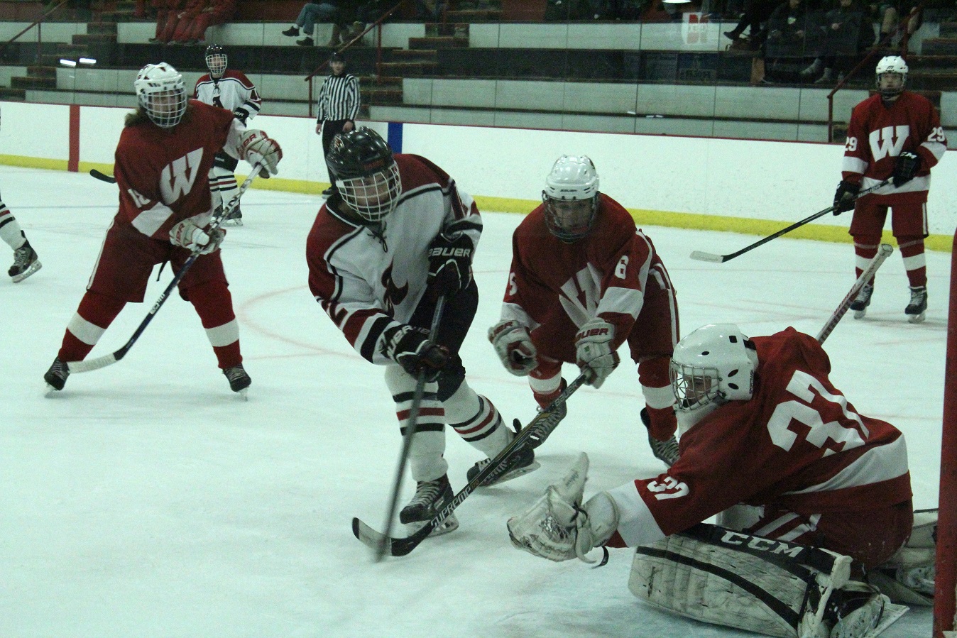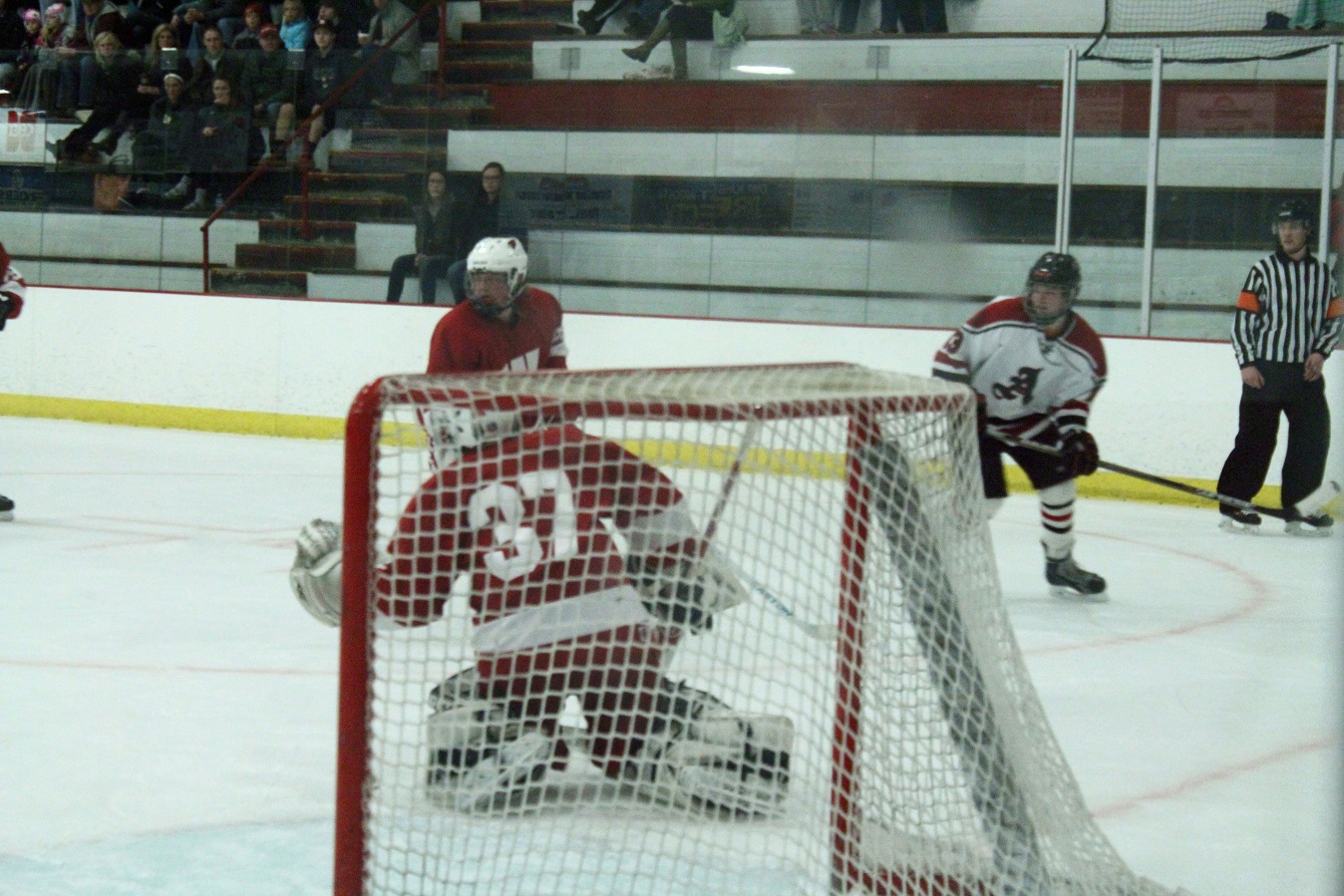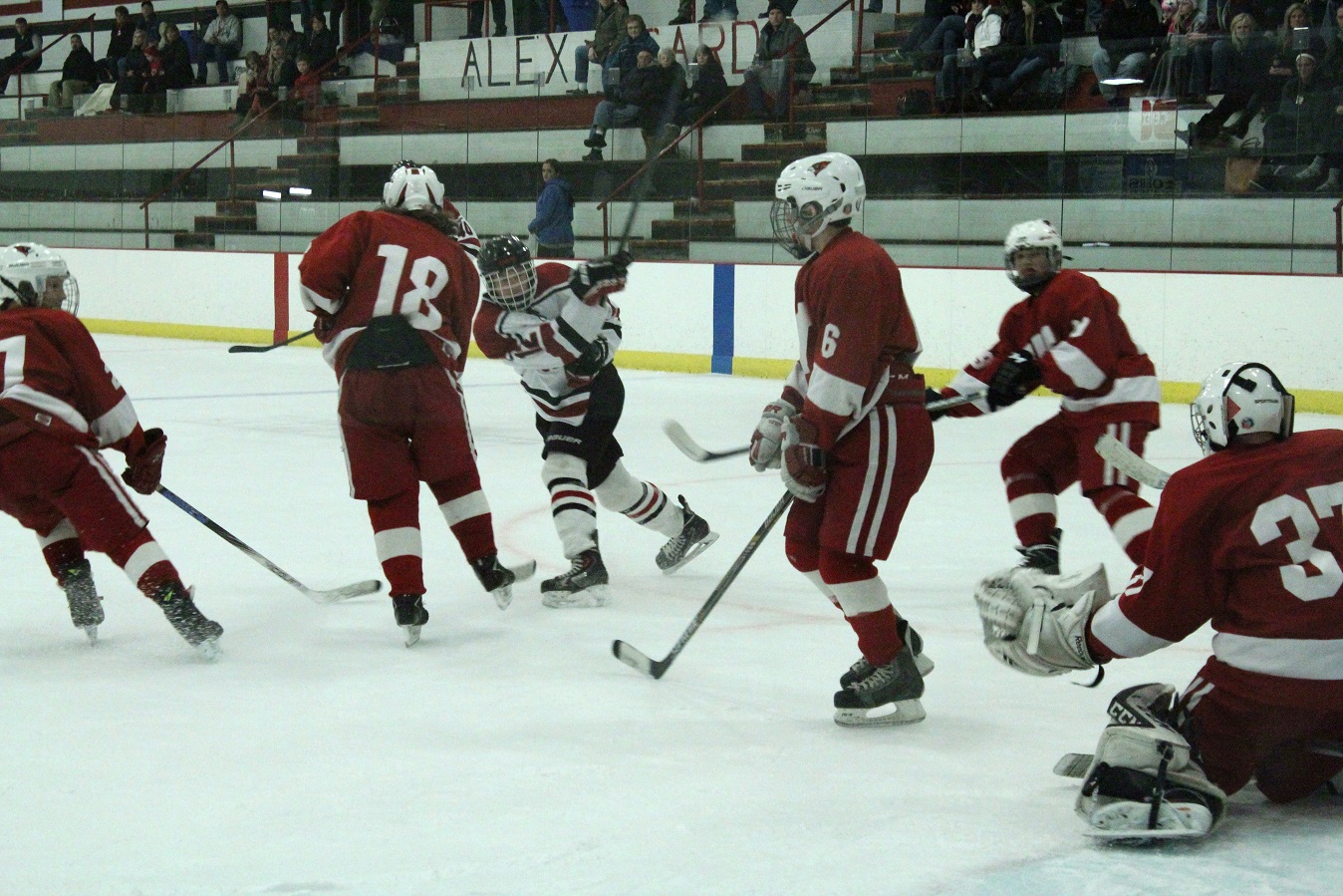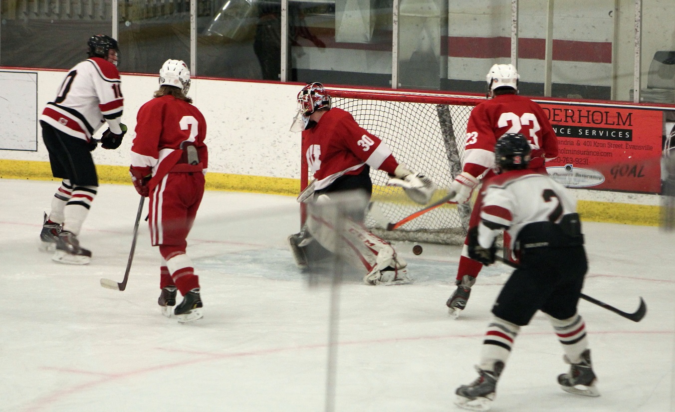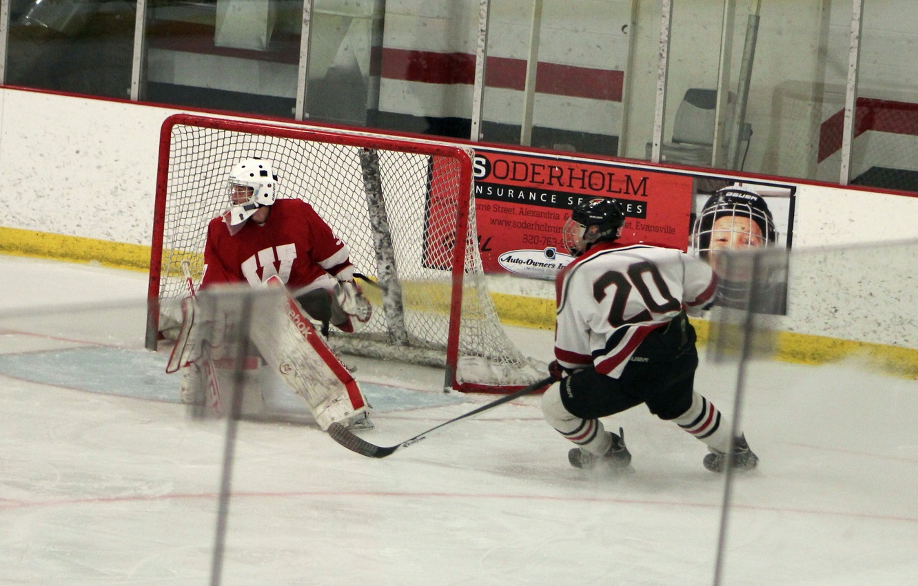 [The poor Willmar goalie was in this situation a lot. Though all I see is the “2,” I suspect this is Reed Larson (12), sophomore forward.]