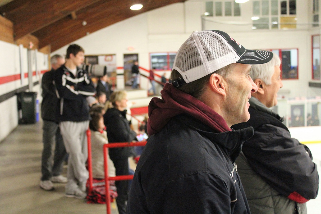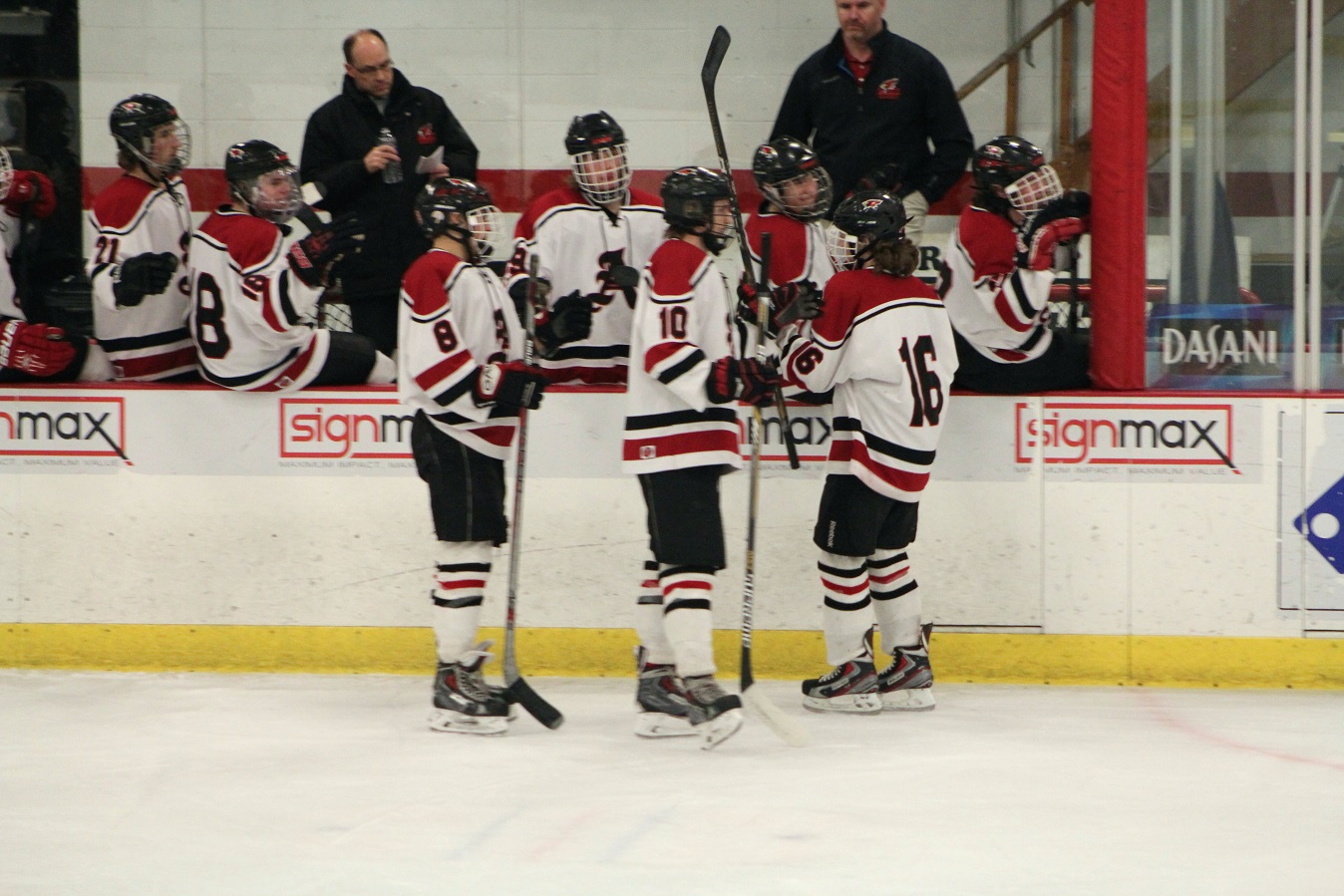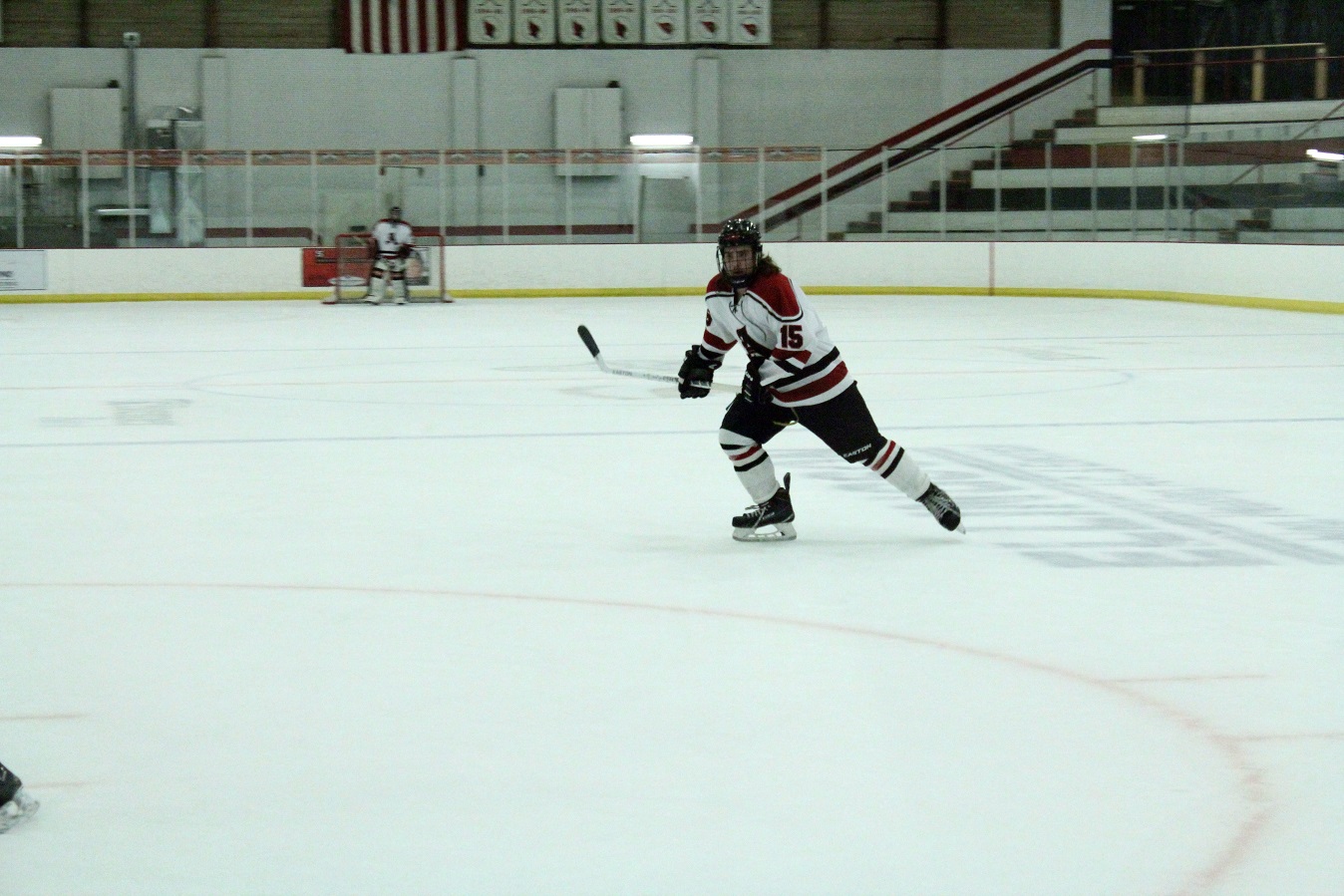 [I arrived as I usually do about halfway through the JV game. It’s now still light at 6:00, and the weather was so balmy I was wearing a spring weight jacket. Neither seemed appropriate for hockey season. This game was not much fun for the other Cardinals.]