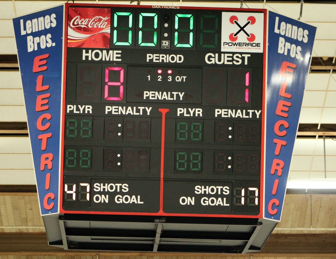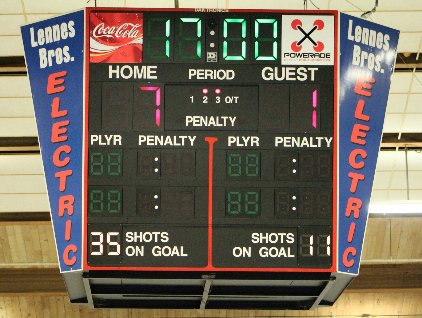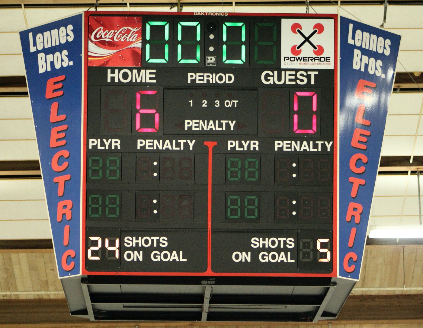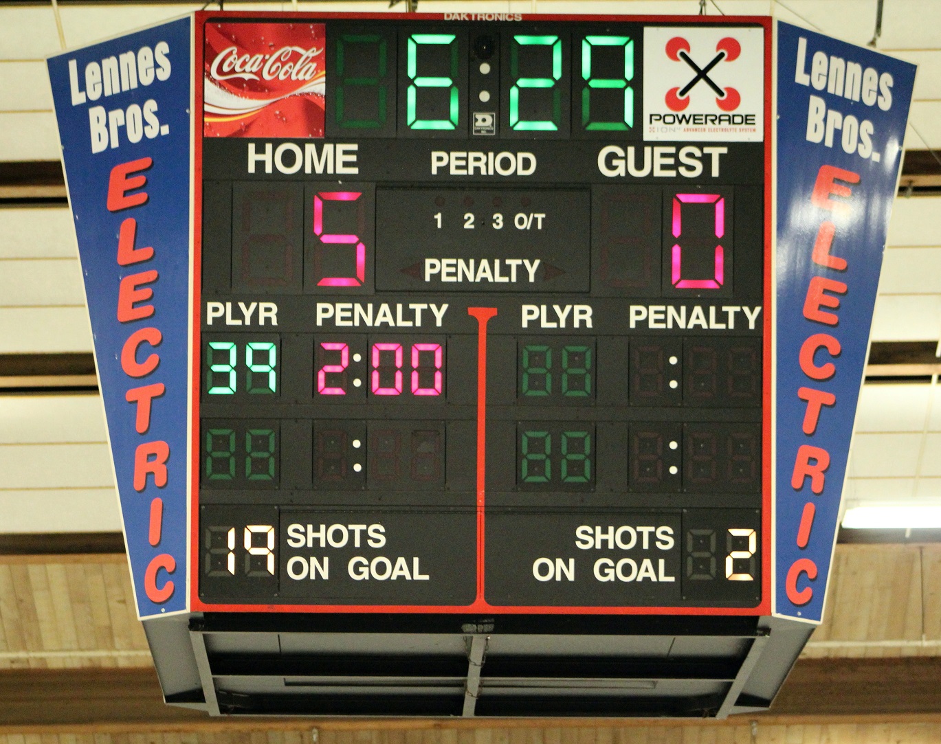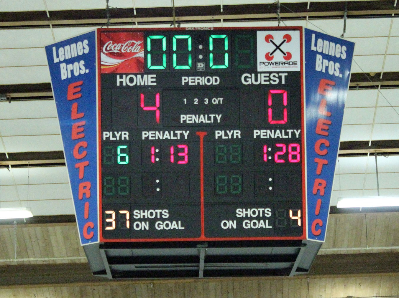 [The end of the 2nd period. Then came the 3rd period explosion. As you can see from the final scoreboard at the top of the JV story, they stopped the shot count at 39 (it would be hard to go from 4 goals to 10 on only 2 shots, eh?).]