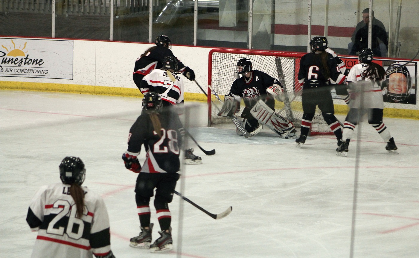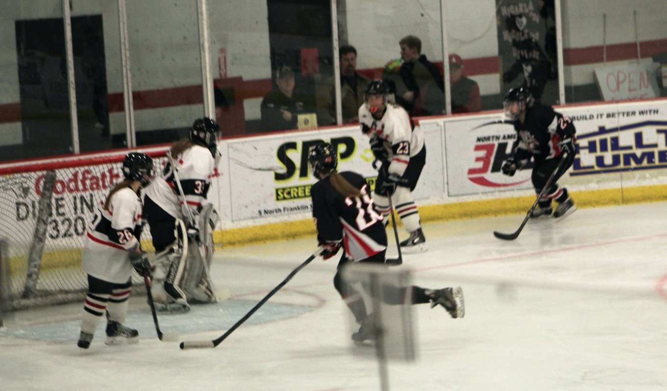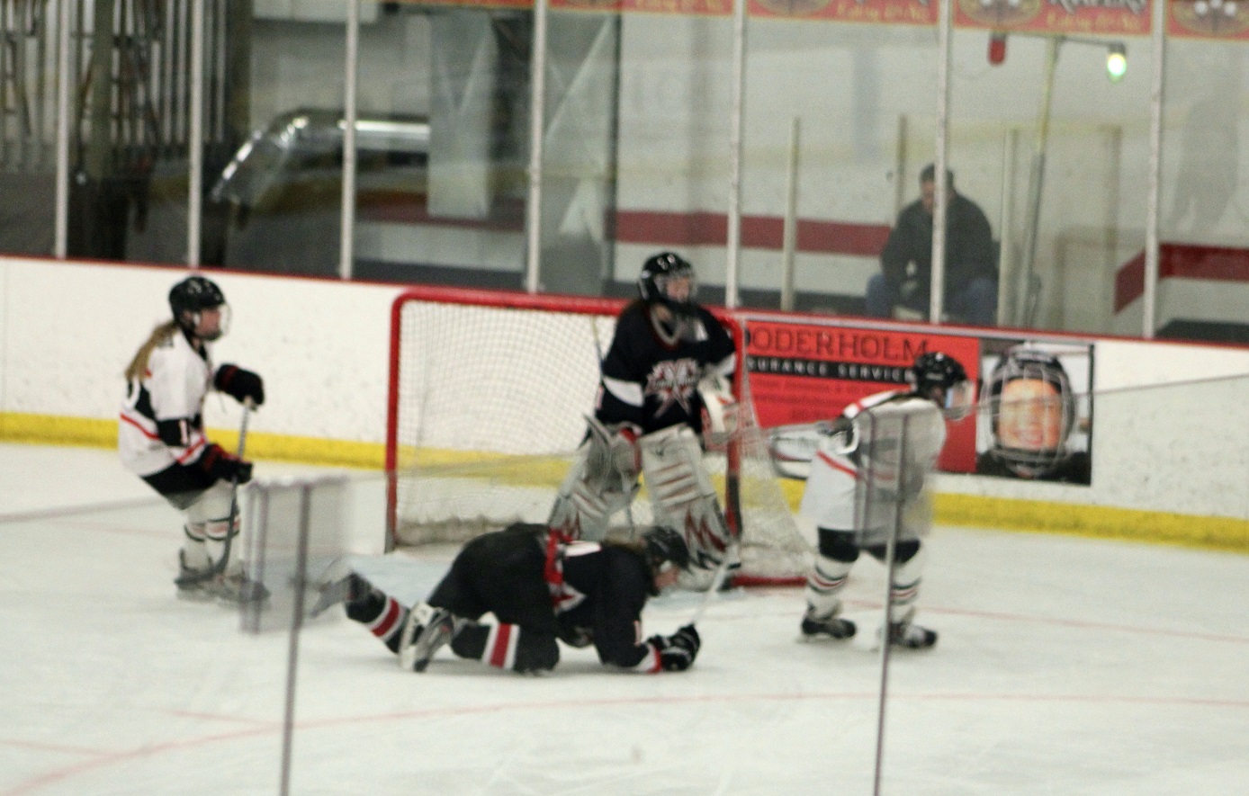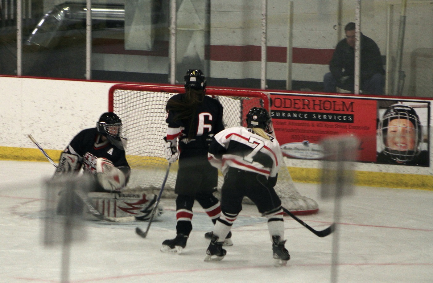 [Nicole Bartels (23), in our end with Leary, and Amy Jost (33) in goal.]