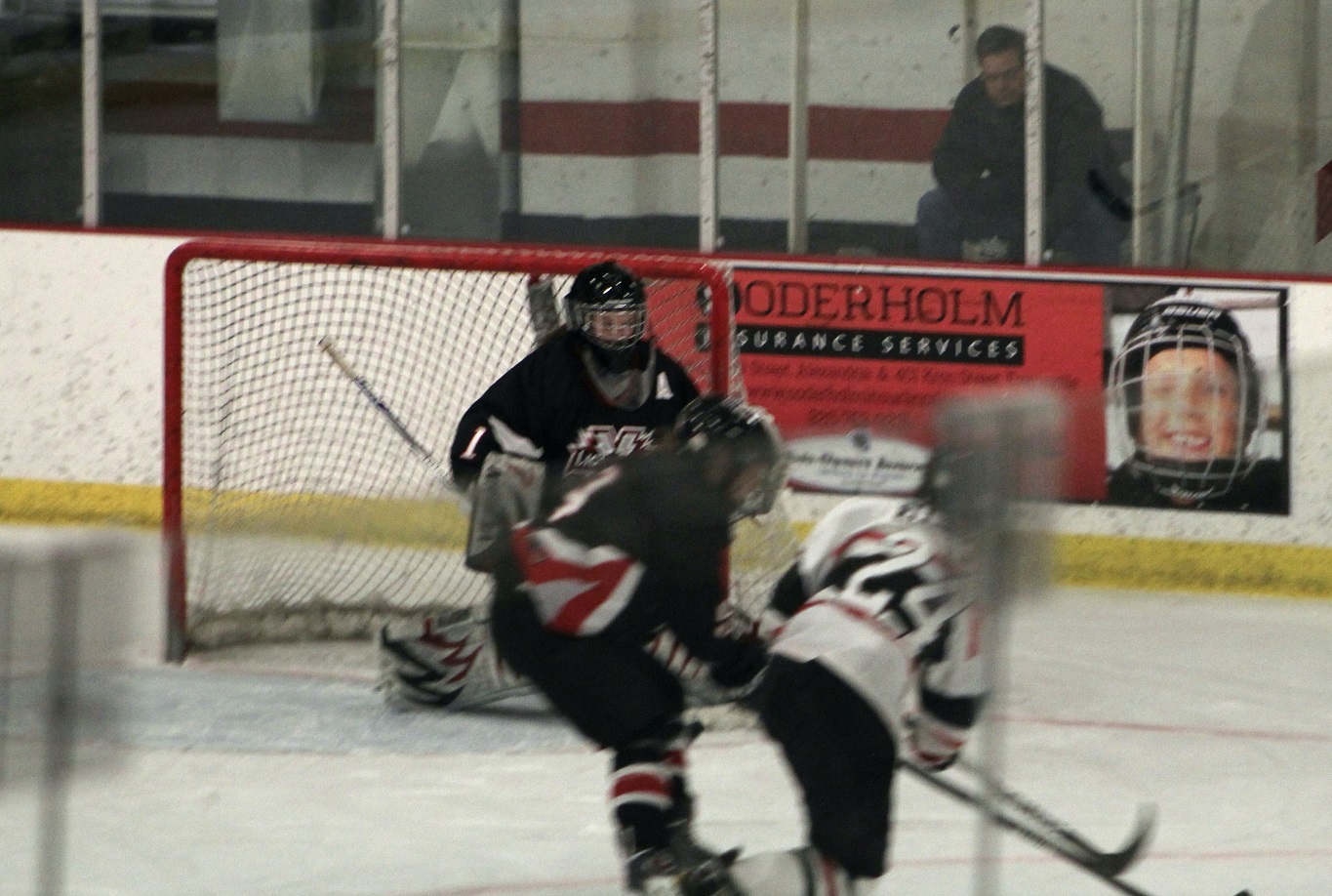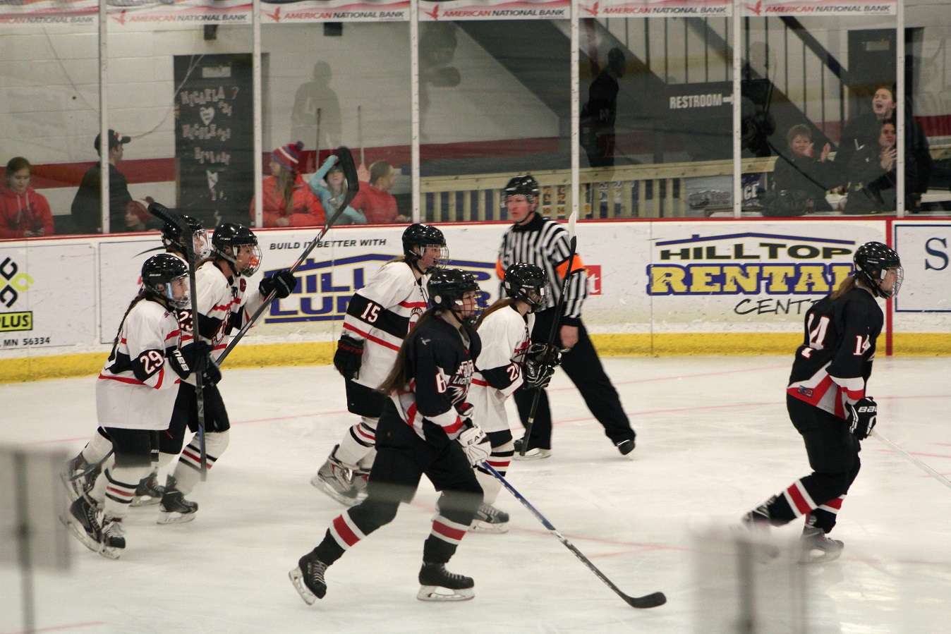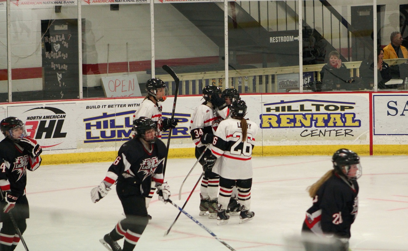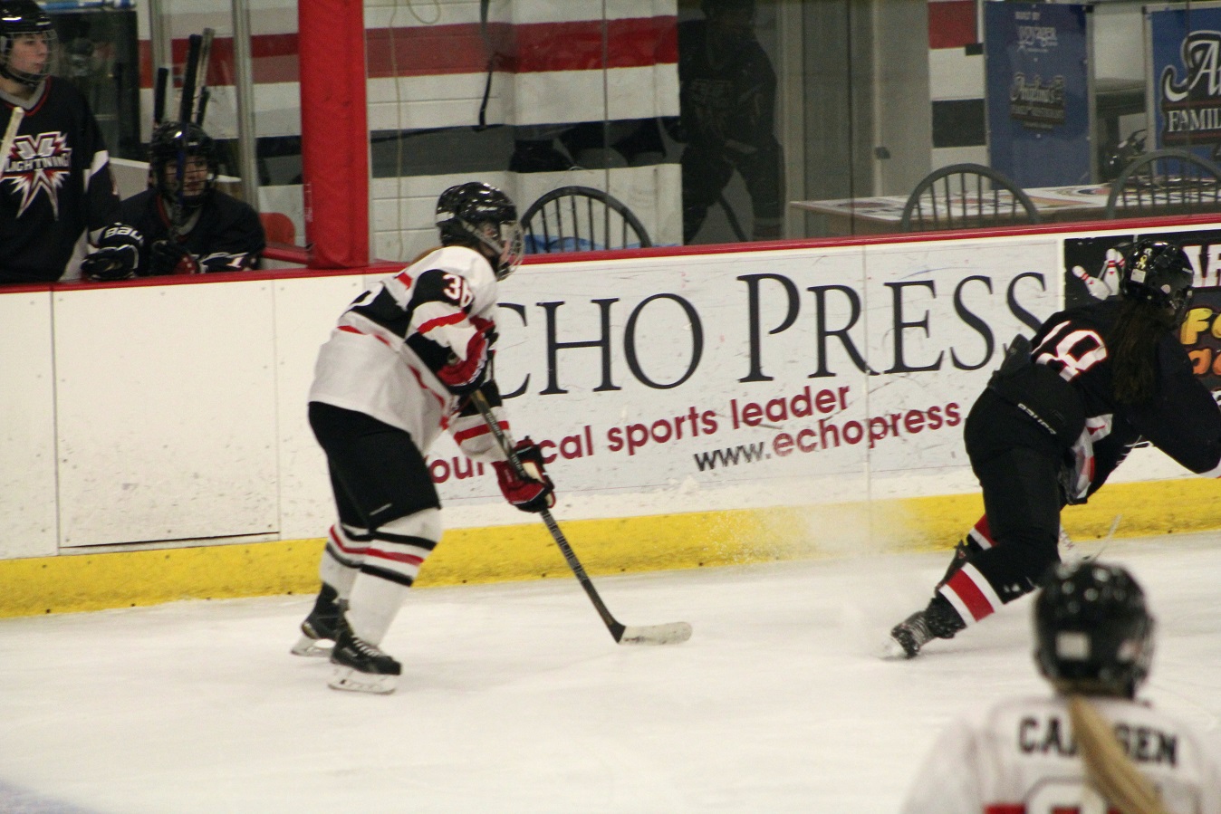 [A great lead going into the final period. The team apparently thought so as well. The Cards seemed indifferent in the 3rd period (hence, no photos) and the Lightning were able to score a couple of goals. Coach Hovel also mentioned at the end of the game that the 3rd period “let down” was something her was going to have to address before the next game. We’re in a one-and-done situation now, so the team has to maintain a sense of urgency through the whole game. We beat Detroit Lakes twice during the regular season – but both were close games and as they say, it’s hard to beat a team three times in one year!]