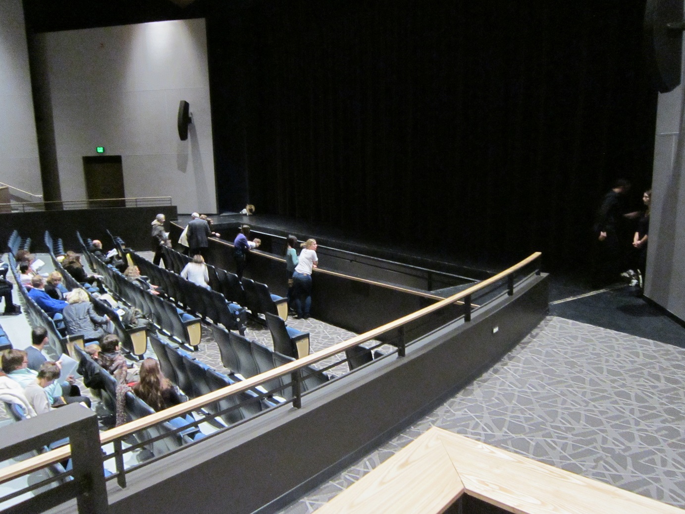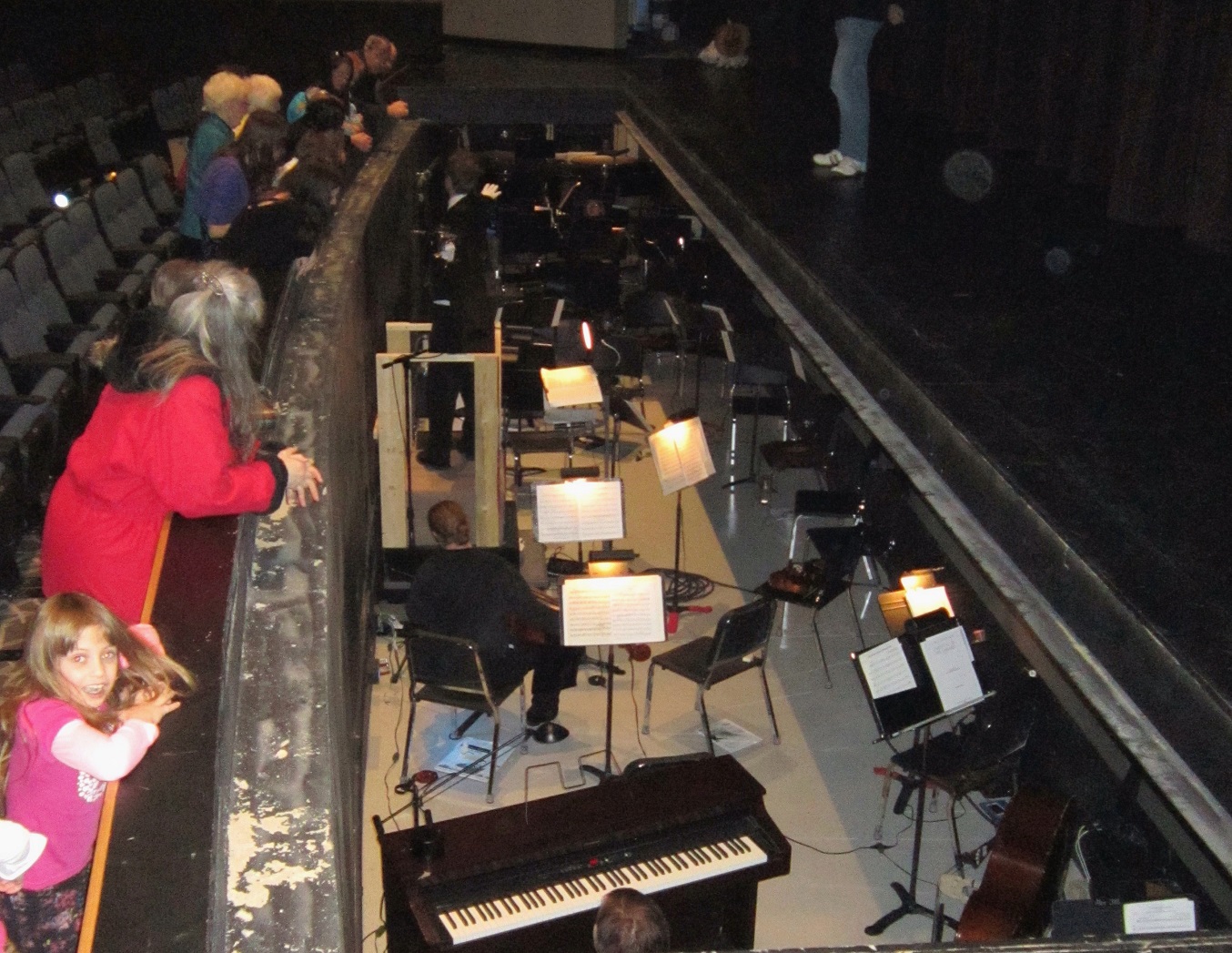 [The hole in the floor . . . and it was quite a hole! This was the first event at the performing arts center where the orchestra pit was used. The buzz in the crowd was that it was the 2nd largest such pit in the state. As I recall, Maestro Brad told me it was designed for 42 – 44 musicians but that 55 would be “down there” today. Hey, watch where you’re sticking that bow!]