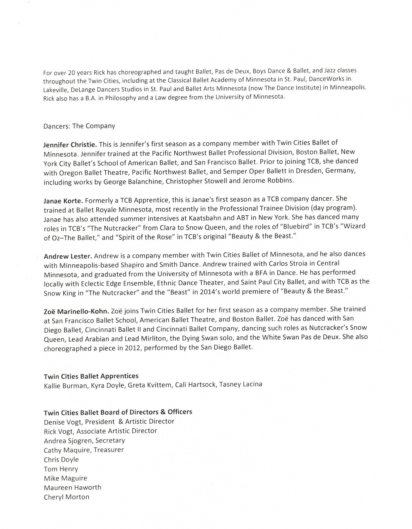 [Sunday morning dawned bright and clear. The temperature over beautiful Lake Darling was 19 degrees below zero, the wind chill was a balmy minus 41 (I did notice that going out to get the morning paper in my bathrobe). But we didn’t care . . . we were going to the symphony/ballet, a collaboration between our own Central Lakes Symphony Orchestra (CLSO) and Twin Cities Ballet!]