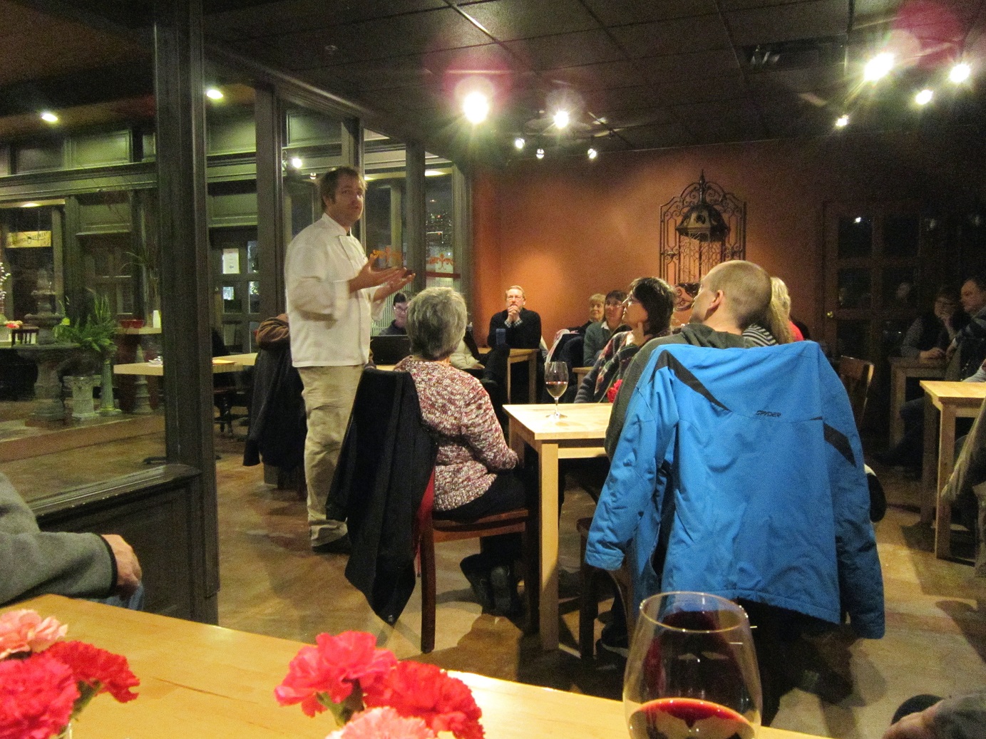 [On the Tuesday night before the state tournament possible options included our boys’ hockey section quarter-final game (figured to be the easy win that it was) or to go down to the Cities a day early to catch the Gopher women’s basketball game against 11th-ranked Iowa. If we had done the latter, we would have seen sophomore center, Amanda Zahui B, set a Big Ten rebounding record with 29, to go with her 39 points, in the Gopher victory! But we were scheduled for an evening of Native American Cooking with Matthew Jensen at Broadway Bistro (in conjunction with the library’s “Community Read,” Neither Wolf Nor Dog, by Kent Nerburn). Matthew told us about Native American foods, the preparation and storage thereof, and how he loves to apply those “natural” principles to his restaurant, including scouring his local woods for mushrooms. He prepared a venison stew in the way the local Indians would have, and also an Indian dessert. Both were declared delicious by the attendees.]