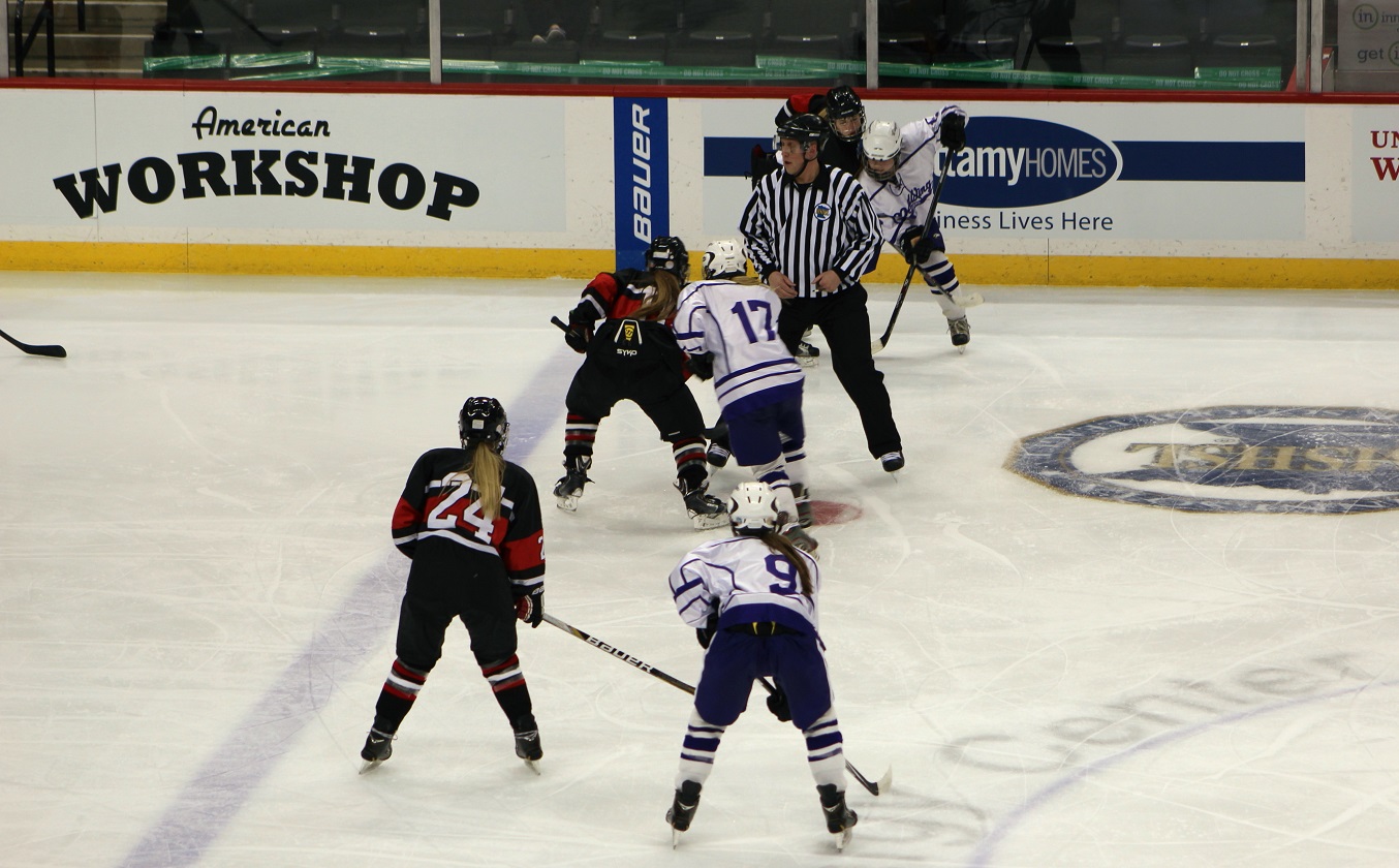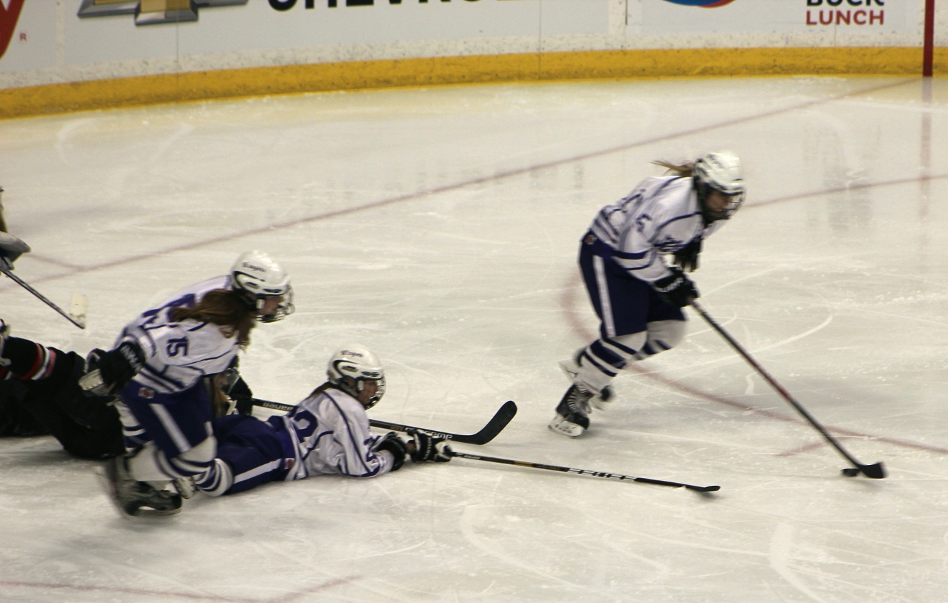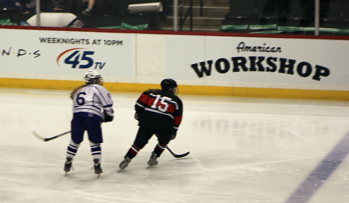 [The defensive pair of sophomore Kaitlin Leary (26) and senior Nicole Bartels (23) defend the blue line.]