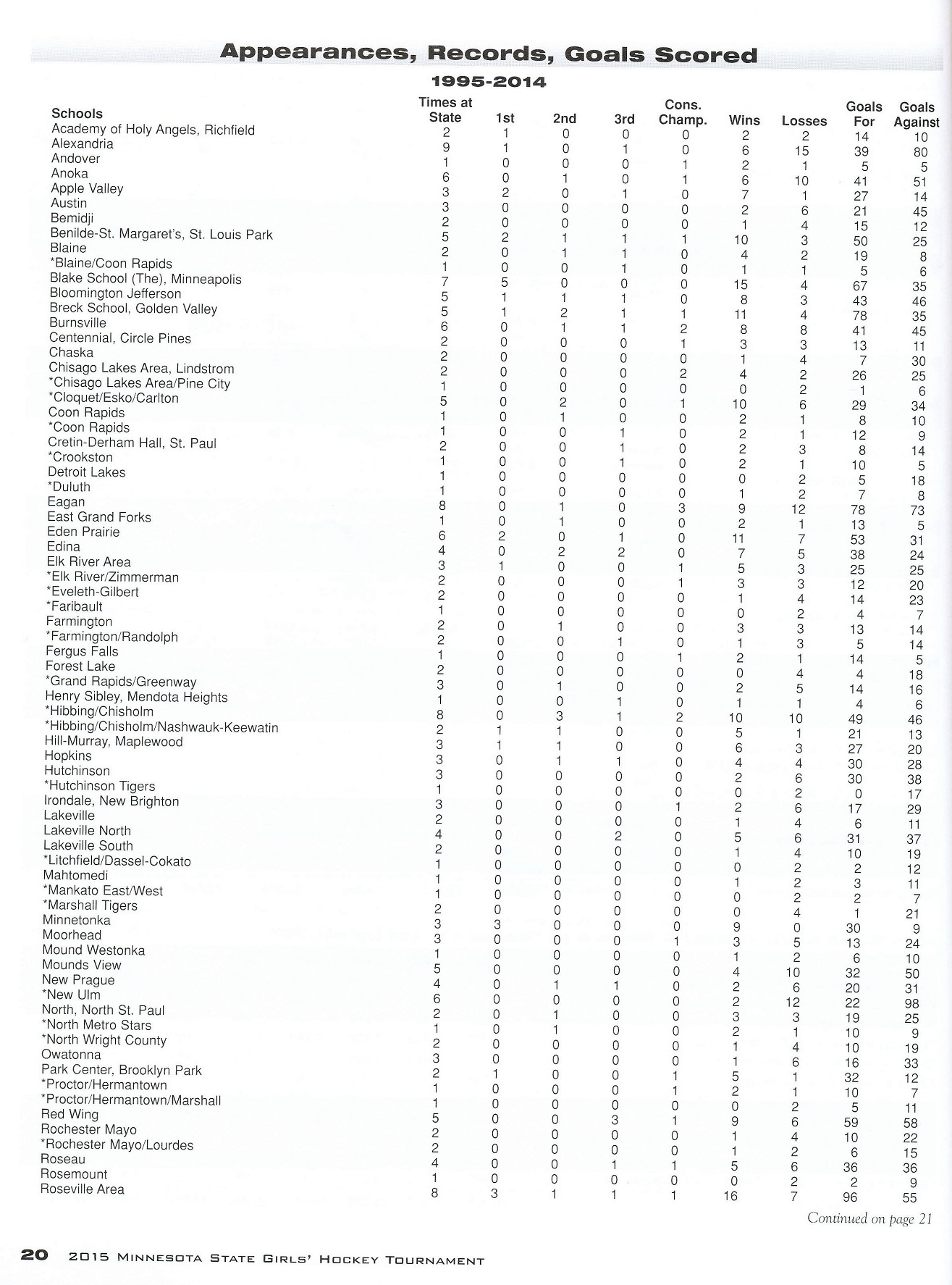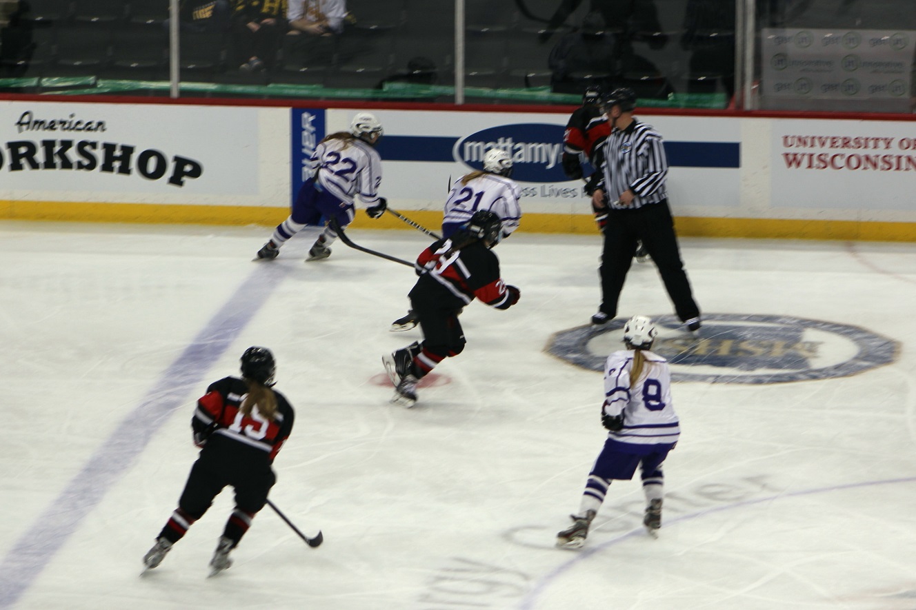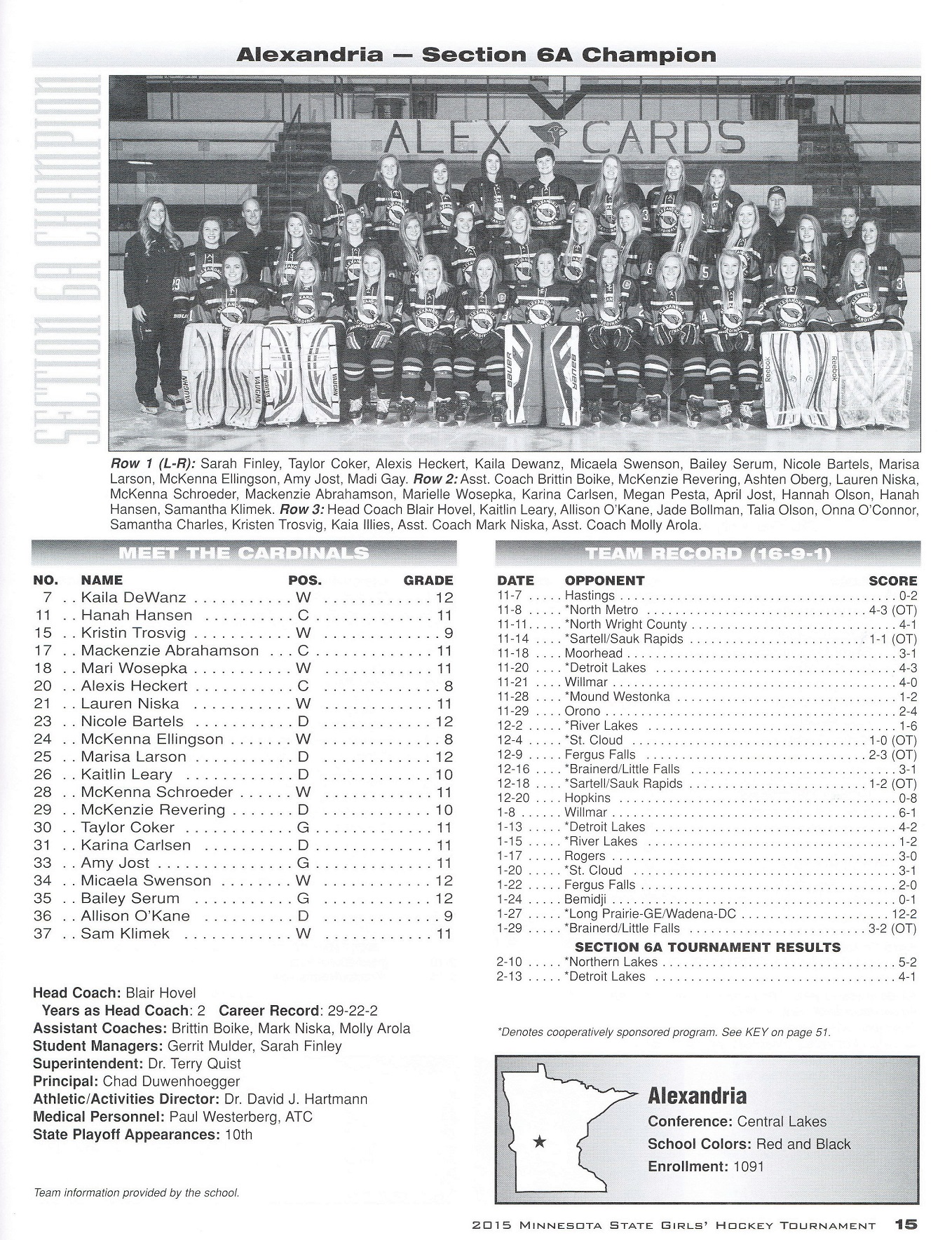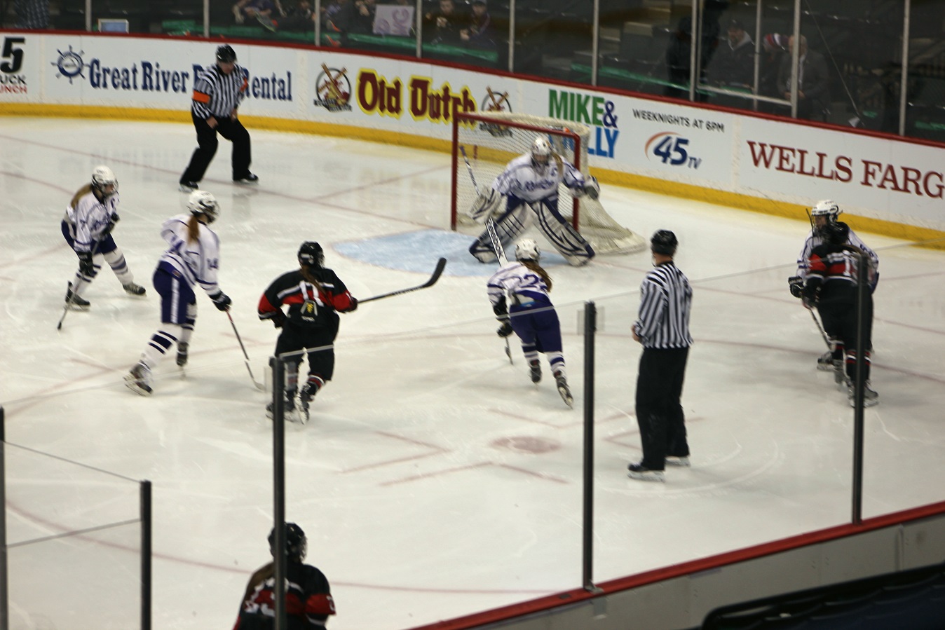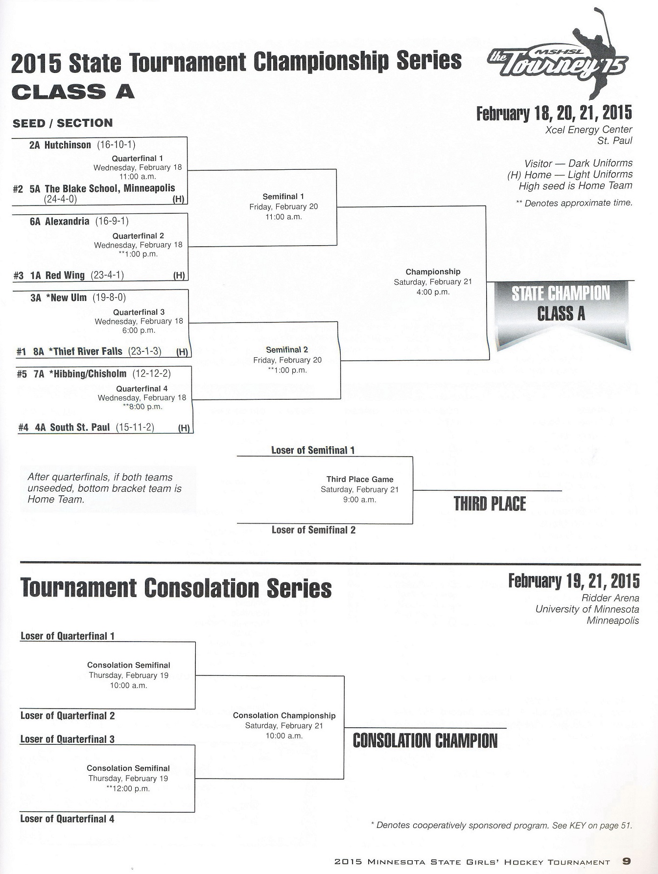 [They seed five of the eight teams in each class for bracketing purposes. We thought we had a shot at a seed because of some upsets in other sections. We didn’t get one. In hindsight, we should have been no worse than the 4th seed, maybe the 3rd. Stuff happens. But we drew #3-seed Red Wing in the first round. We thought that was a good draw for us. The Wingers had a 24-4 record, but we thought we had a good shot against them. And we did. The Hanah Hansen (11) line here.]