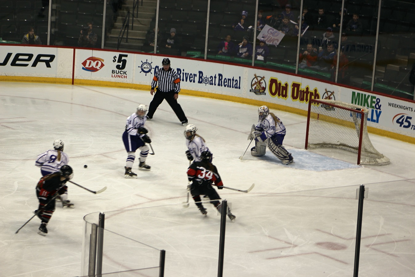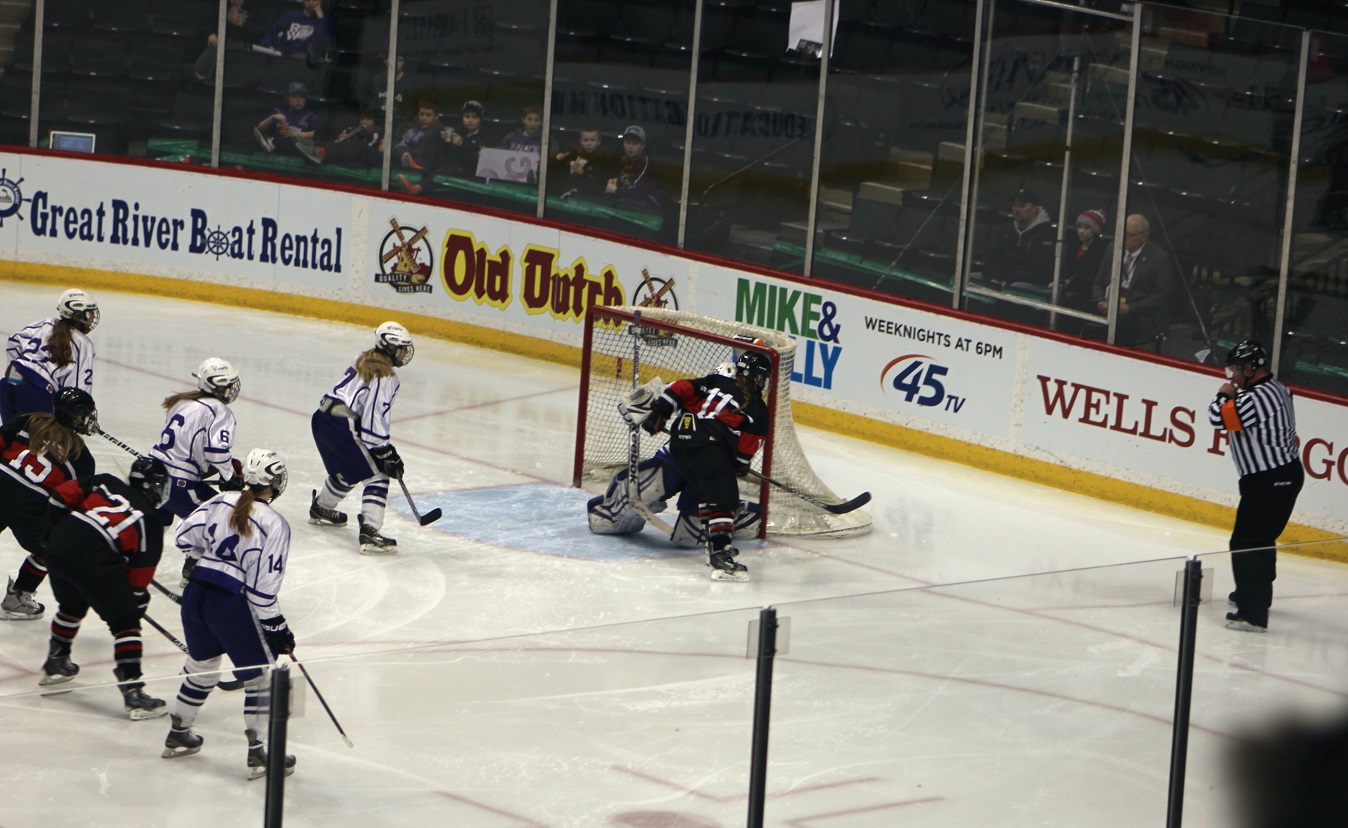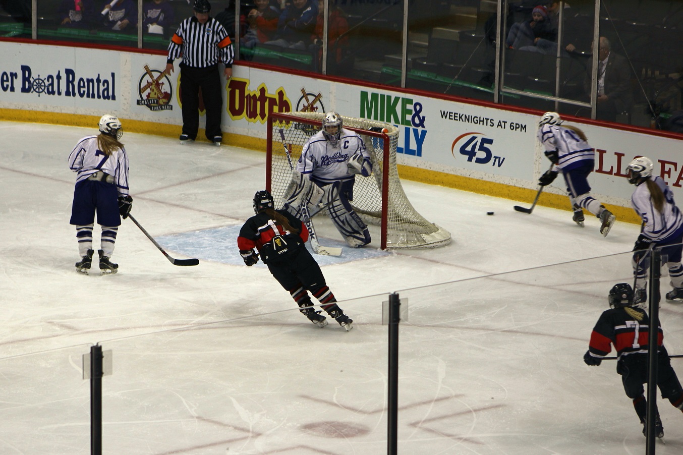 [The Winger goalie lost her helmet flopping in an attempt to block that shot. Moments later, McKenna had a point blank backhand shot that the goalie did make a nice save on.]