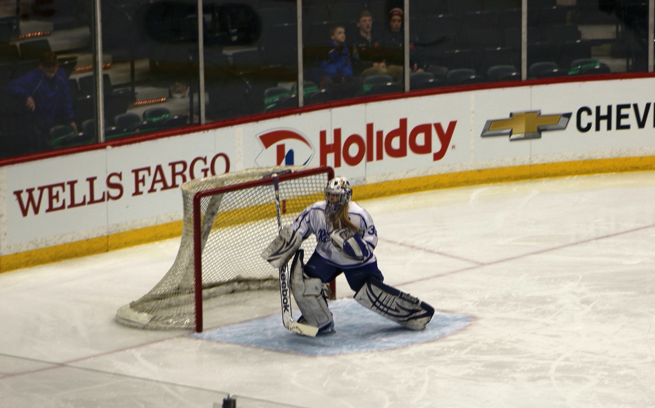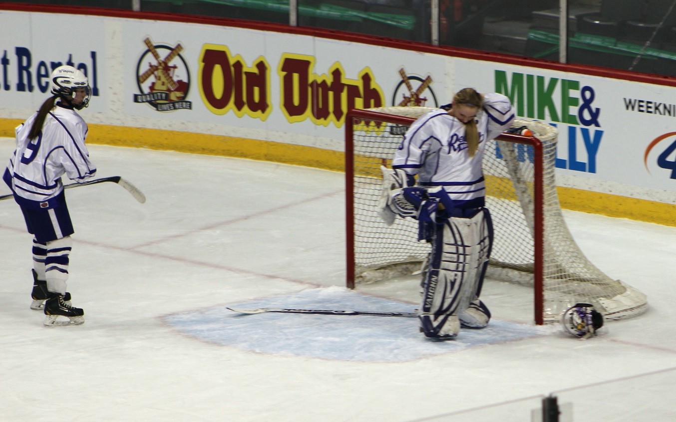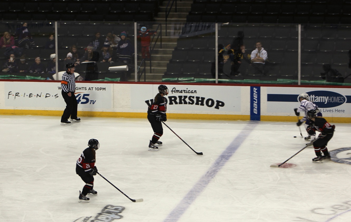 [The Winger goalie lost her helmet flopping in an attempt to block that shot. Moments later, McKenna had a point blank backhand shot that the goalie did make a nice save on.]