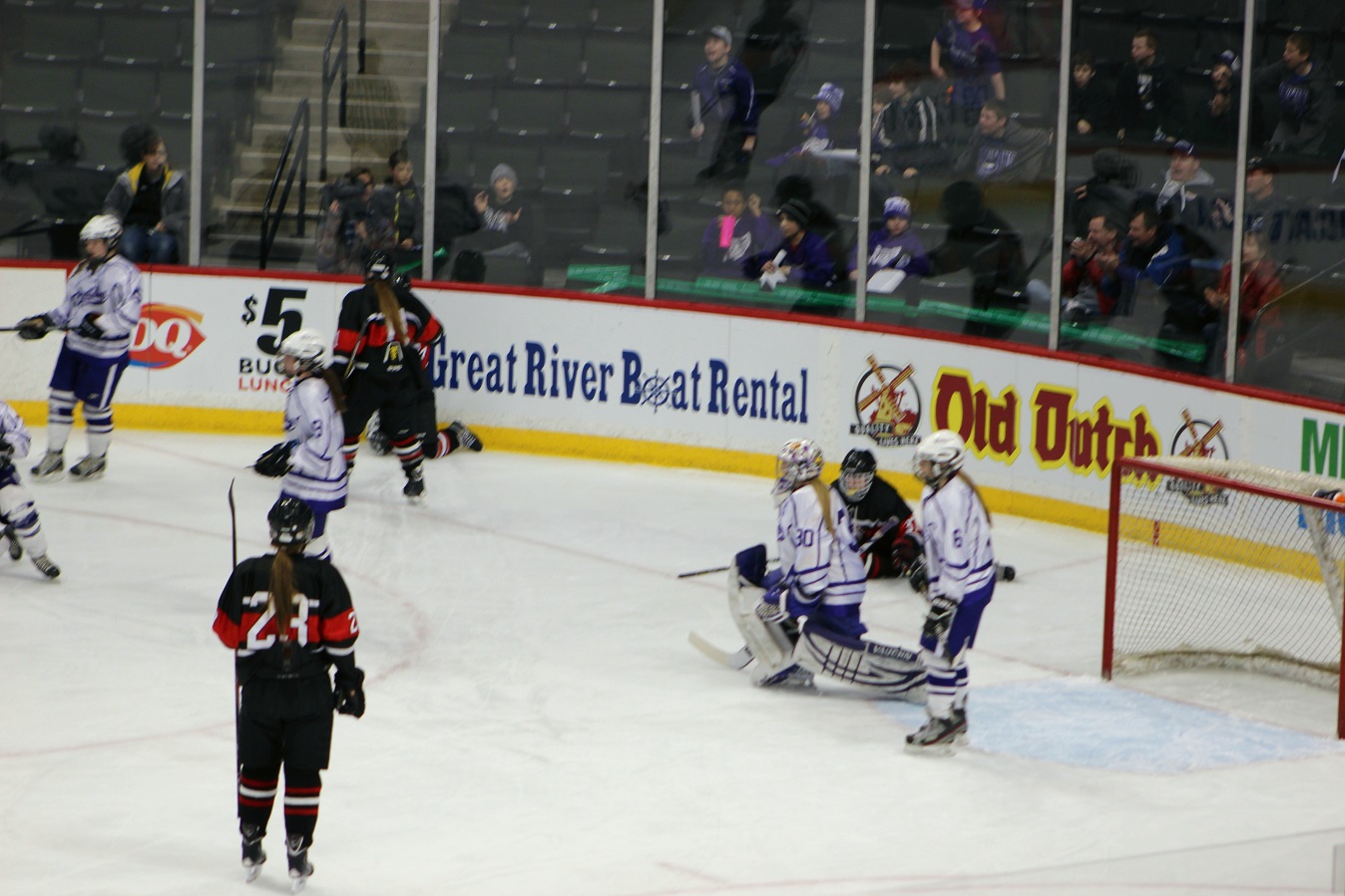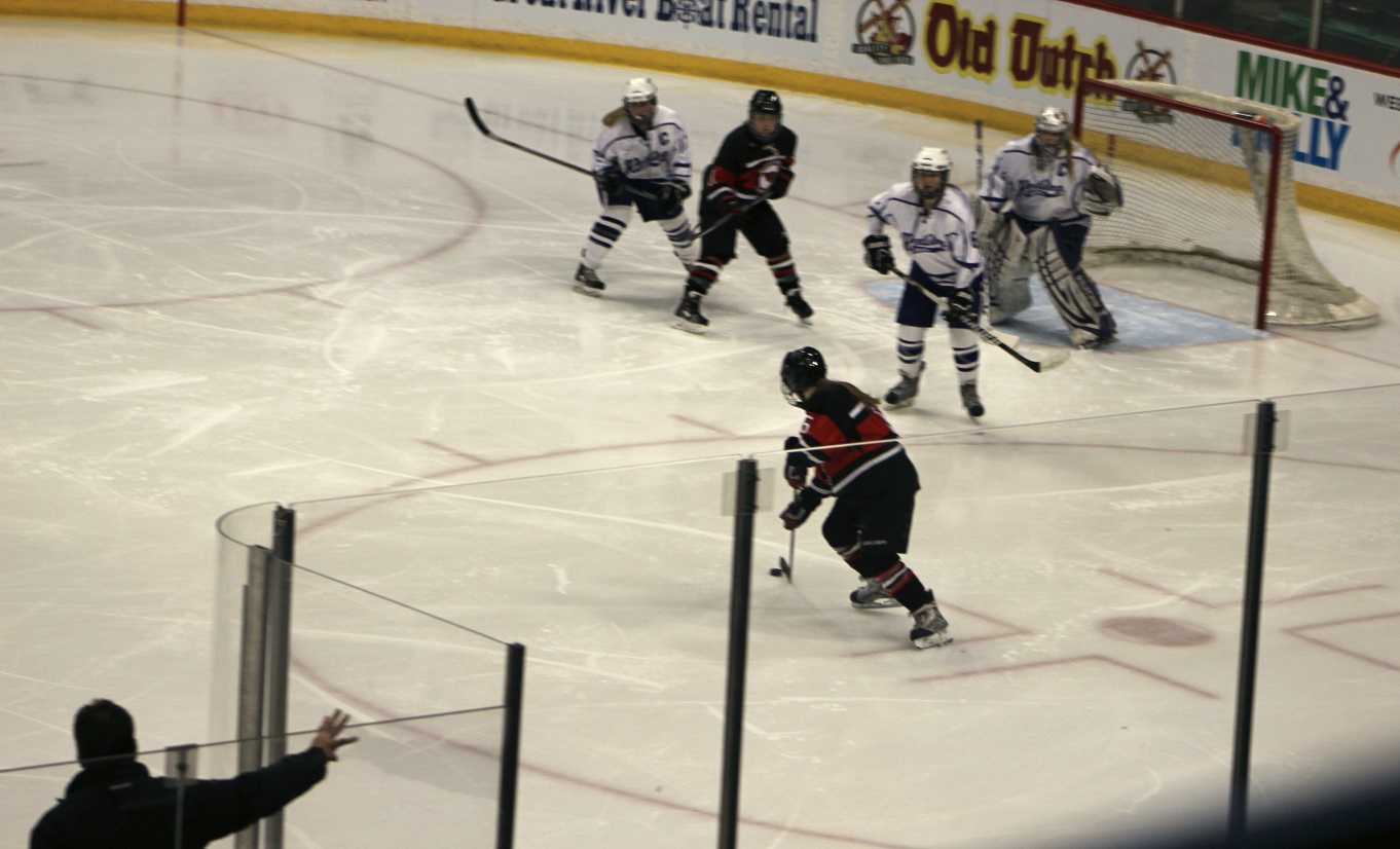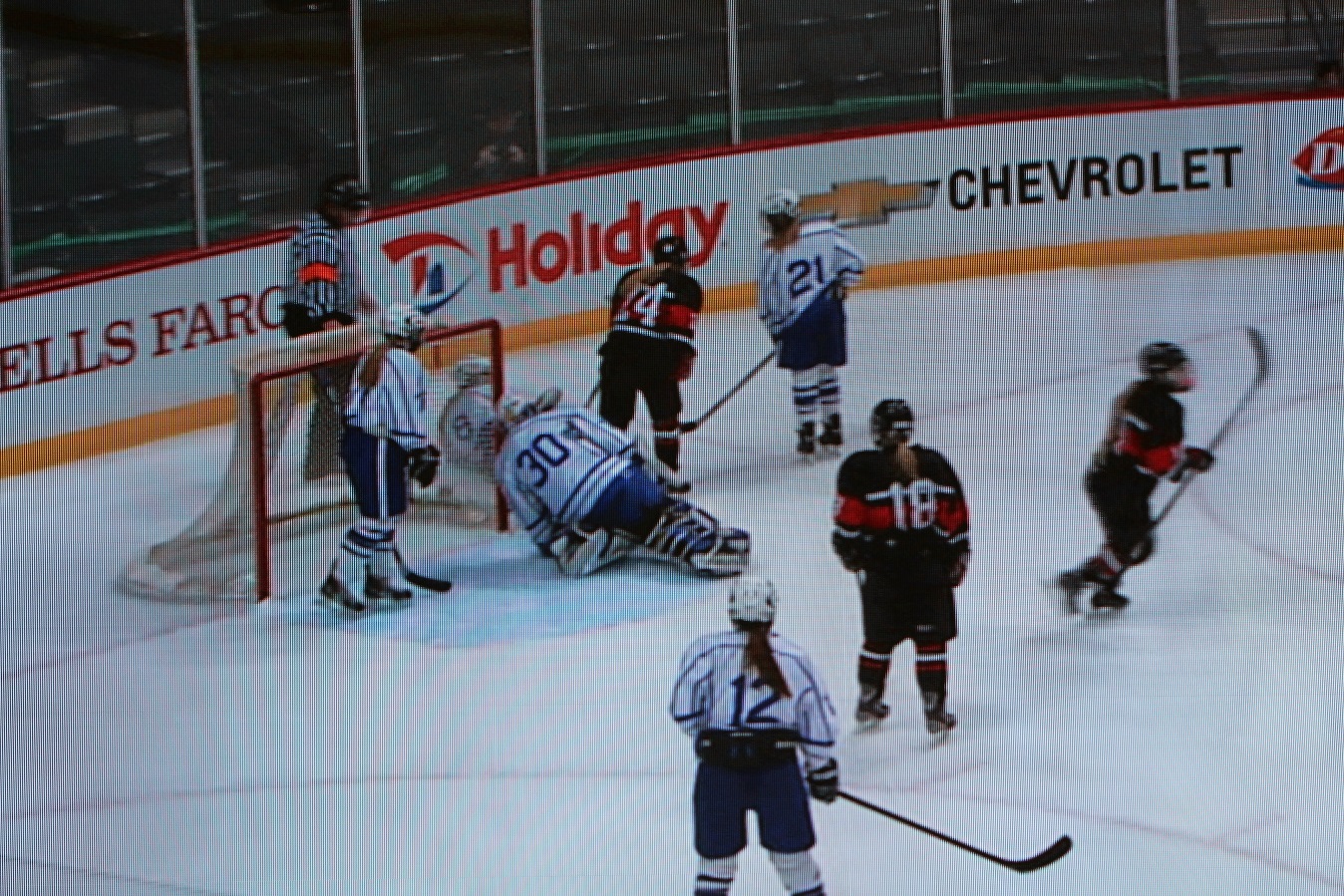 [The play that may have changed the whole outcome of the game. McKenna launched a nice wrist shot that hit the right goal post, slid all the way across the goal mouth and hit the left goal post, and popped out. They ran it on the big screen from above. If that had crossed the line, we would have had the first goal and then . . . who knows?]