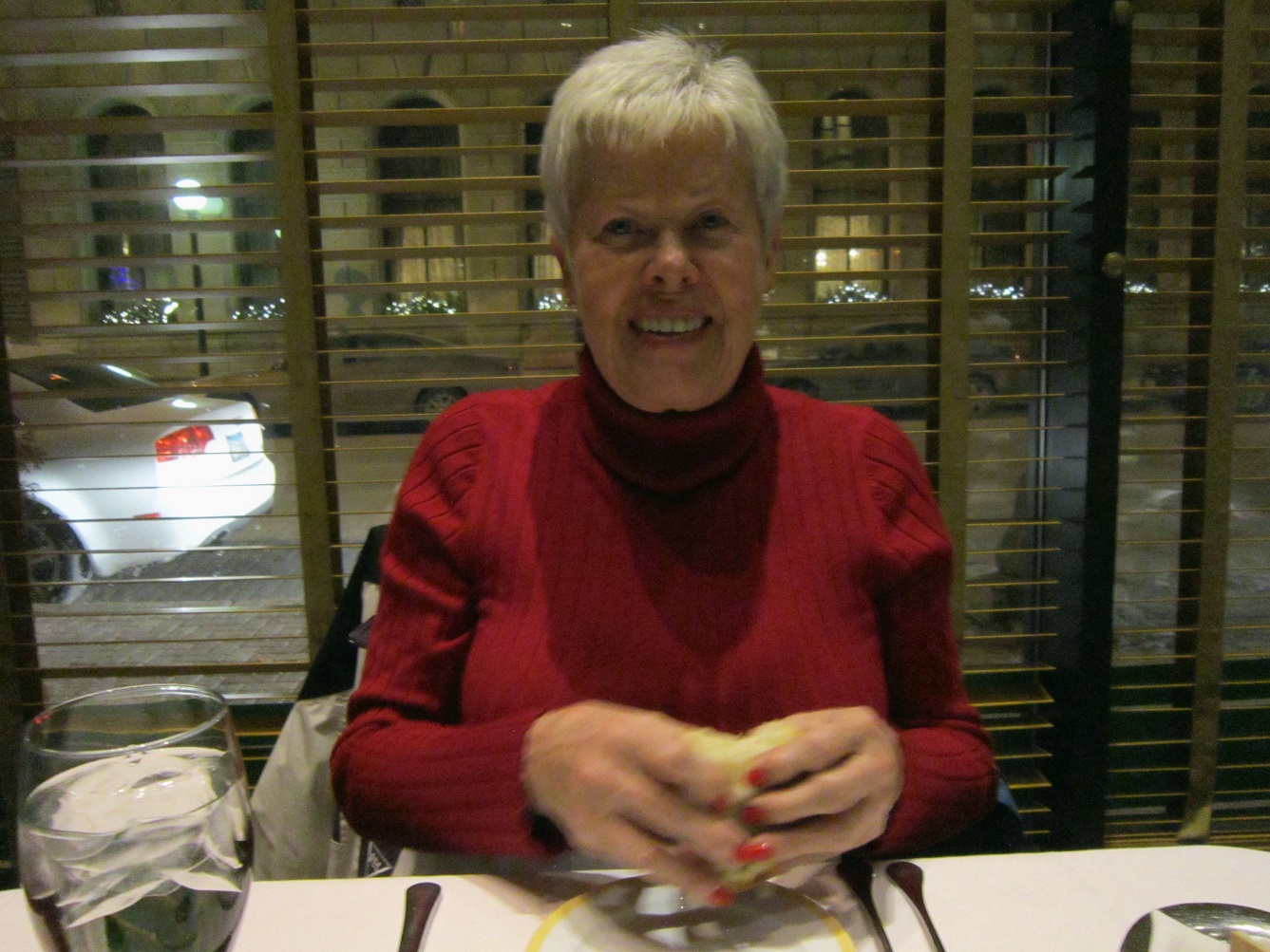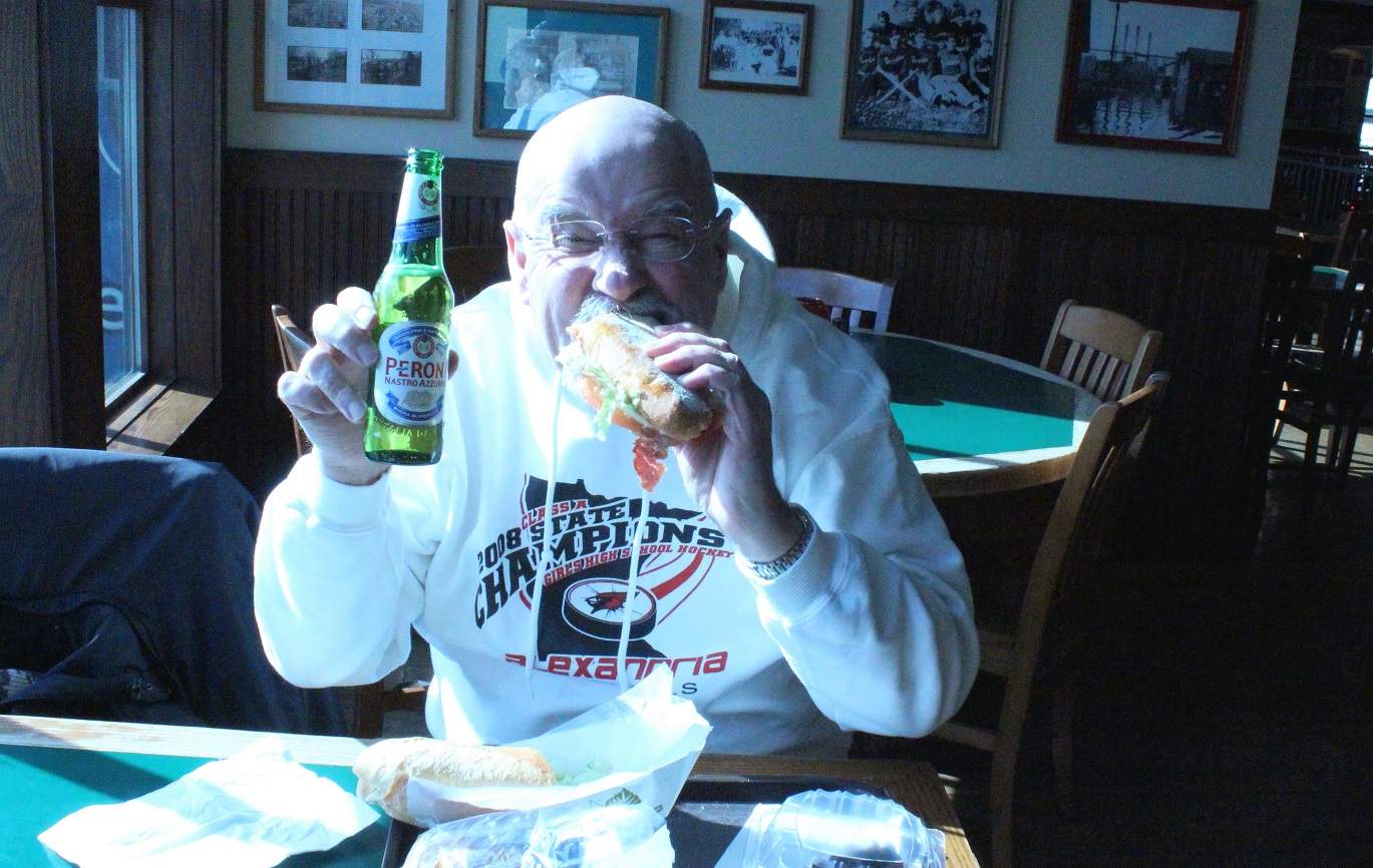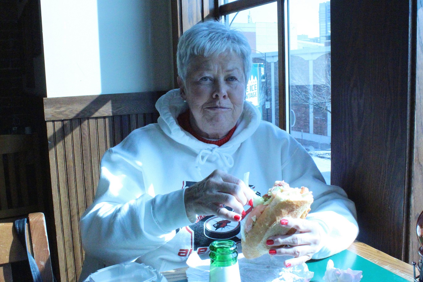 [The Sunday before the tournament, the Super decided it would be a good idea to redeem one of the products she purchased at the girls’ hockey fund raiser – a gift certificate to D Michael B’s. Yes, “Weakie,” that is the meat loaf, and I got four more meals out of it at home! And I discovered that as I have aged, my arms are now too short for a food-included “selfie.”]