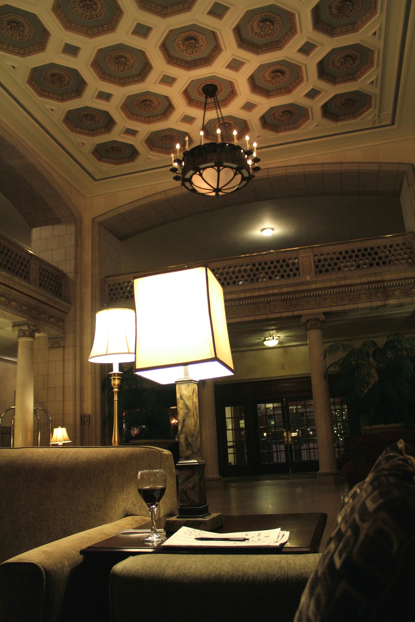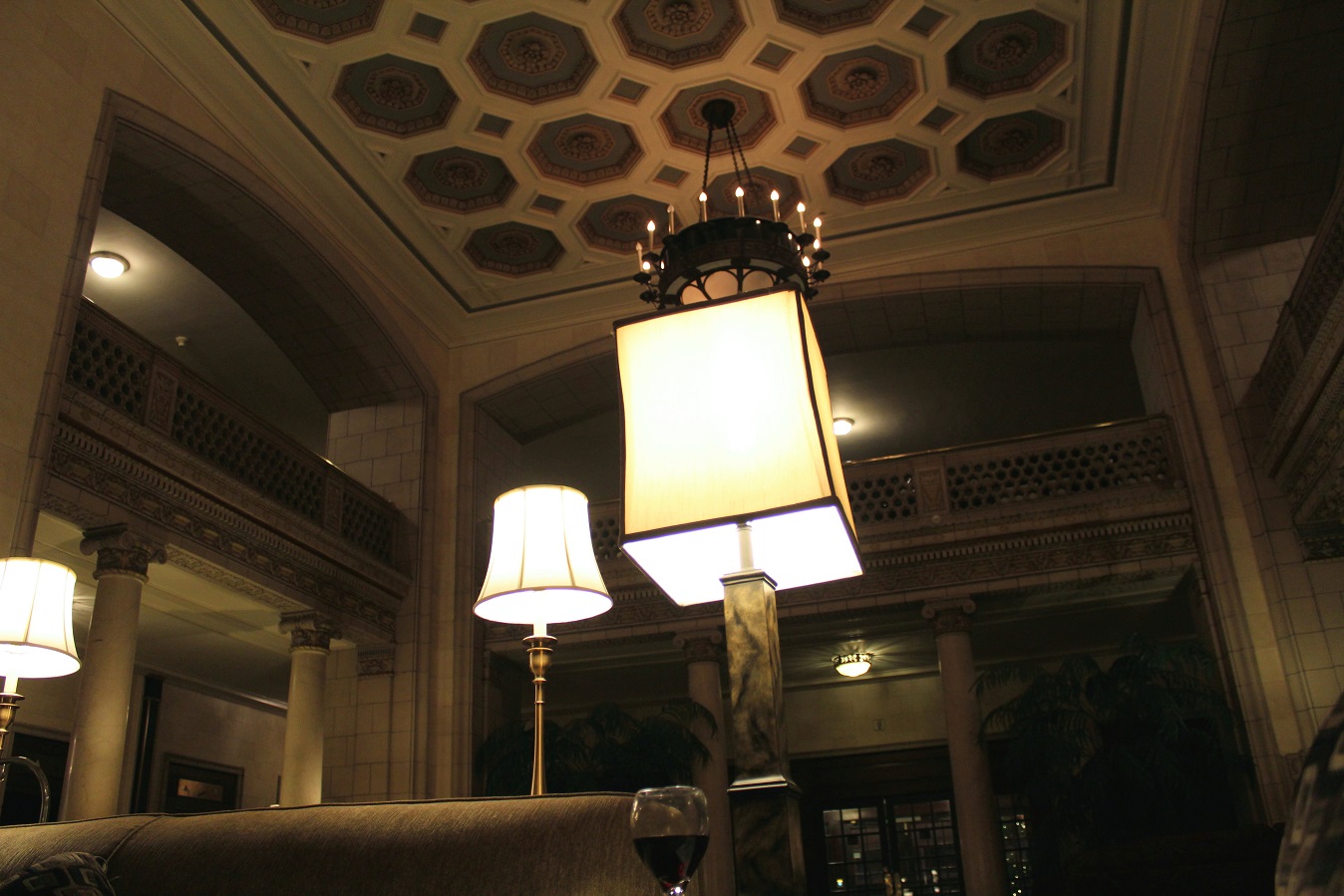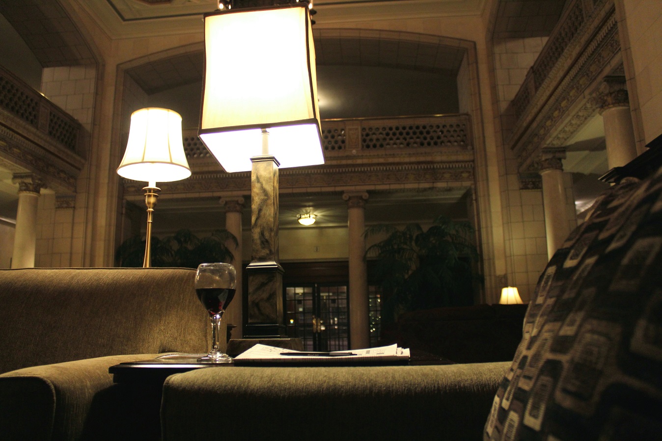 [We took a glass of wine down to the lobby to drown our sorrows. It’s the kind of place where you expect to see gray-haired gentlemen in tuxedos sitting around in leather chairs with brandy snifters and fine Cuban cigars. Last year, we unexpectedly ran into Tami and Kim Bredeson from Carlos Creek Winery here; this year we unexpectedly ran into Sara Schwabe of Theatre L’Homme Dieu fame here. Amazing.]