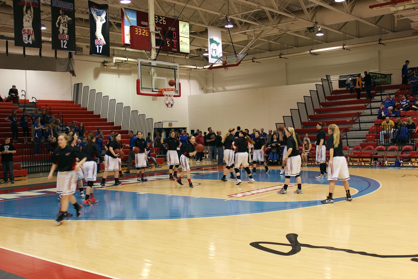 [Since the supervisor did such a great job on the first picture, we’ll feature her efforts here as well. Upon arrival at the St. John’s University gym, our Cards in warm-up.]