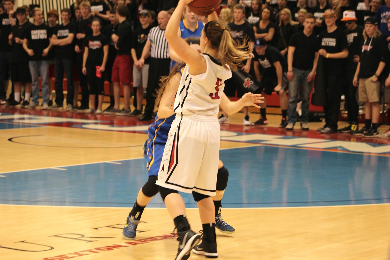 Here’s a video of the game’s commencement. You will see over 5 minutes of action during which the only points scored were two free throws by Macy at the end. In Kendall’s defense (yes, her first 3-point attempt here was a bit awry), her next 3-point attempt from about 5-feet beyond the line drew nothing but net. But you will also get an idea about why our Cards led all of class AAA in fewest points allowed this year! Love that Cardinal ‘D’!
