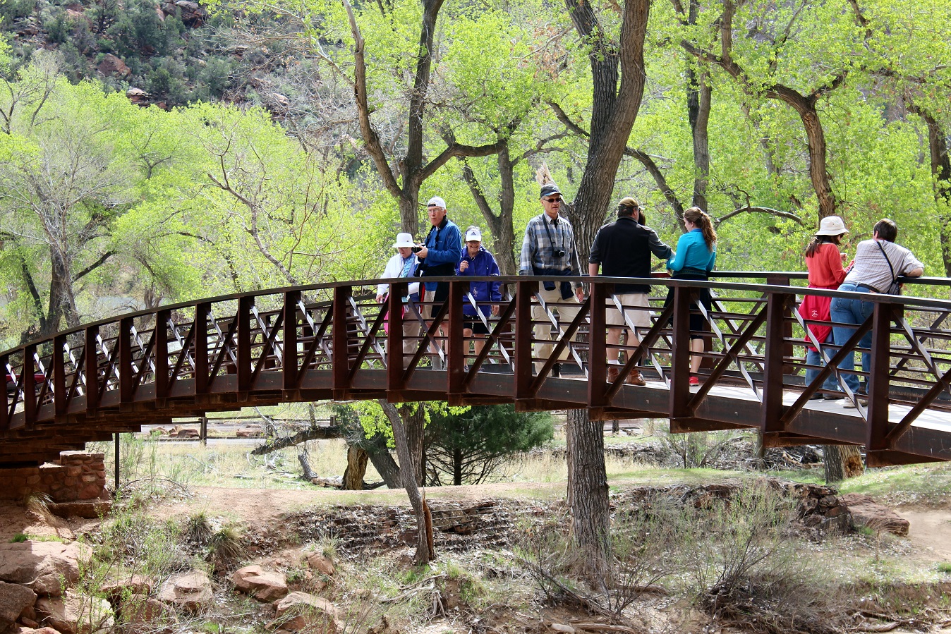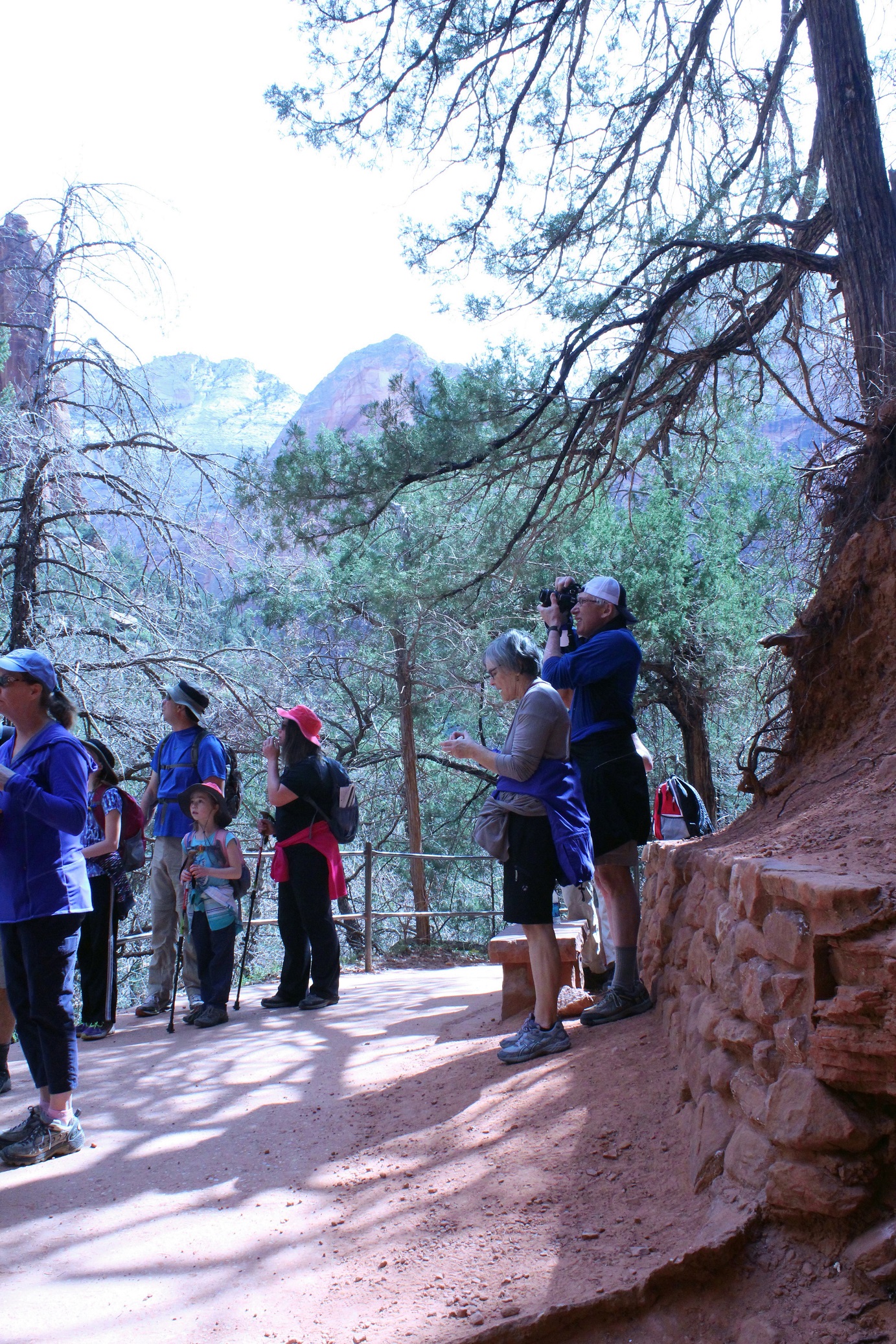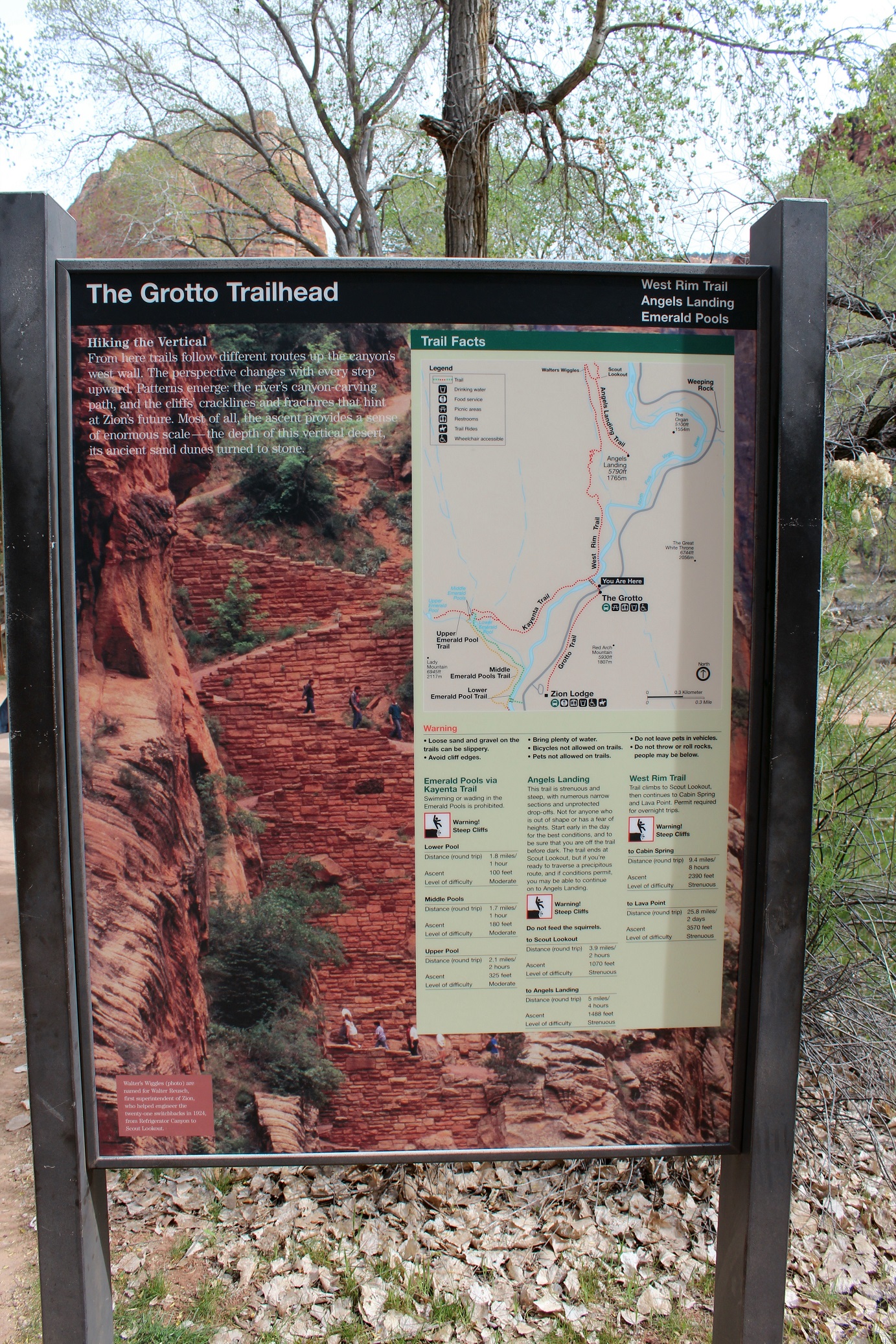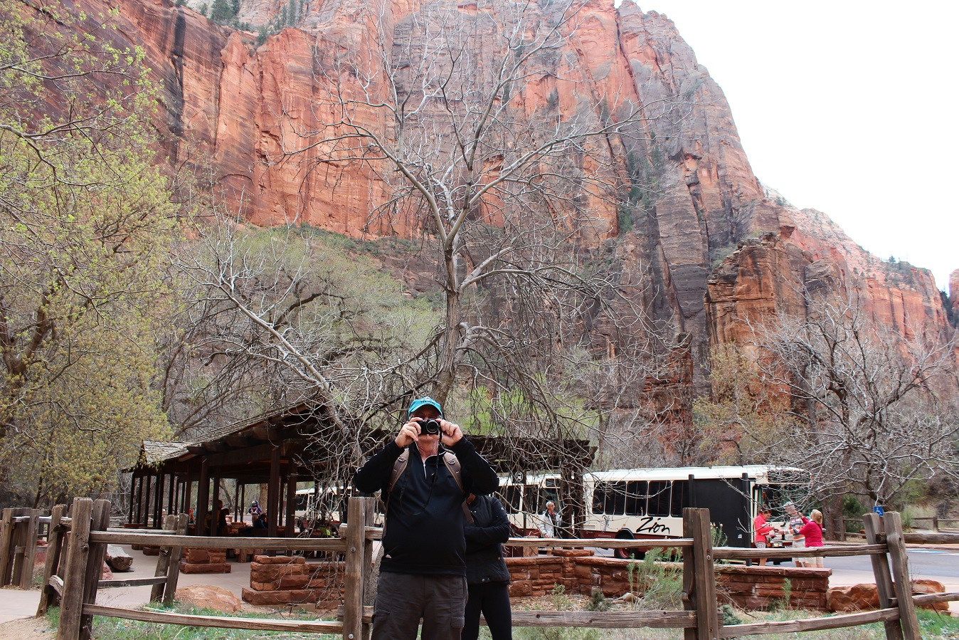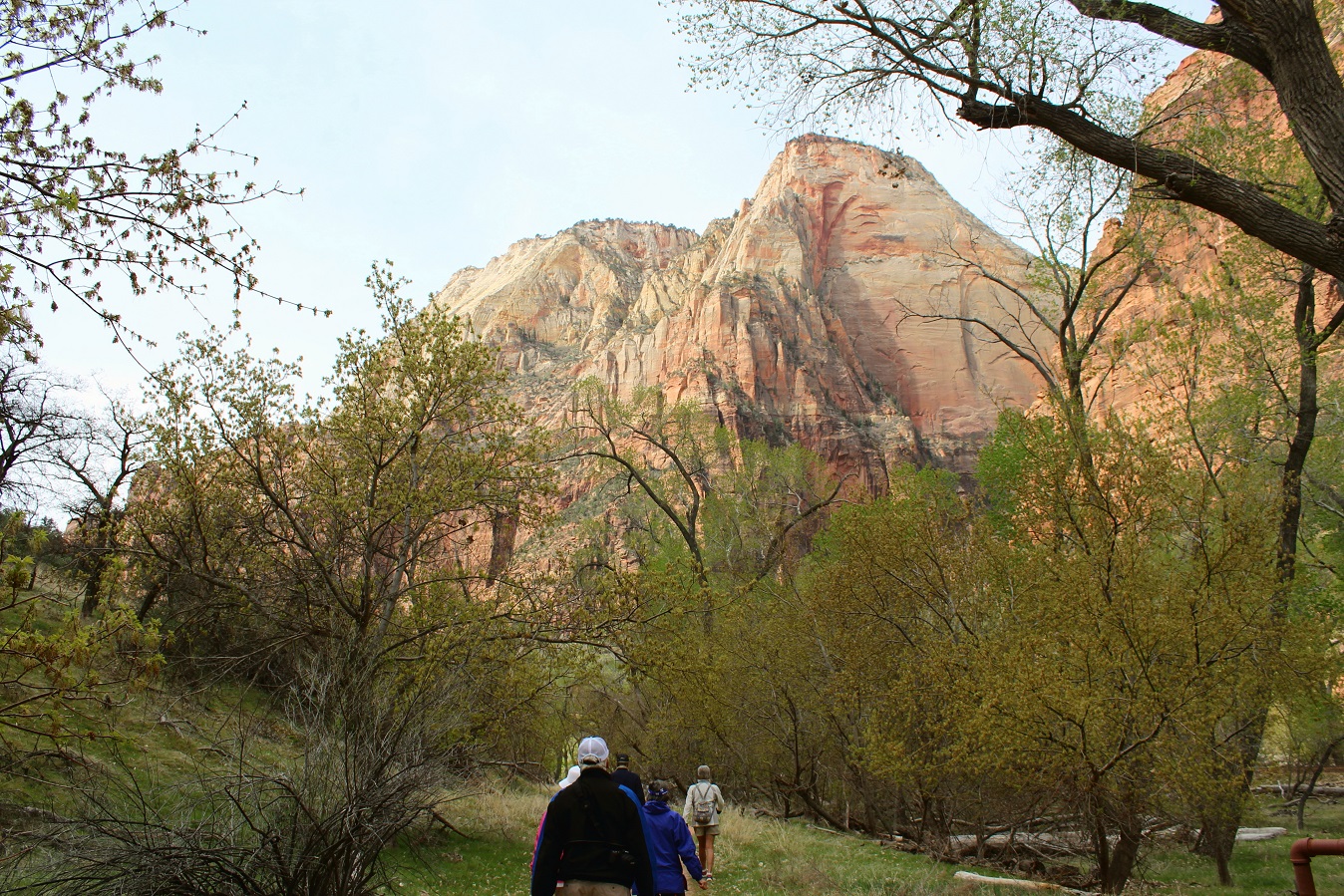 [Back in current time, the group is on the move from the Grotto (eyeballing Angels Landing) to Zion Lodge.]