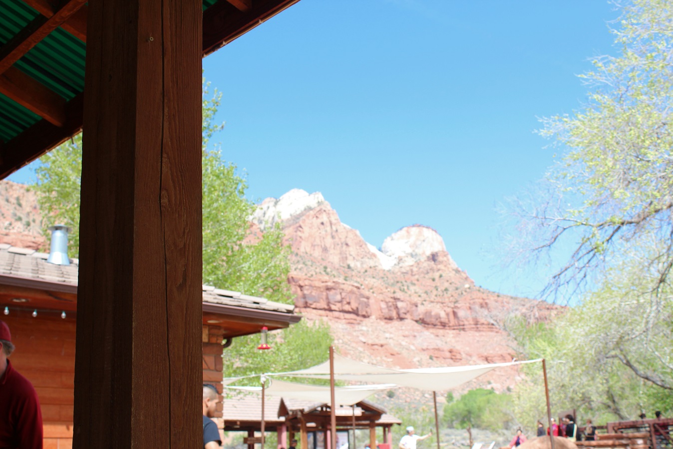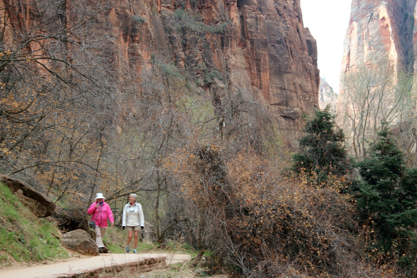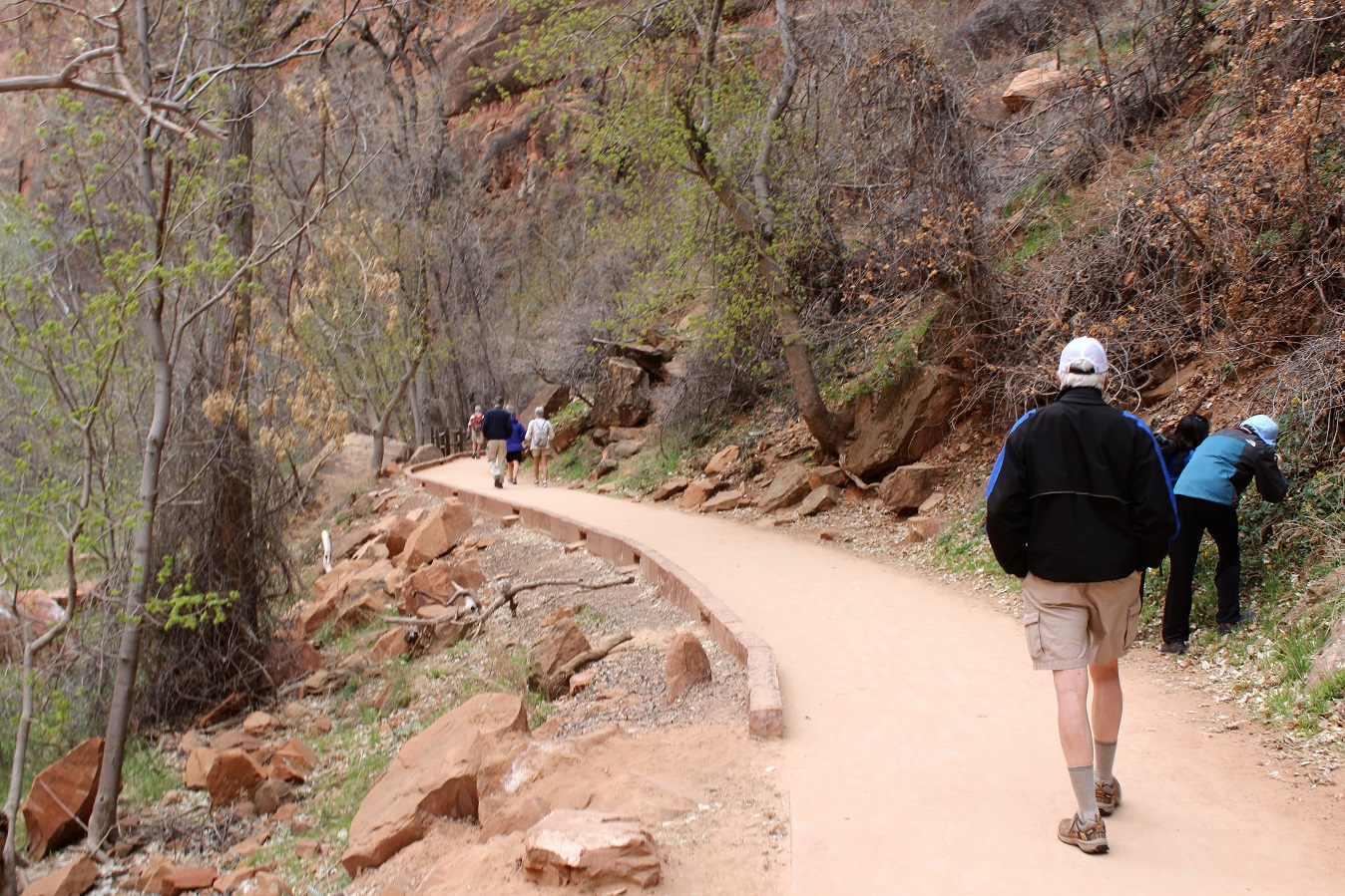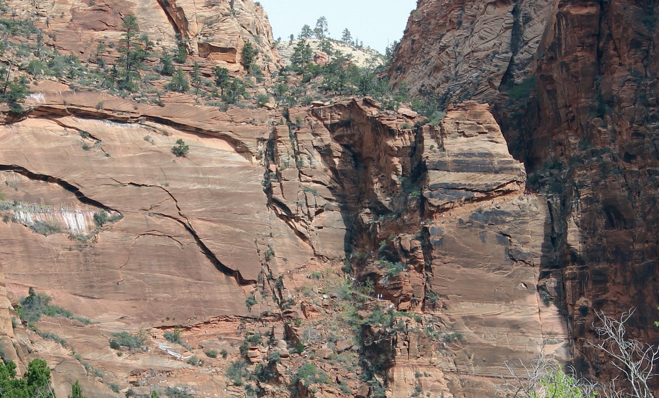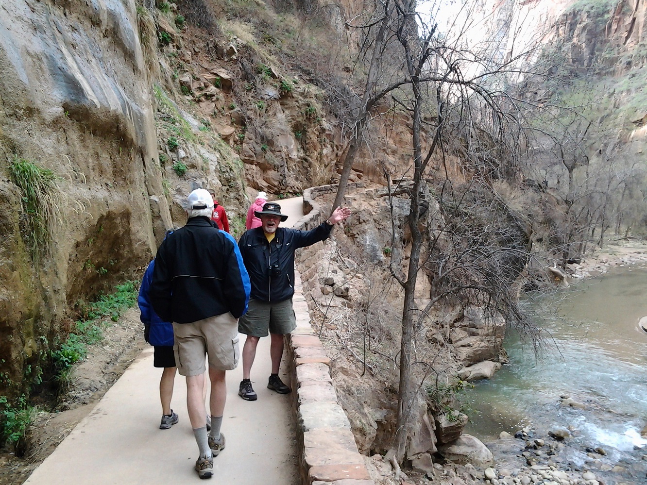 [Back in current time, the group is on the move from the Grotto (eyeballing Angels Landing) to Zion Lodge.]
