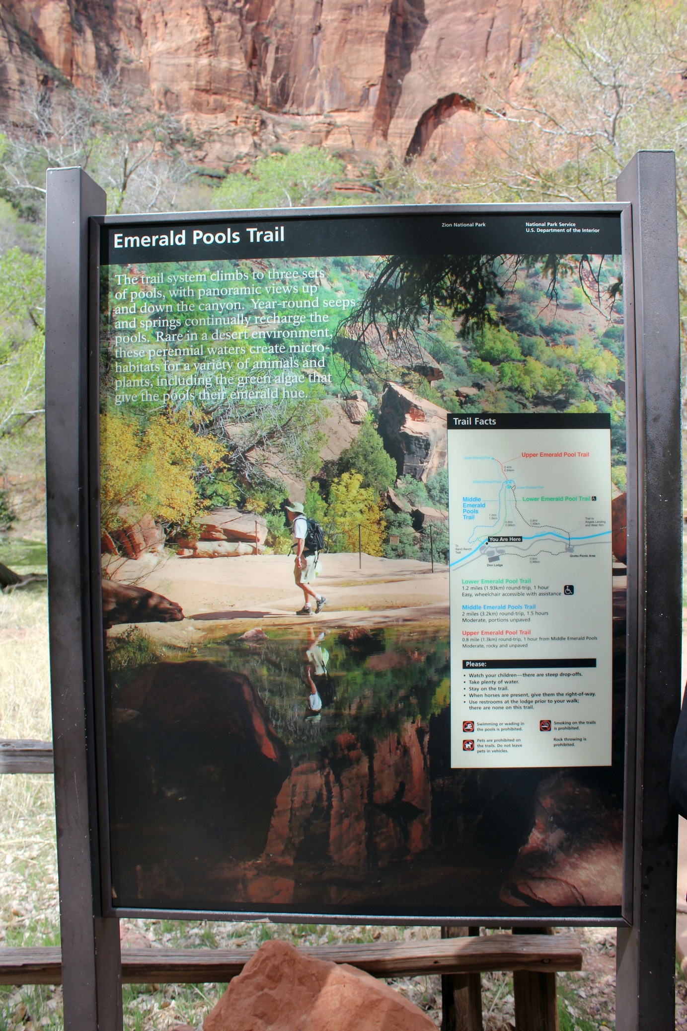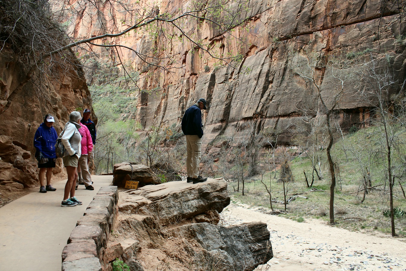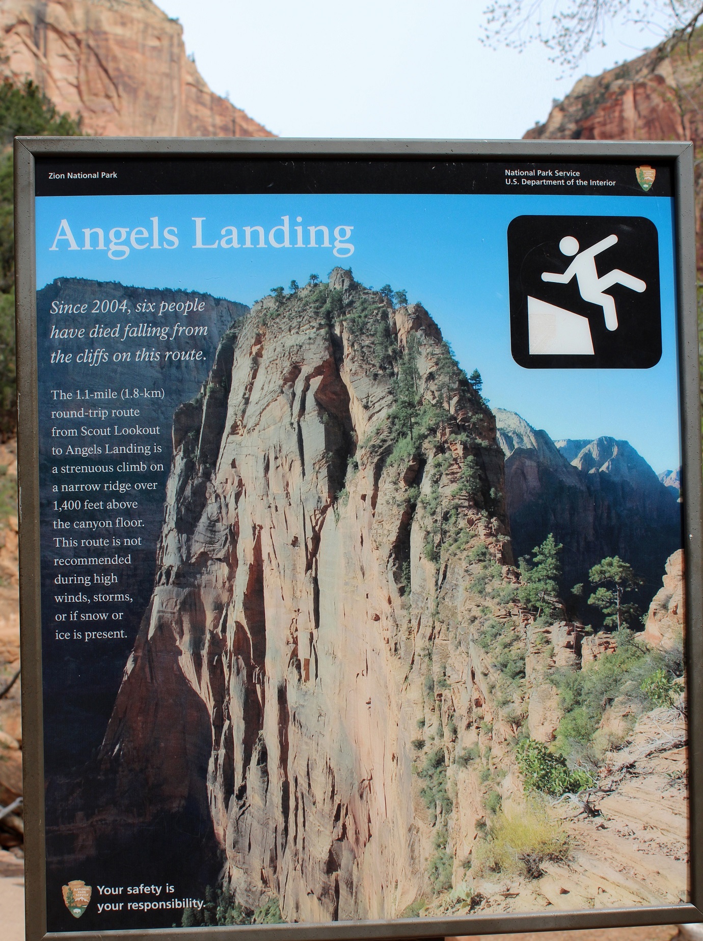 We visited Zion National Park twice on this trip, during which time I regaled our captive audience about the time I climbed Angels Landing. It was exactly 32 years ago (pre-Super), and my traveling companion in those days was Basketball Dan. It’s a strenuous, 5-mile, 5-hour uphill hike, and now there is a sign at its commencement noting that 6 people have died from falls on the trail in the last decade! Oy!
