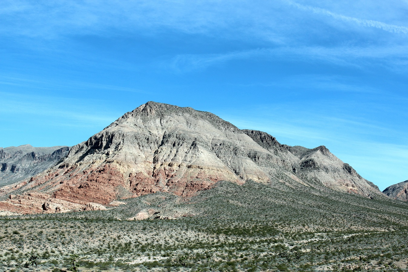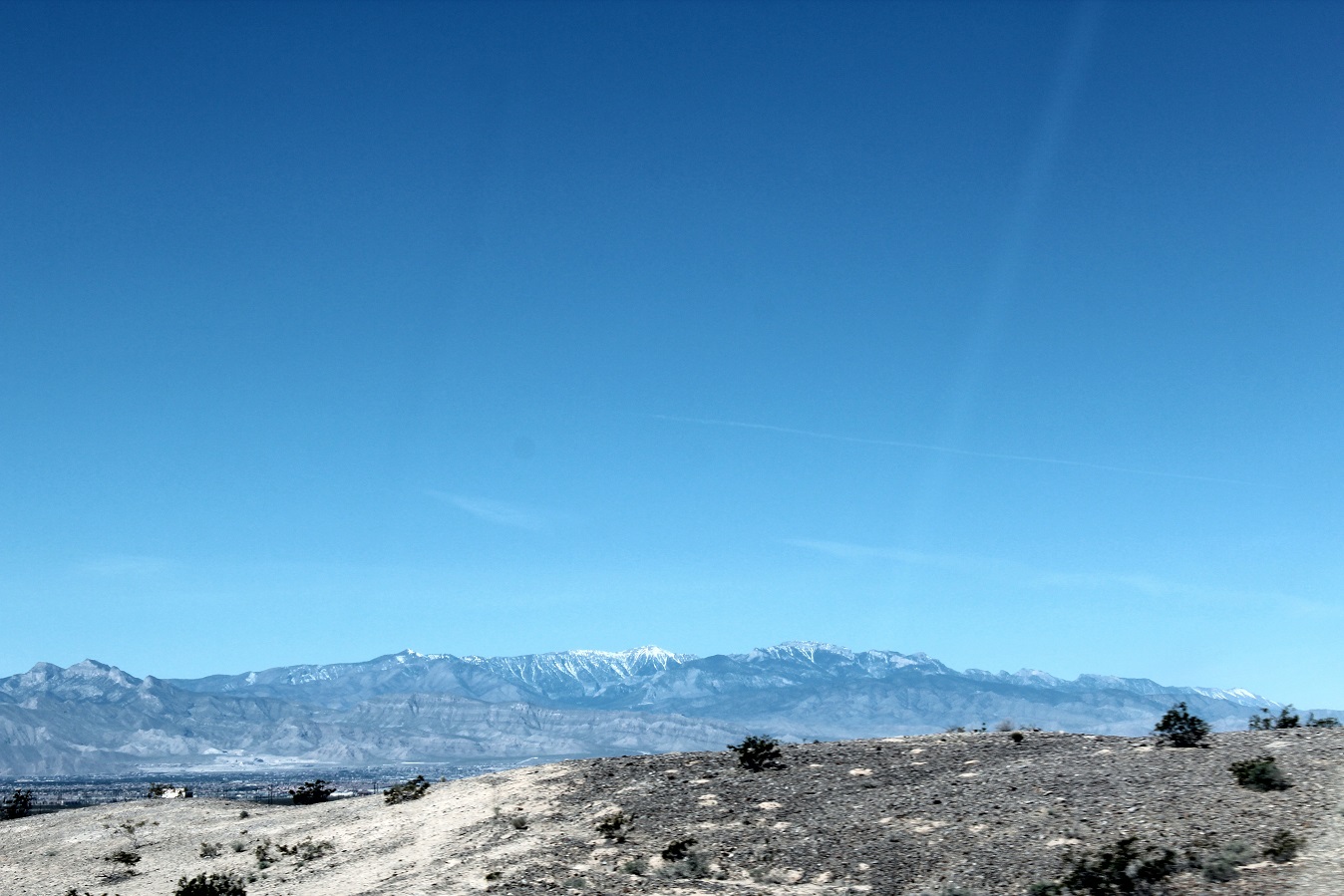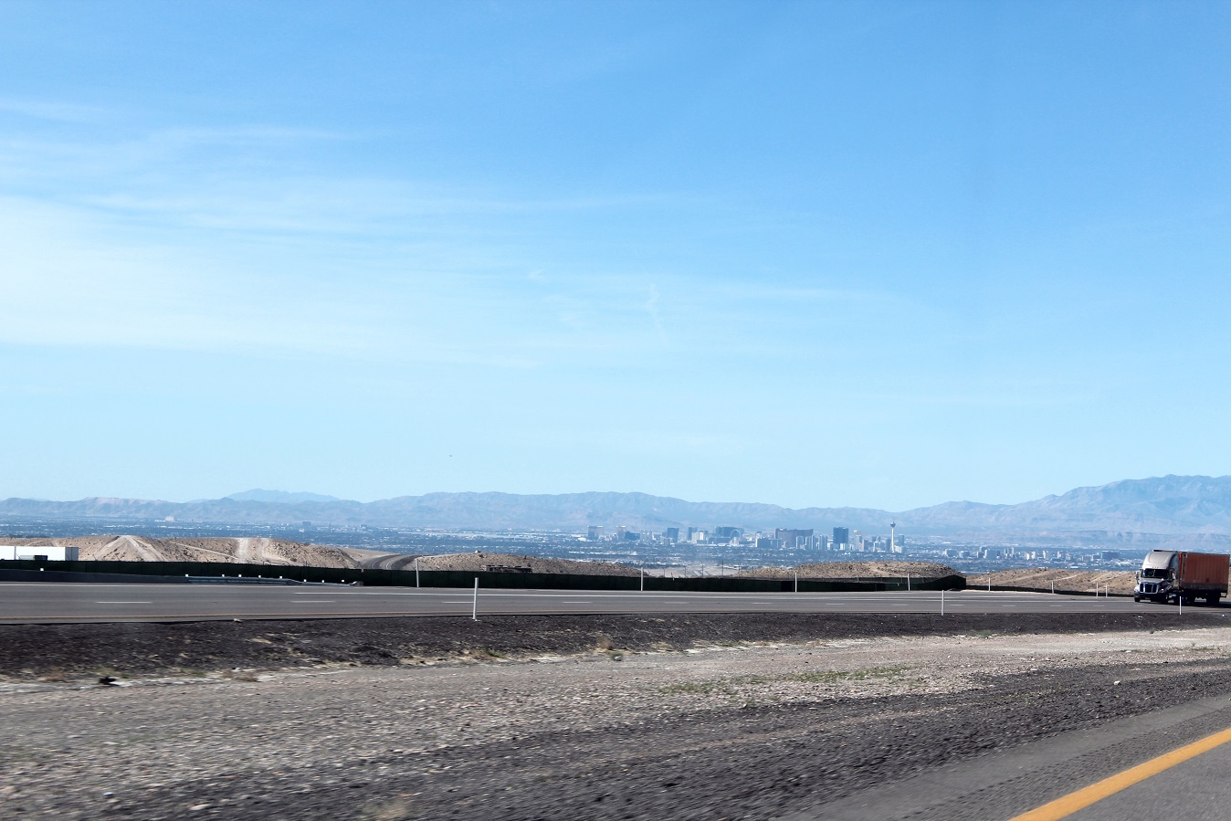 [Then we came out of the canyon and soon were able to see Vegas in the distance and the Sheep Mountains.]