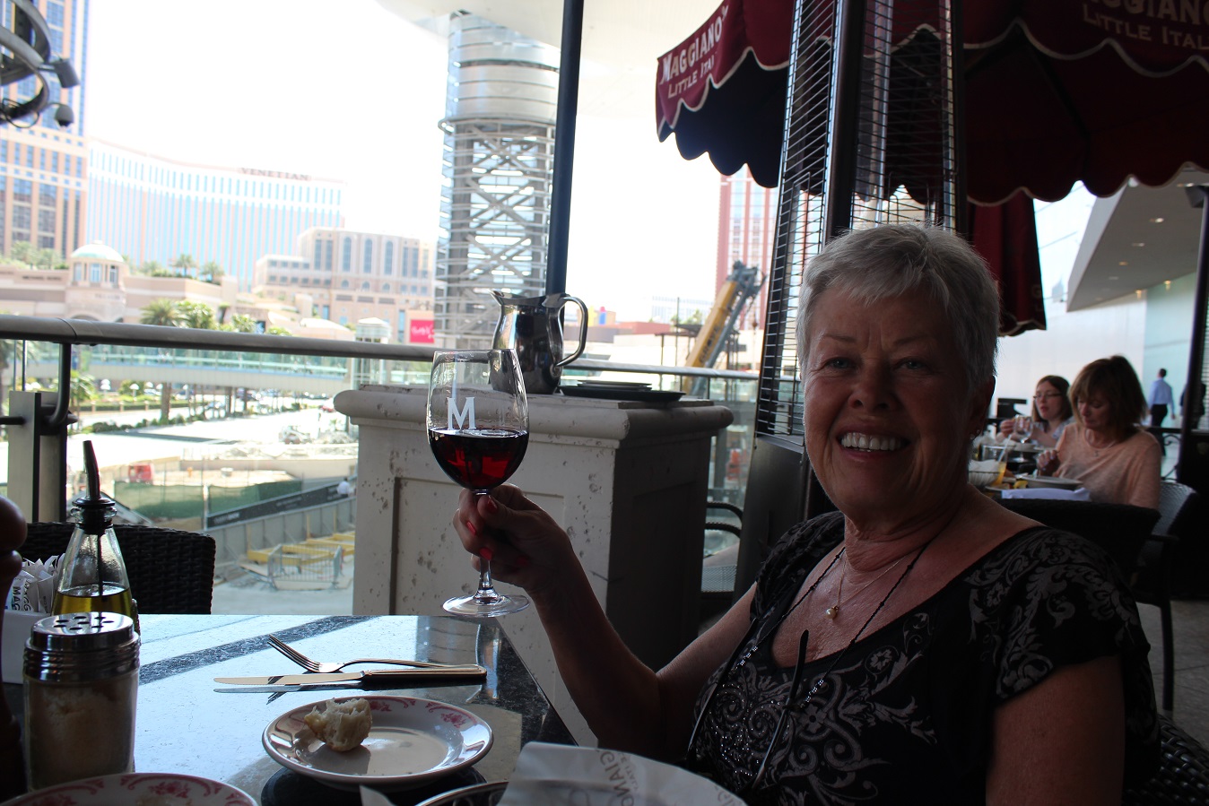 [And that’s where we delightfully discovered a Maggiano’s, the No. 1 Italian chain restaurant, out on the mall deck under the “flying saucer,” and with a view of the Venetian. A little pizza, a little beer, and we were good to go! 🙂 ]