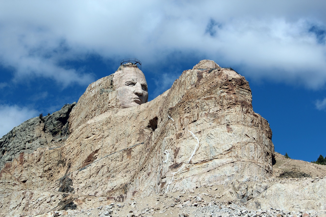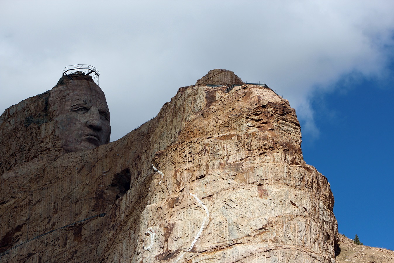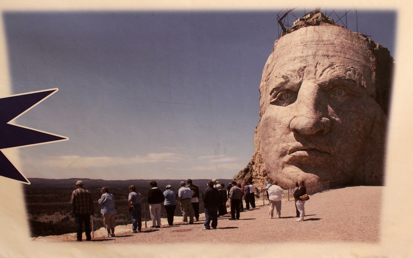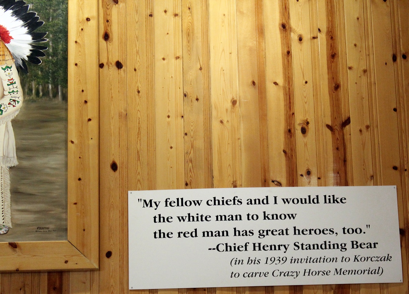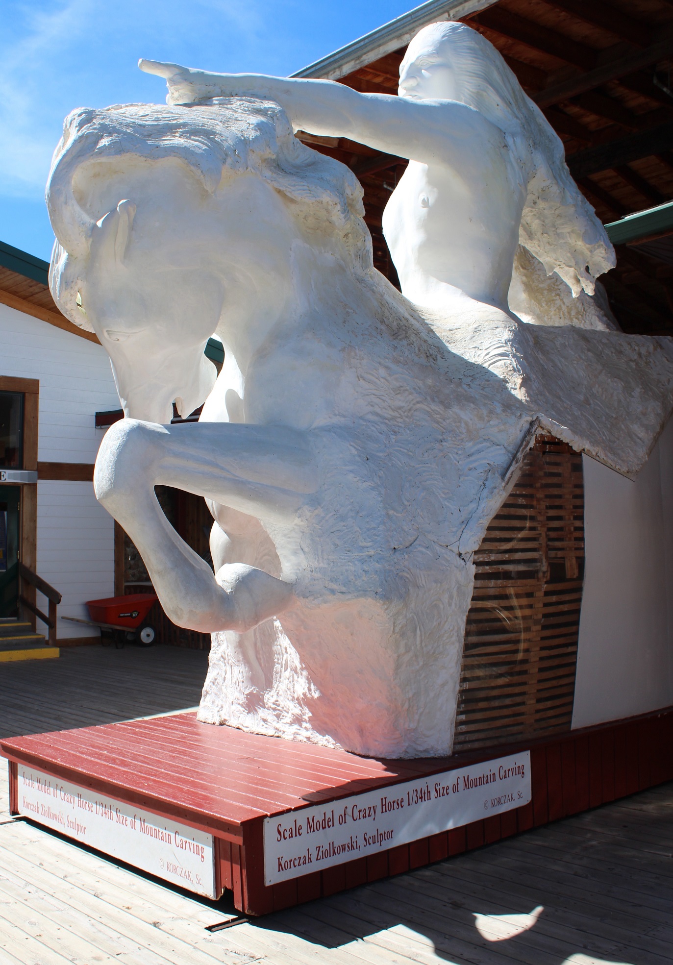 [This was one of the more amazing stories . . . Korczak started the sculpture all by himself in 1948. It was more than 700 stairs up to his work area, carrying about 50 pounds of equipment with him. He ultimately realized he needed a compressor, bought this one used (a Buda, as I recall), and he would crank start it and then begin his climb. But it was not reliable and often conked out – he would have to go back down to re-start it. One day he did that NINE times! I can’t even imagine what kind of shape he was in, and he was not a young man. So, Crazy Horse has been under construction for 67 years, most of that time span by Korczak himself. More workers of late have made much more progress in the last 15 years than Korczak did in the first 50 years. Best estimates are that it is still at least 20 – 30 years from completion. Guess I won’t see it.]