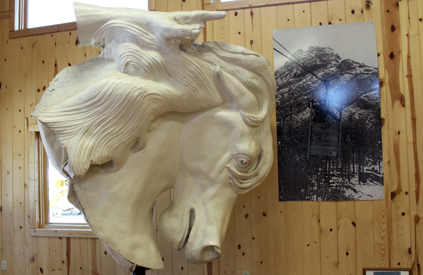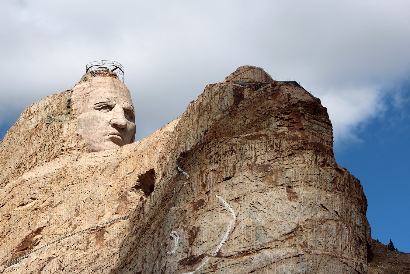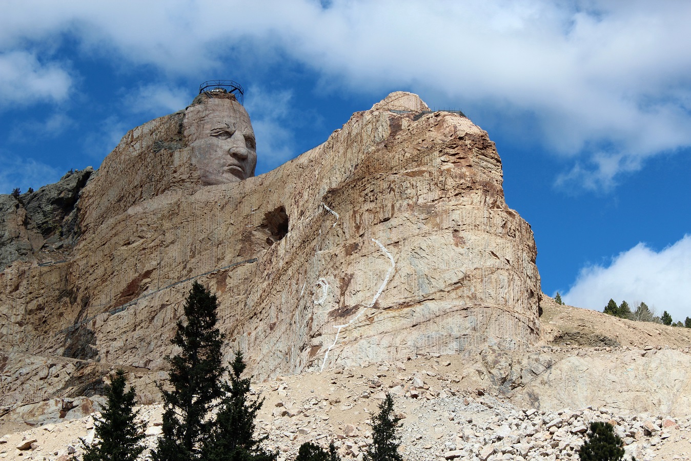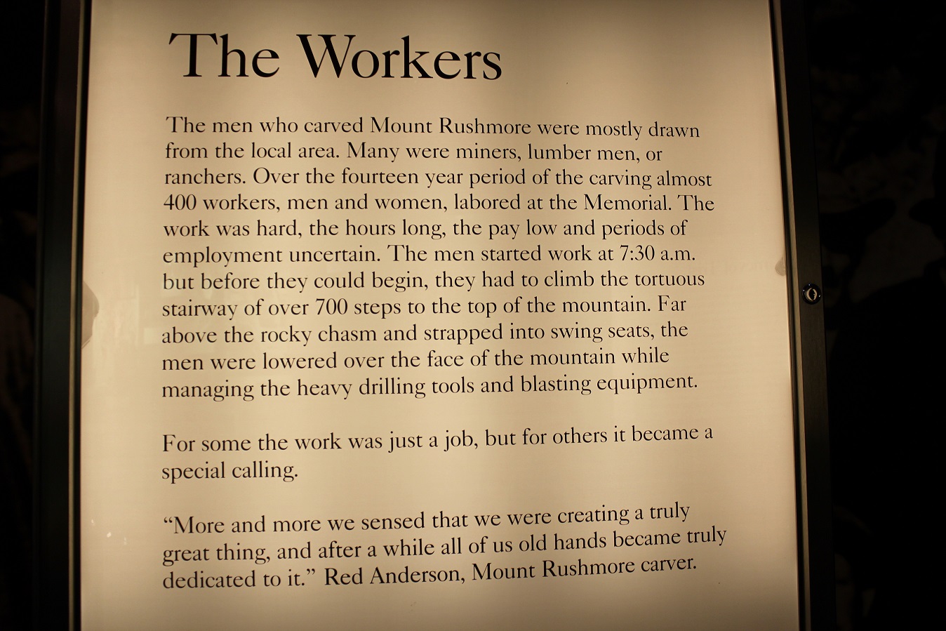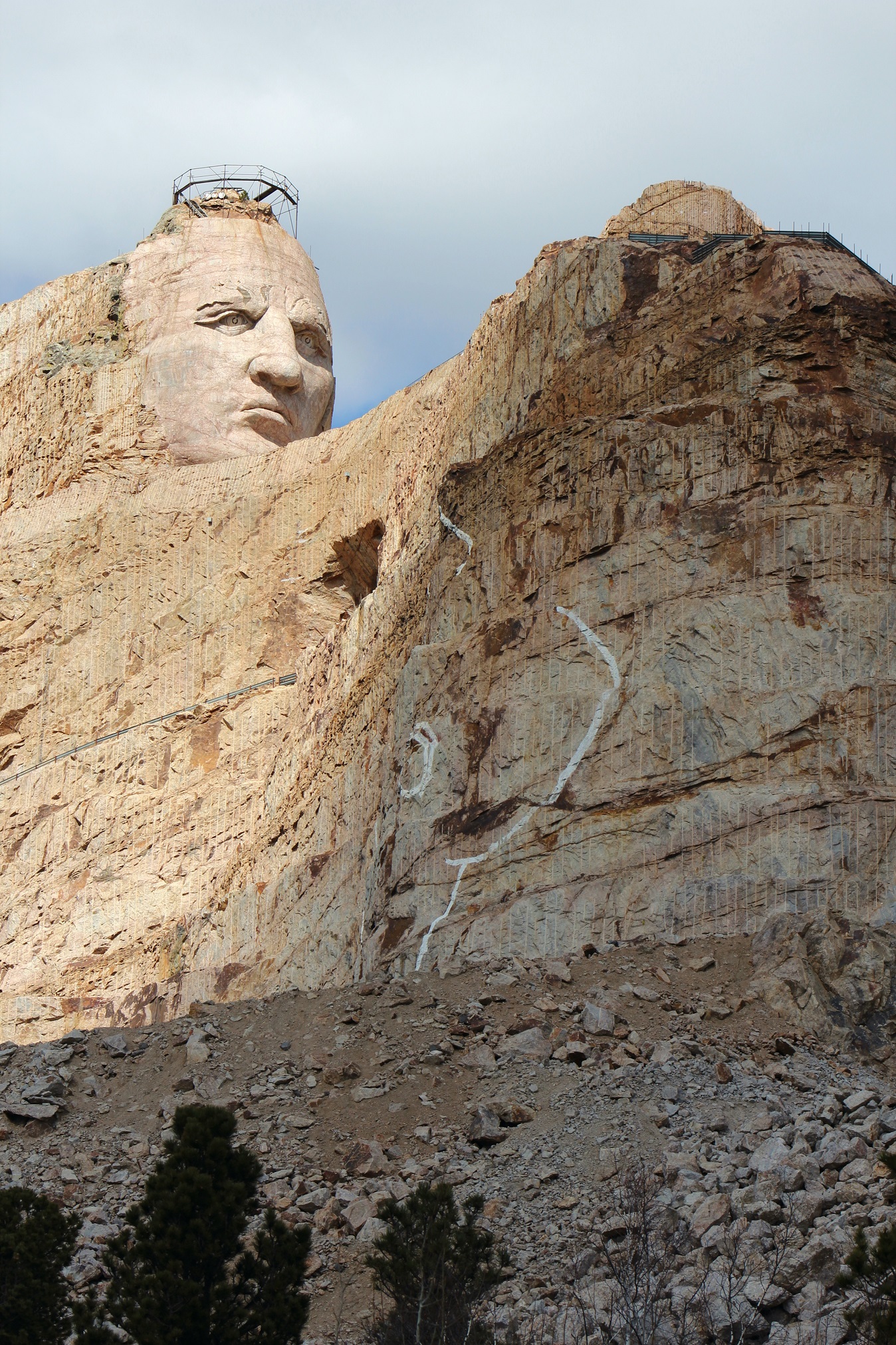 [This was one of the more amazing stories . . . Korczak started the sculpture all by himself in 1948. It was more than 700 stairs up to his work area, carrying about 50 pounds of equipment with him. He ultimately realized he needed a compressor, bought this one used (a Buda, as I recall), and he would crank start it and then begin his climb. But it was not reliable and often conked out – he would have to go back down to re-start it. One day he did that NINE times! I can’t even imagine what kind of shape he was in, and he was not a young man. So, Crazy Horse has been under construction for 67 years, most of that time span by Korczak himself. More workers of late have made much more progress in the last 15 years than Korczak did in the first 50 years. Best estimates are that it is still at least 20 – 30 years from completion. Guess I won’t see it.]