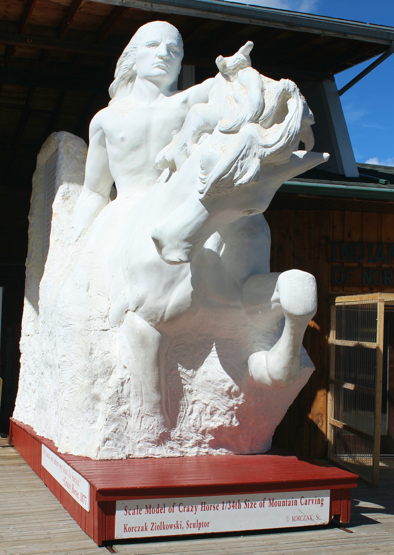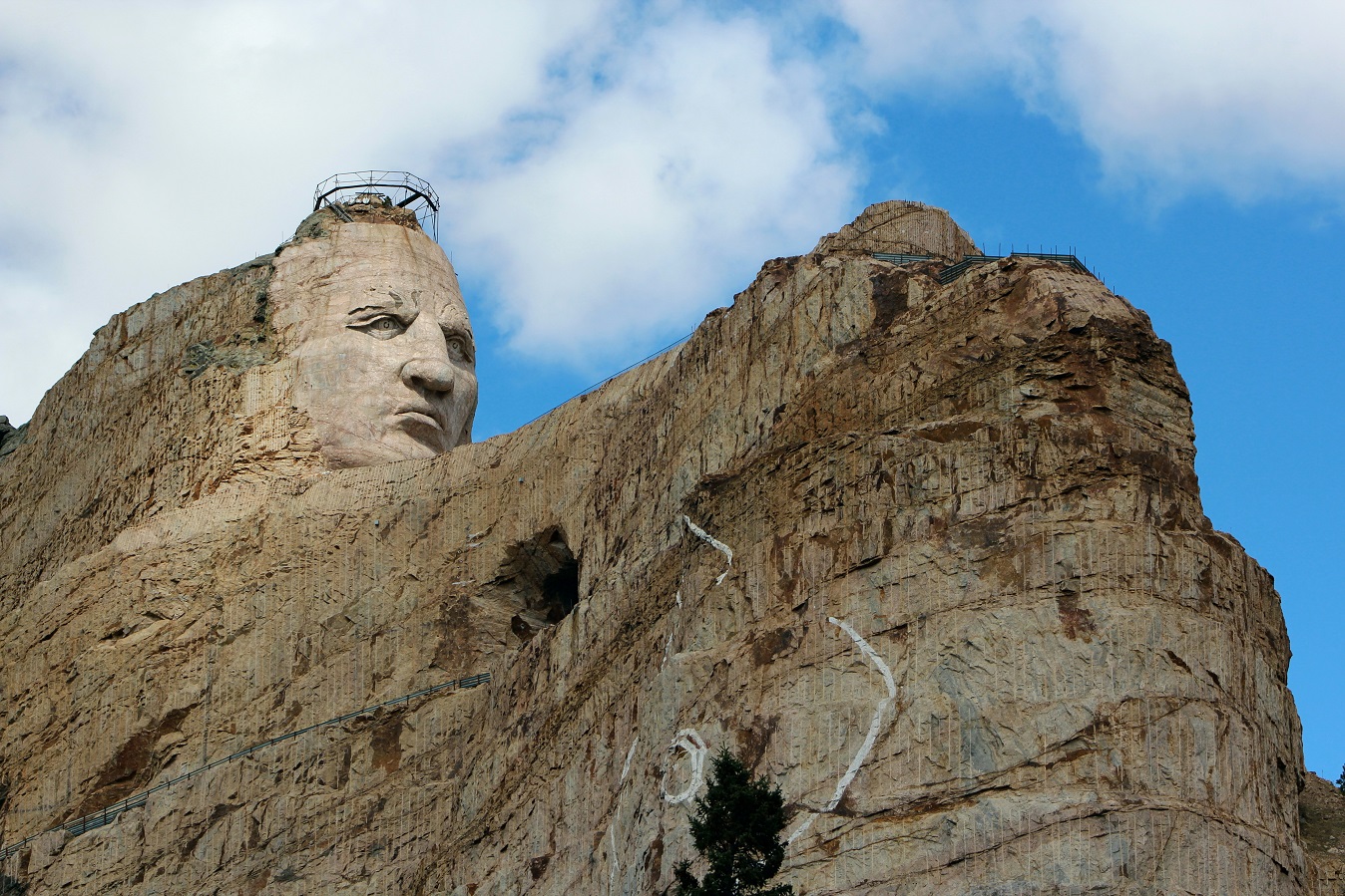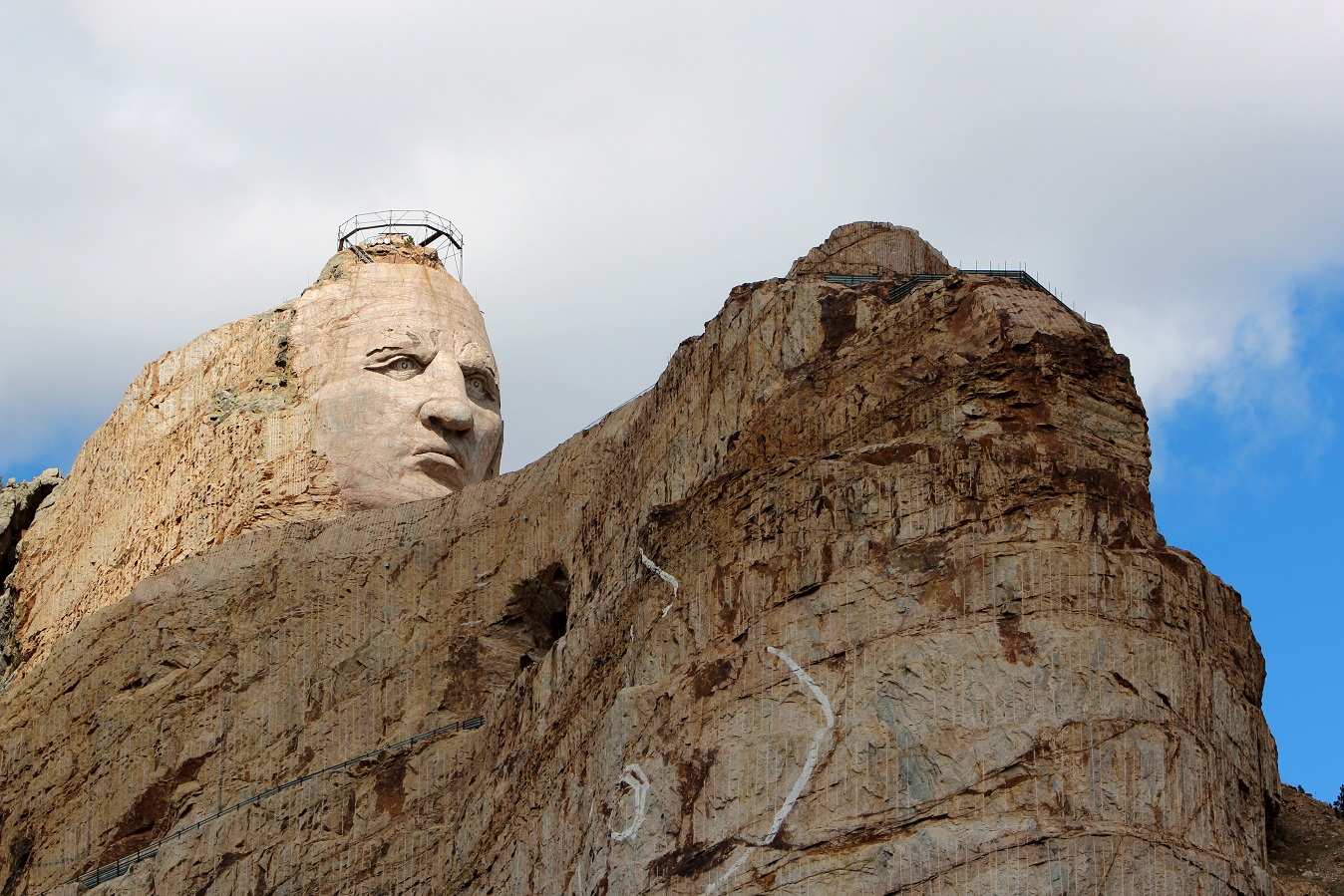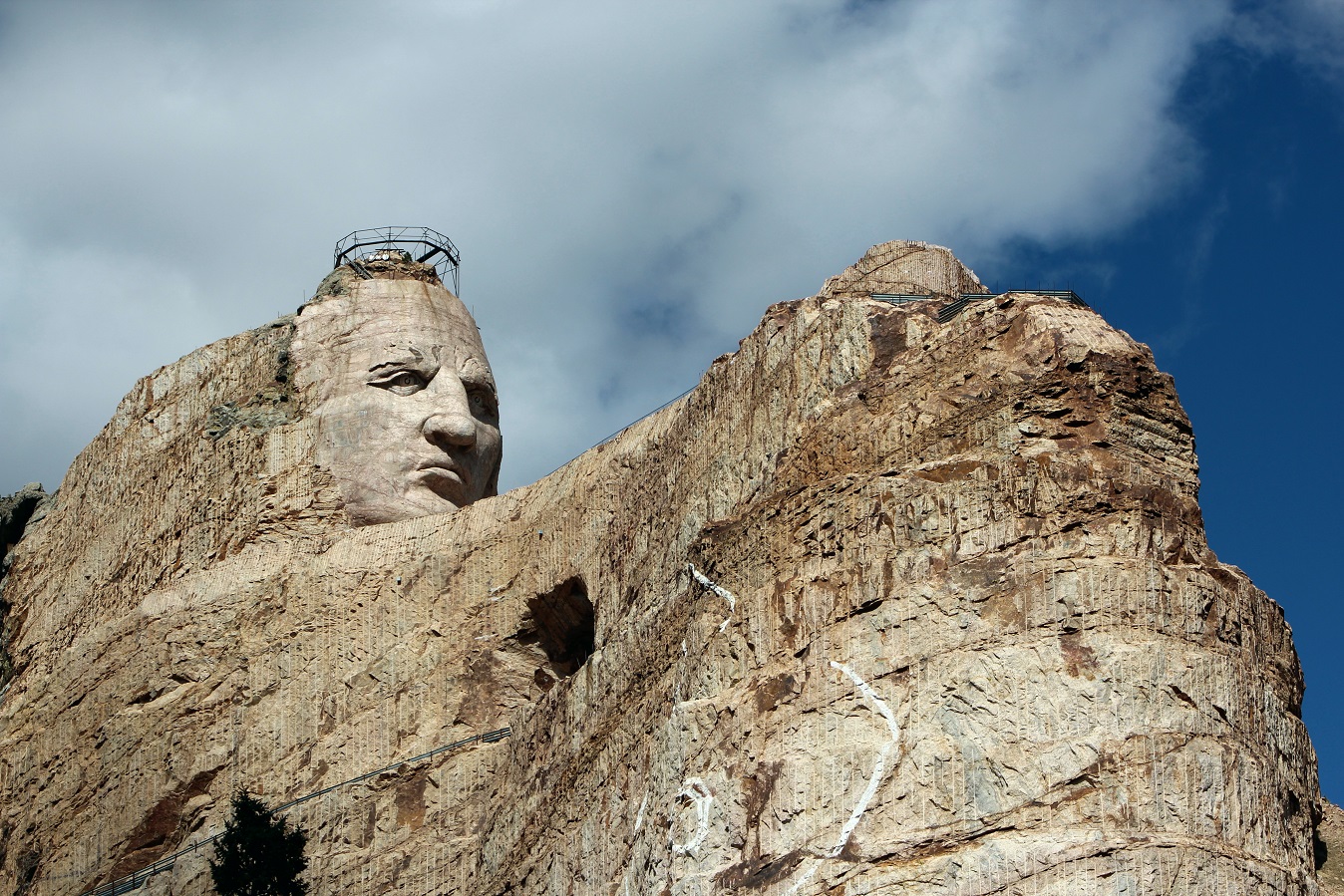 [This was one of the more amazing stories . . . Korczak started the sculpture all by himself in 1948. It was more than 700 stairs up to his work area, carrying about 50 pounds of equipment with him. He ultimately realized he needed a compressor, bought this one used (a Buda, as I recall), and he would crank start it and then begin his climb. But it was not reliable and often conked out – he would have to go back down to re-start it. One day he did that NINE times! I can’t even imagine what kind of shape he was in, and he was not a young man. So, Crazy Horse has been under construction for 67 years, most of that time span by Korczak himself. More workers of late have made much more progress in the last 15 years than Korczak did in the first 50 years. Best estimates are that it is still at least 20 – 30 years from completion. Guess I won’t see it.]