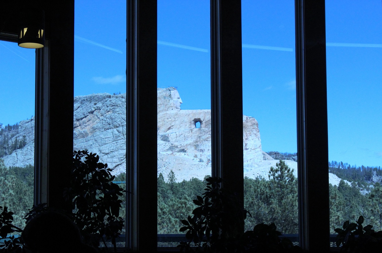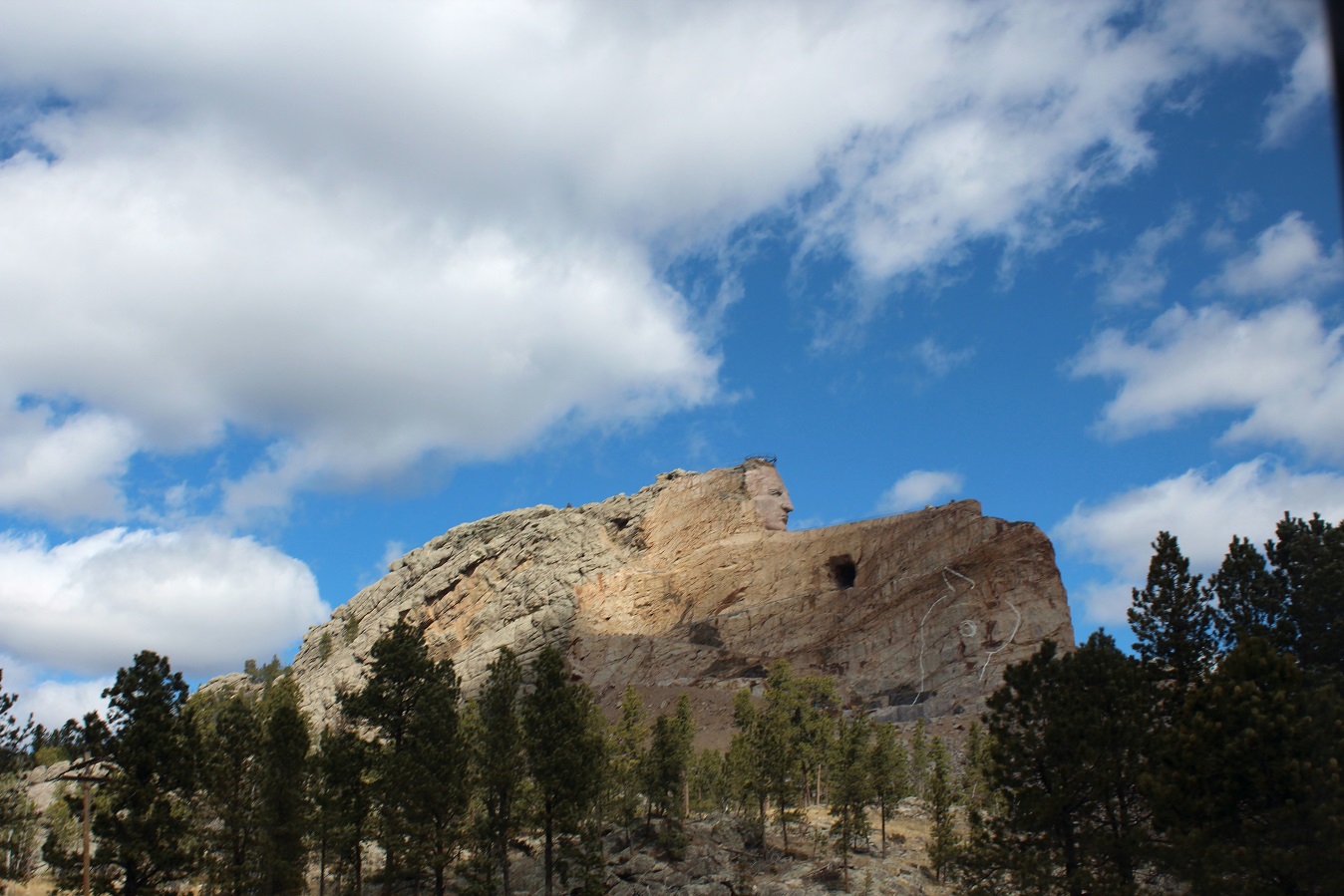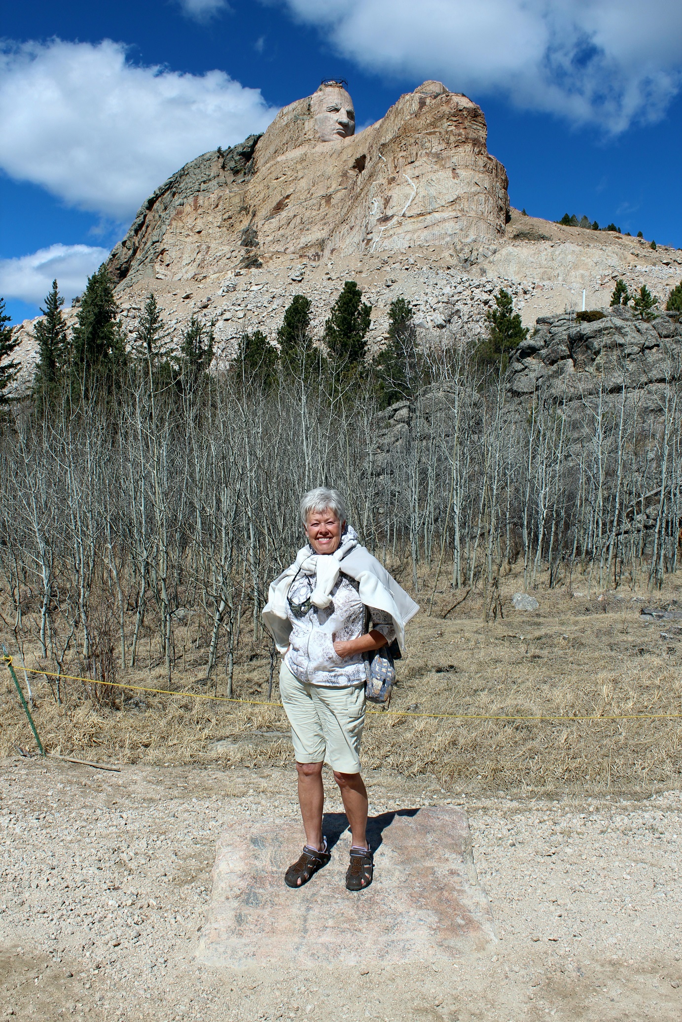[I am now going to dazzle (bore?) you with several photos of the same thing. There is a shuttle bus to the base of the mountain, and a viewing/photo op place when you get there. The bus driver/tour guide advised that Crazy Horse’s expression, attitude, and demeanor all change with the shifting light and seasons. We had a perfect day here with passing clouds. Do you notice a change in mood (his, not yours)?]