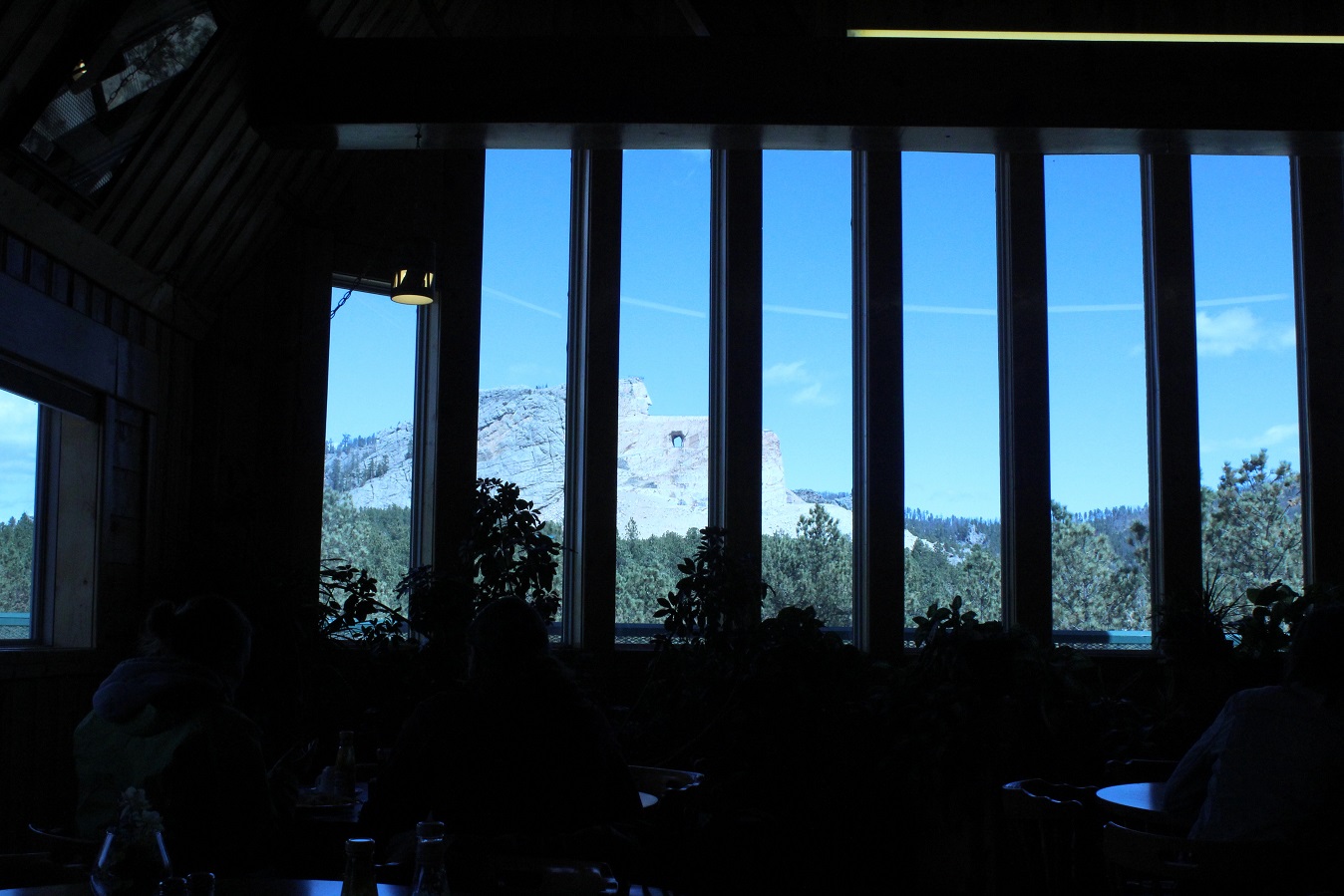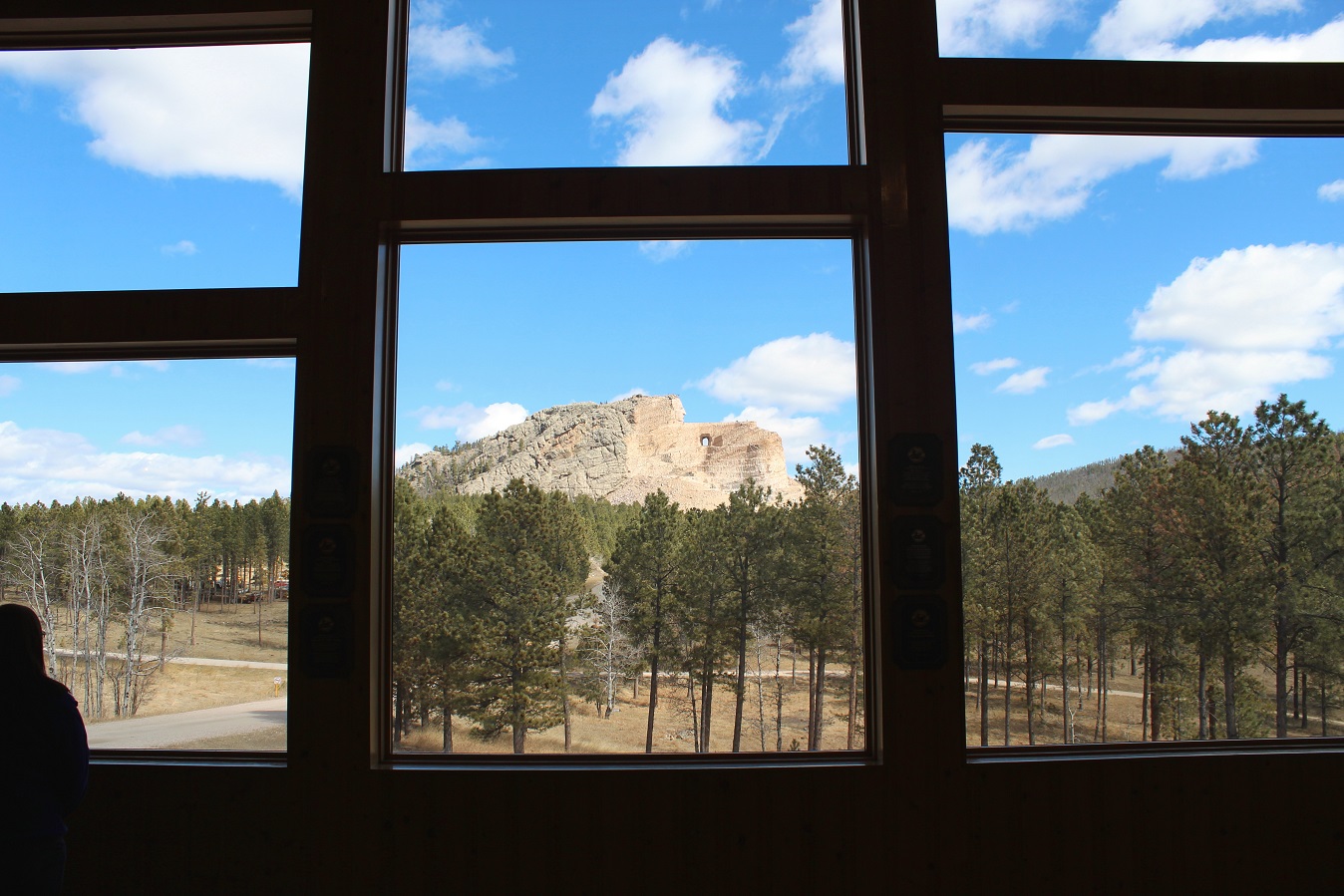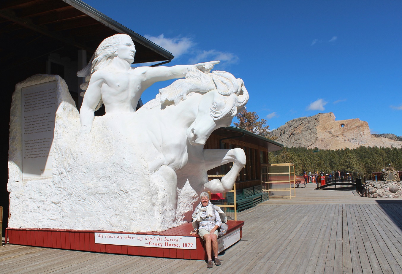 [I am now going to dazzle (bore?) you with several photos of the same thing. There is a shuttle bus to the base of the mountain, and a viewing/photo op place when you get there. The bus driver/tour guide advised that Crazy Horse’s expression, attitude, and demeanor all change with the shifting light and seasons. We had a perfect day here with passing clouds. Do you notice a change in mood (his, not yours)?]