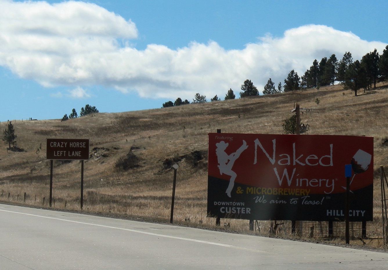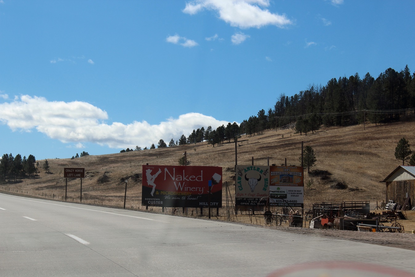 [From Mt. Rushmore moving on to Crazy Horse. The sign is not quite correct – an awful lot of Federal signage for the place along the interstates.]