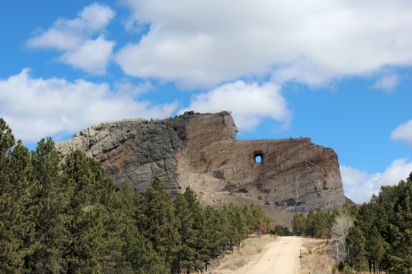 [On the way back to the visitors center, we passed where Korczak is buried – in the middle of the photo at the base of the rock cliff. Most of his family still works here, his sons working on Crazy Horse. They will all be buried here as well.]