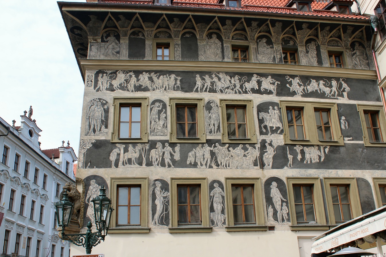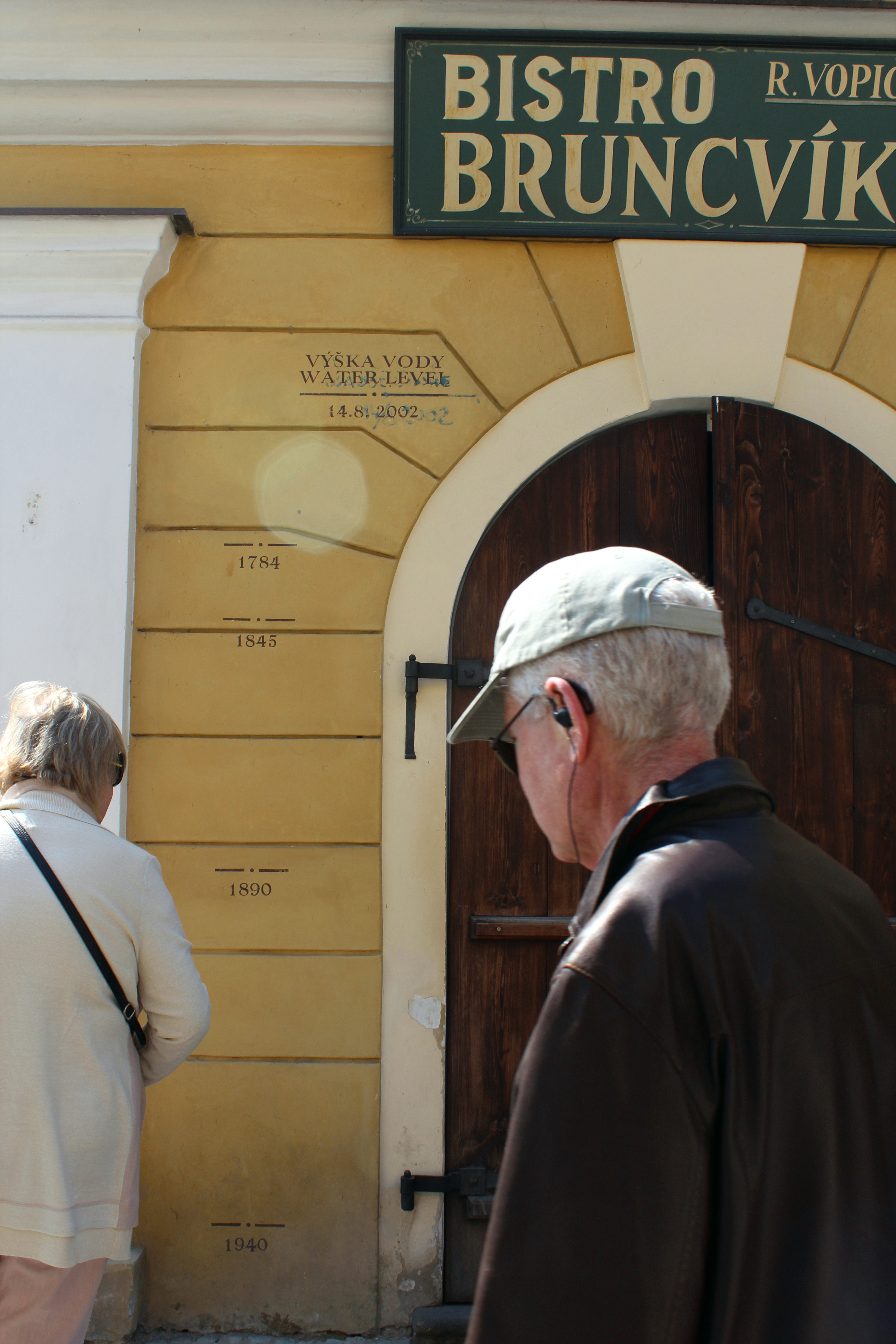 [The Vltava floods from time to time.  It’s a river!  The last big one was just 13 years ago – see the water line marked on the wall.]
