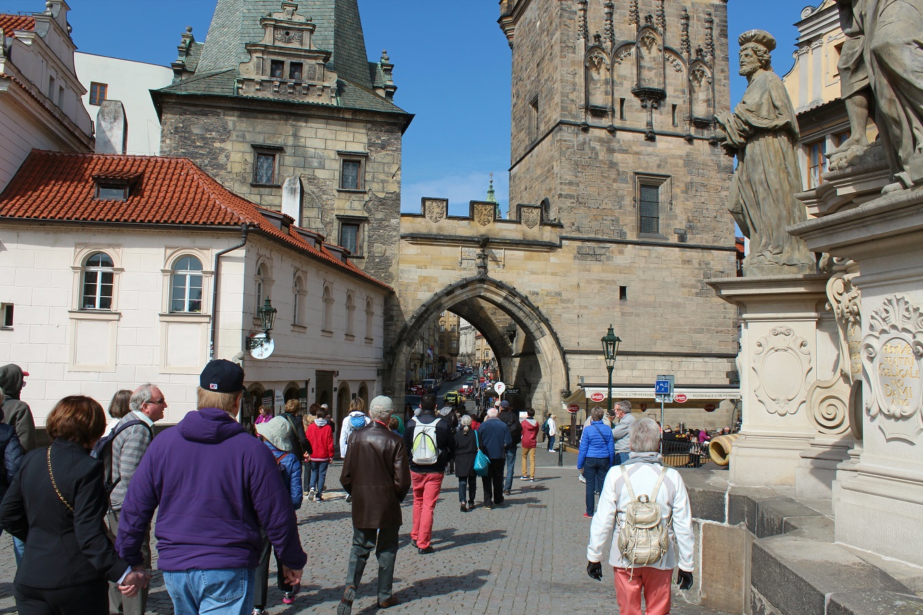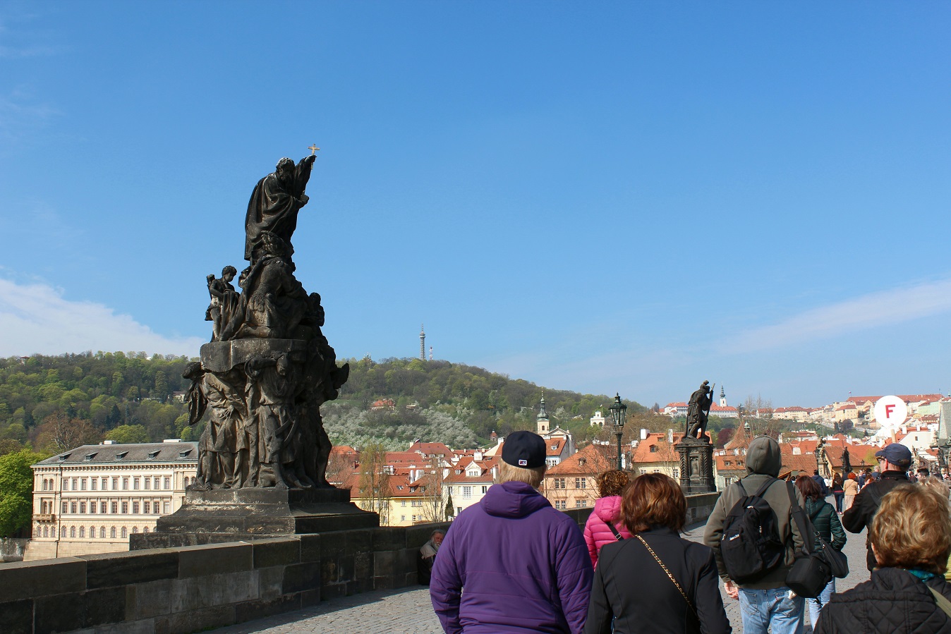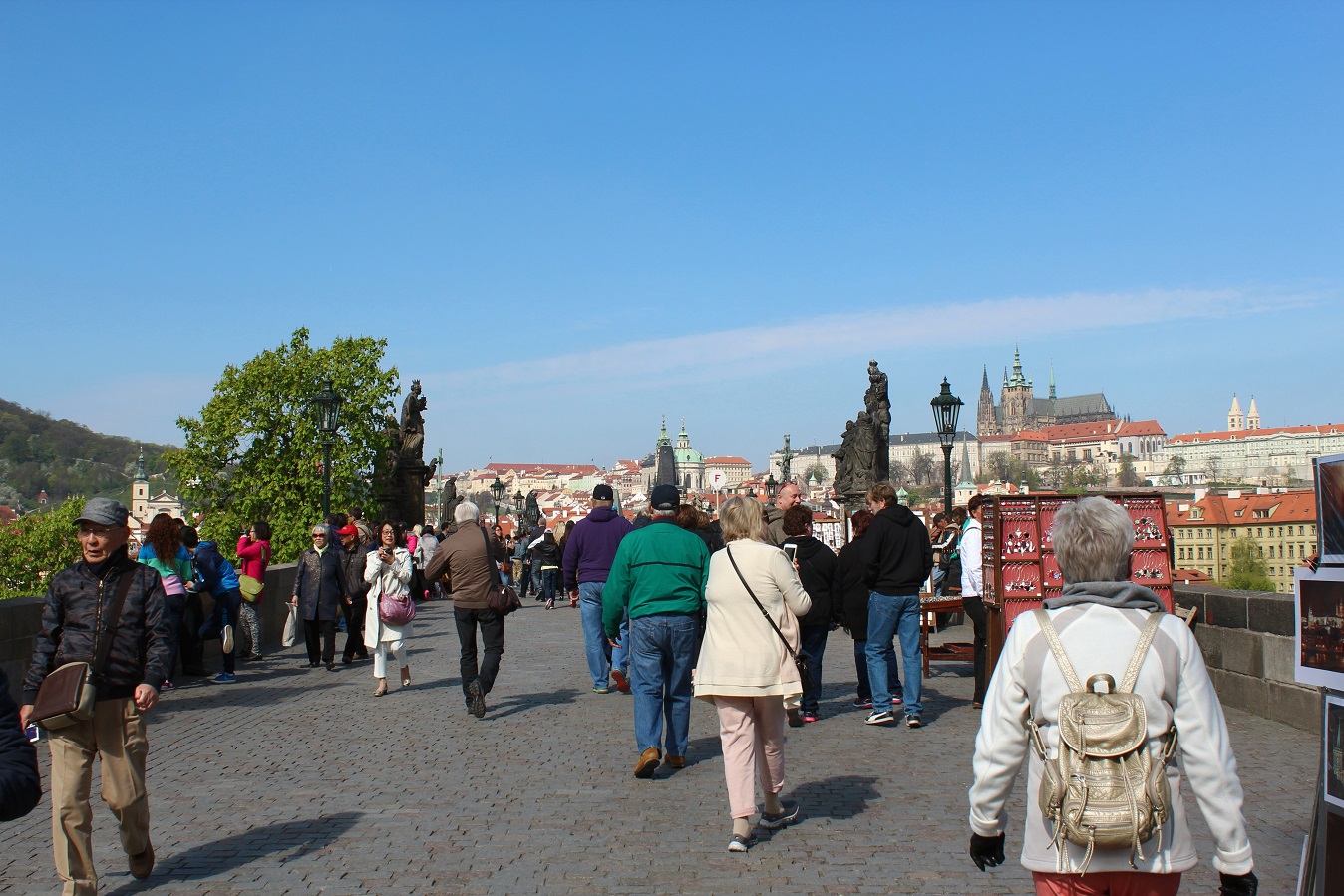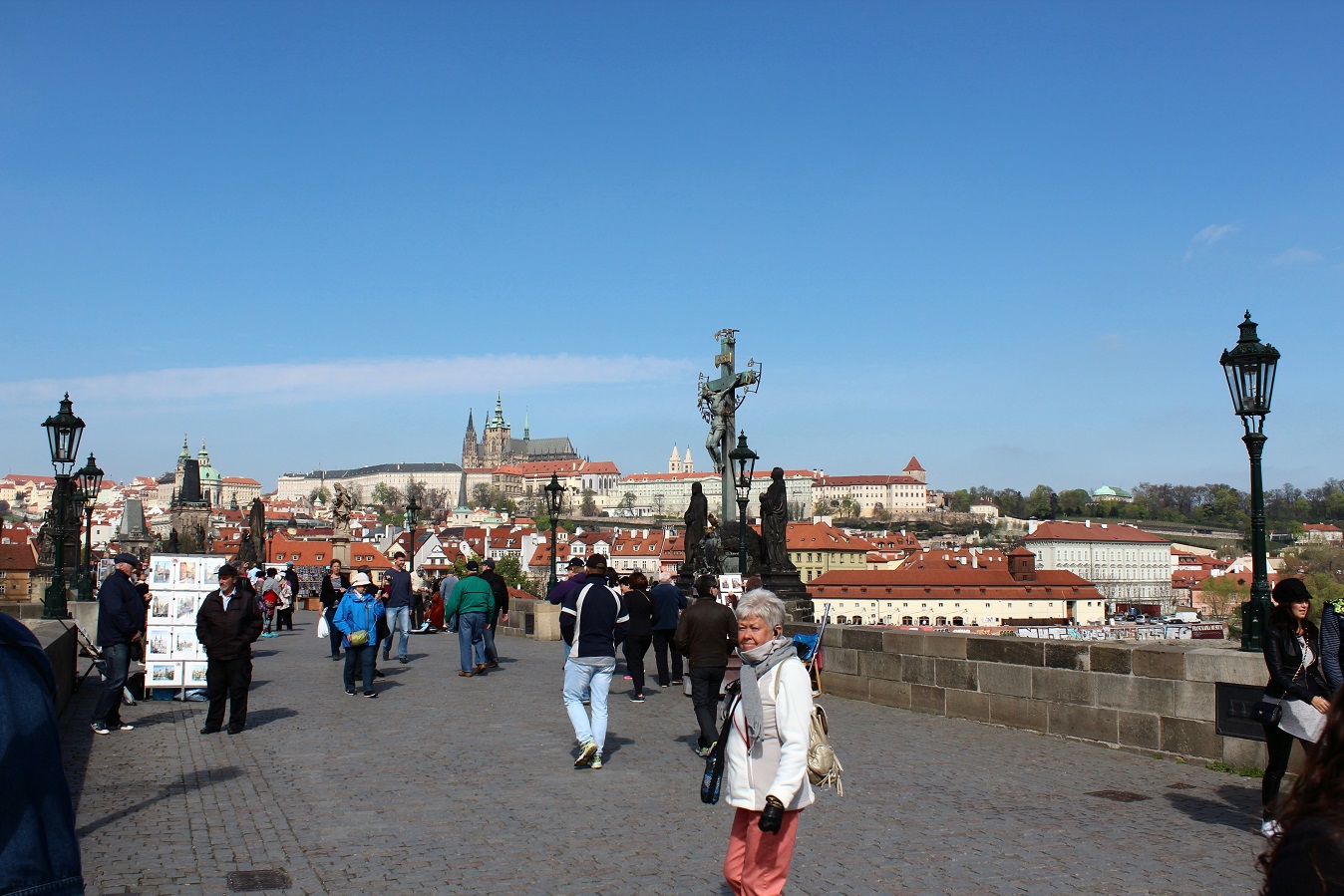 [And now we’re across the bridge and walking to a bus to take us to Prague Castle.]