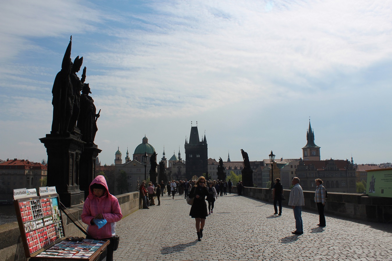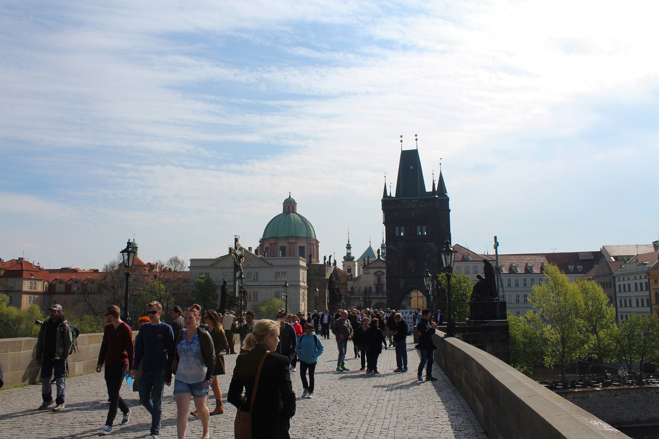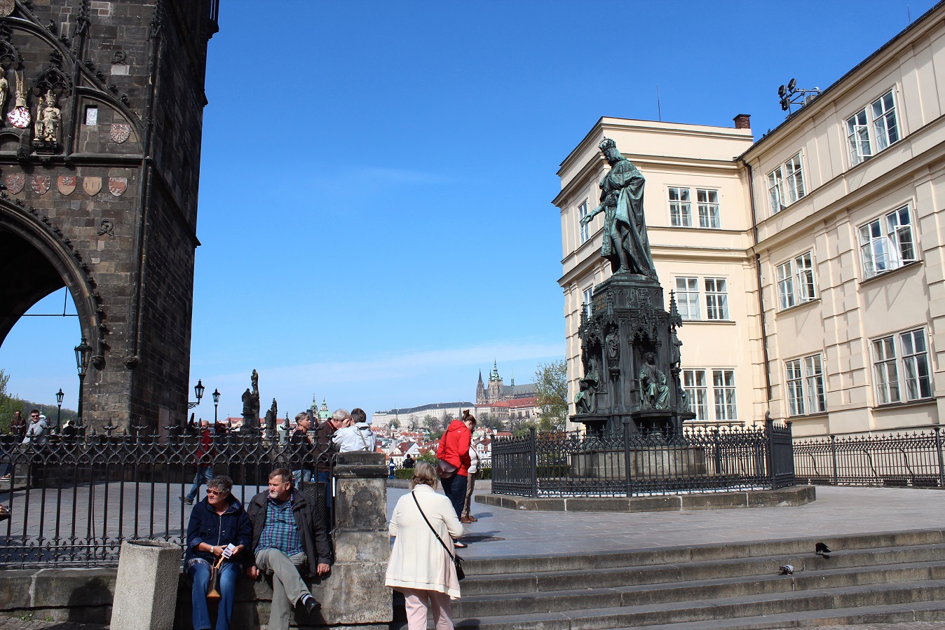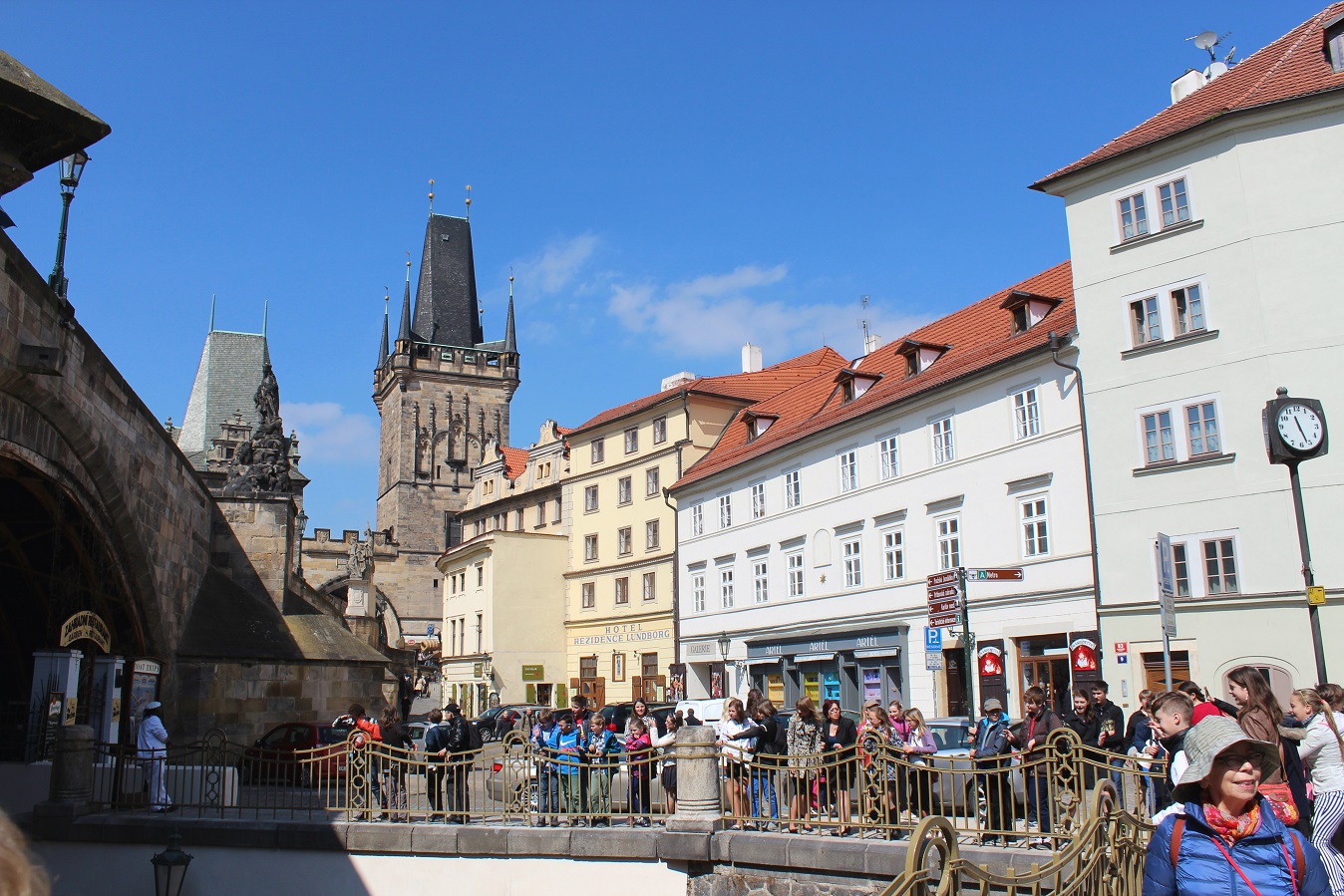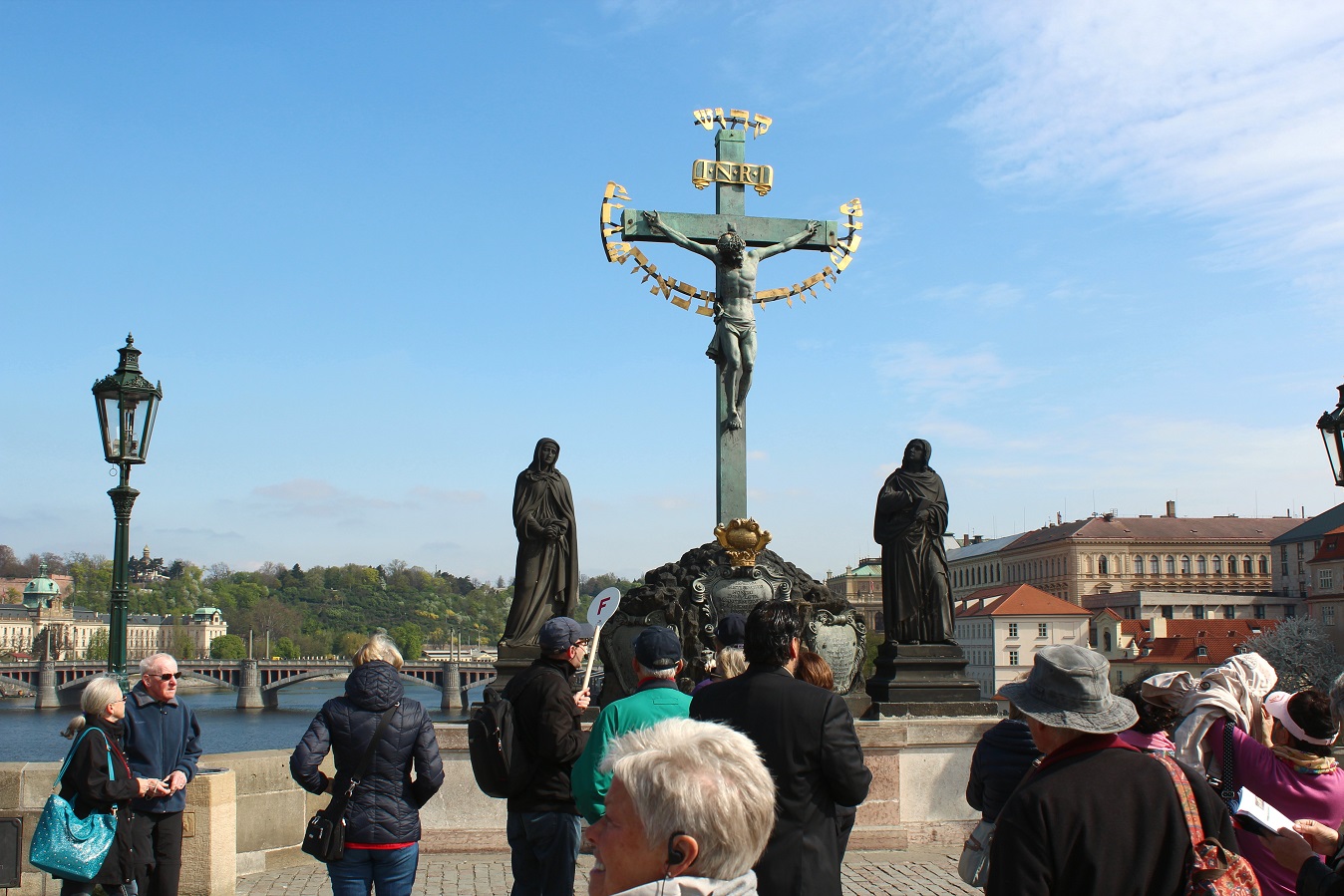 [And now we’re across the bridge and walking to a bus to take us to Prague Castle.]