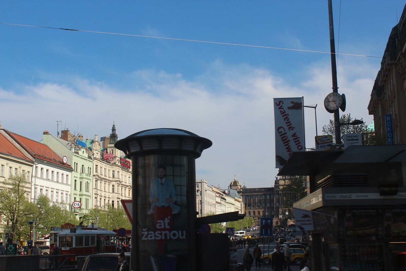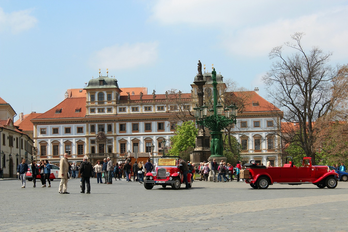 [In the photo under the red limos, there’s a building on the left painted to give a 3-D effect – it works! We also have another view of the Eiffel Tower (to be visited anon) and the spires of St. Vitus Cathedral.]