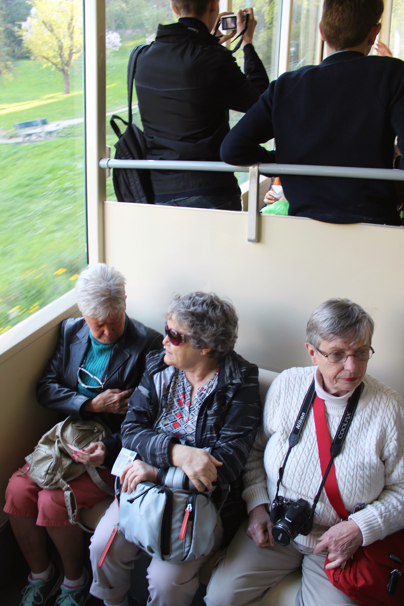 [That afternoon we were free to venture out on our own. Rita and her old nursing college roommate, Karen, arrived and were anxious for some sightseeing. We decided to try the public transportation – go to the funicular, ride it up for a view of the city from the Eiffel Tower. As what occasionally happens, we began by going in the wrong direction on the trolley.]