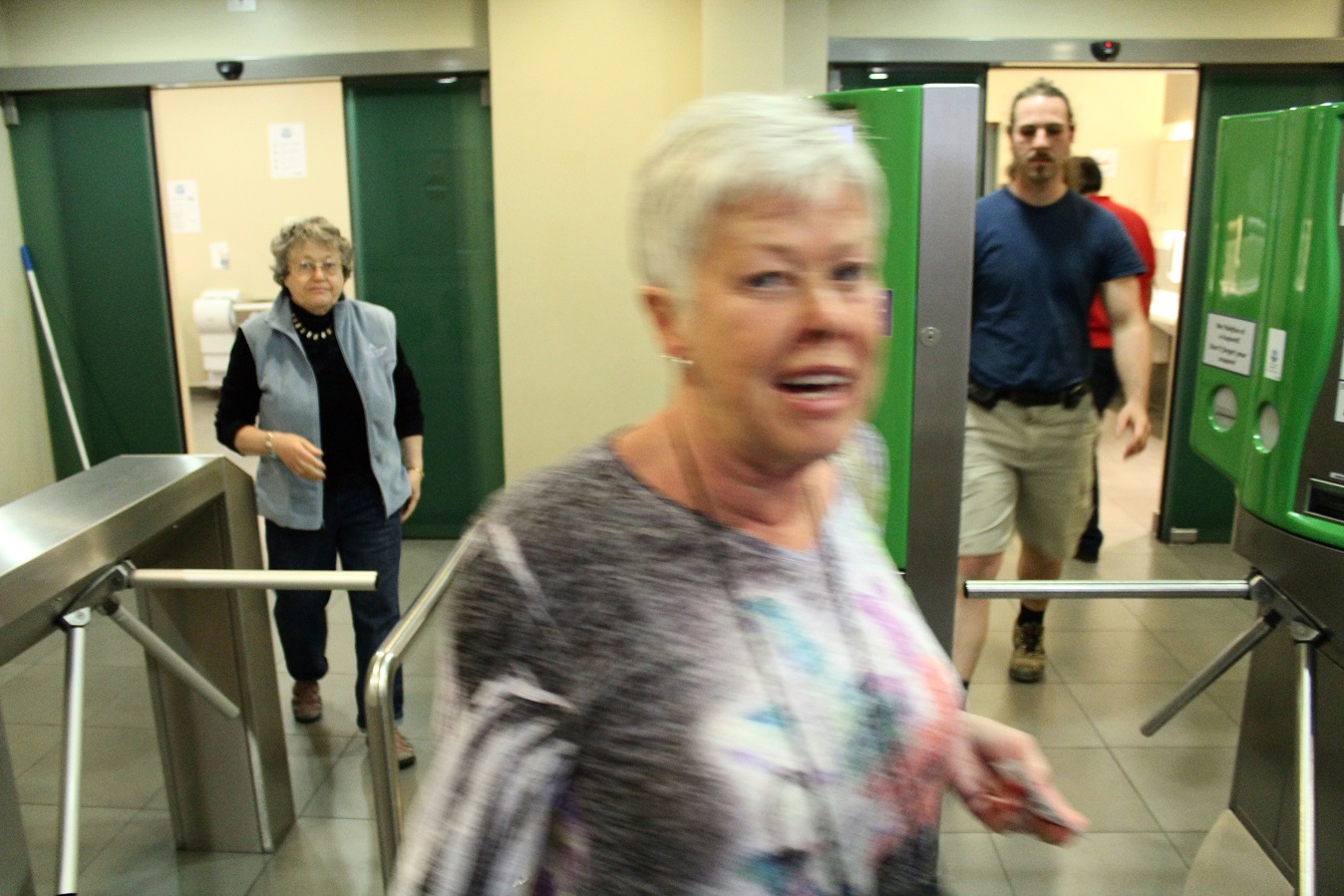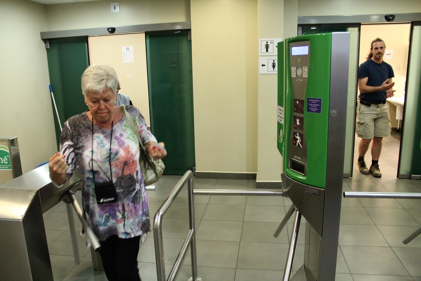 [Using paid professional actors to show how to deal with the “pay-to-pee” policies that exist throughout Europe. Here, we even had to exit through turnstiles. Bring plenty of change!]