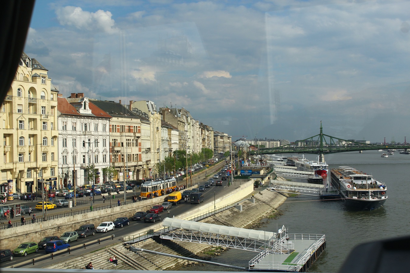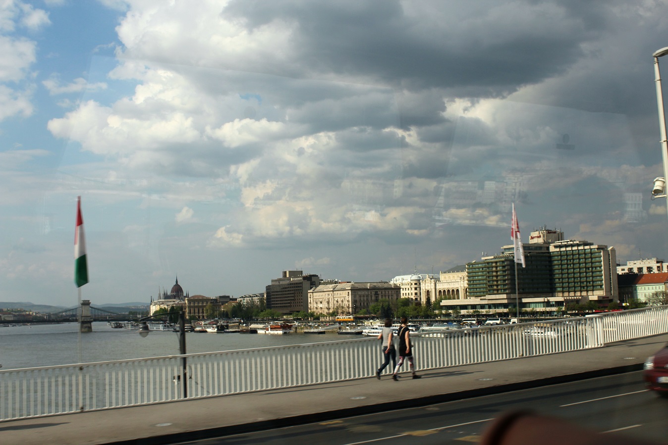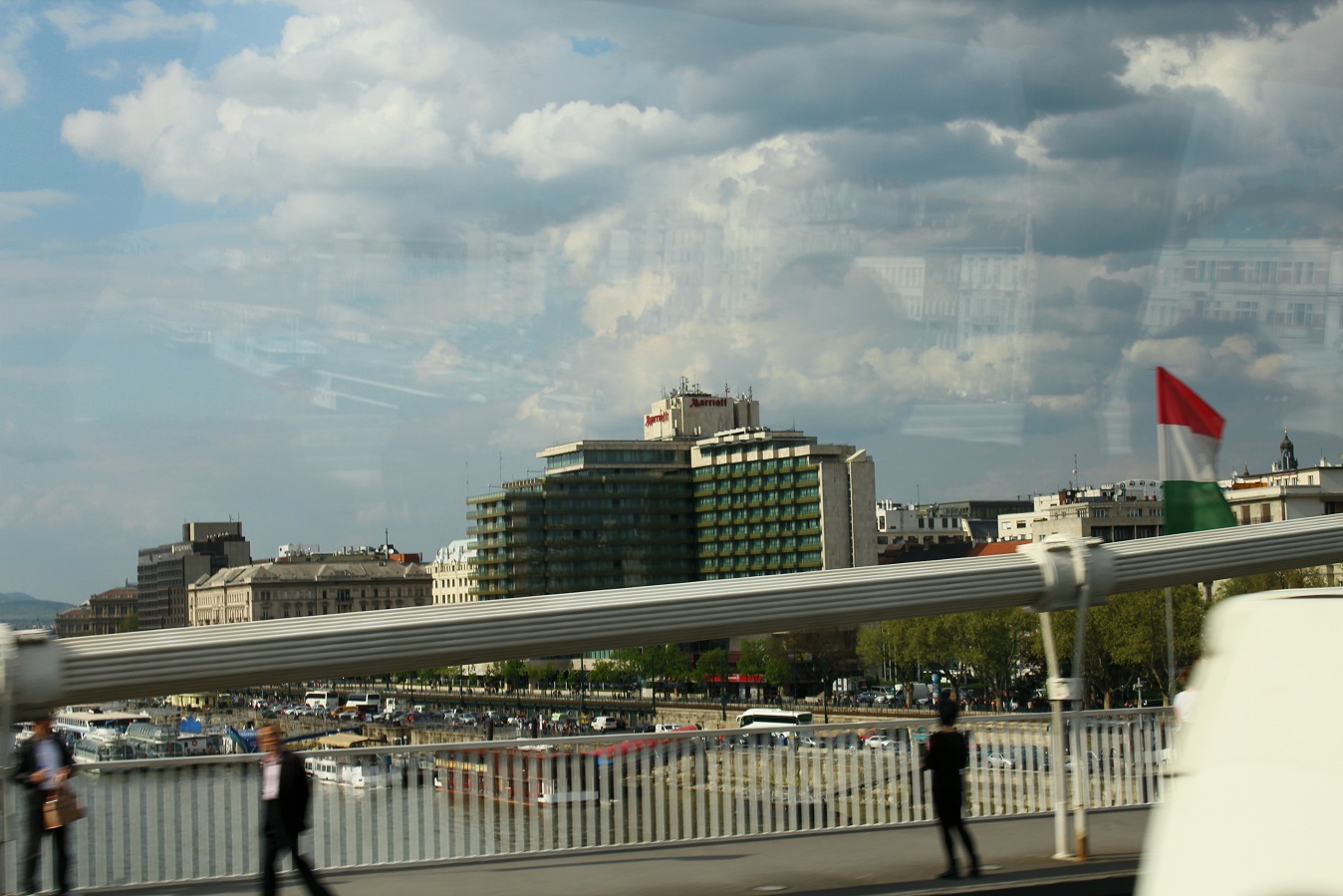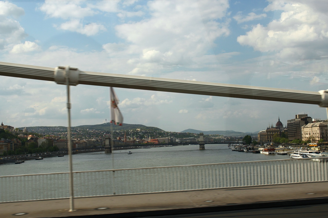 [Our first views of Budapest through the bus windows. In the immediate above photo is our hotel – the Marriott right on the Danube!]