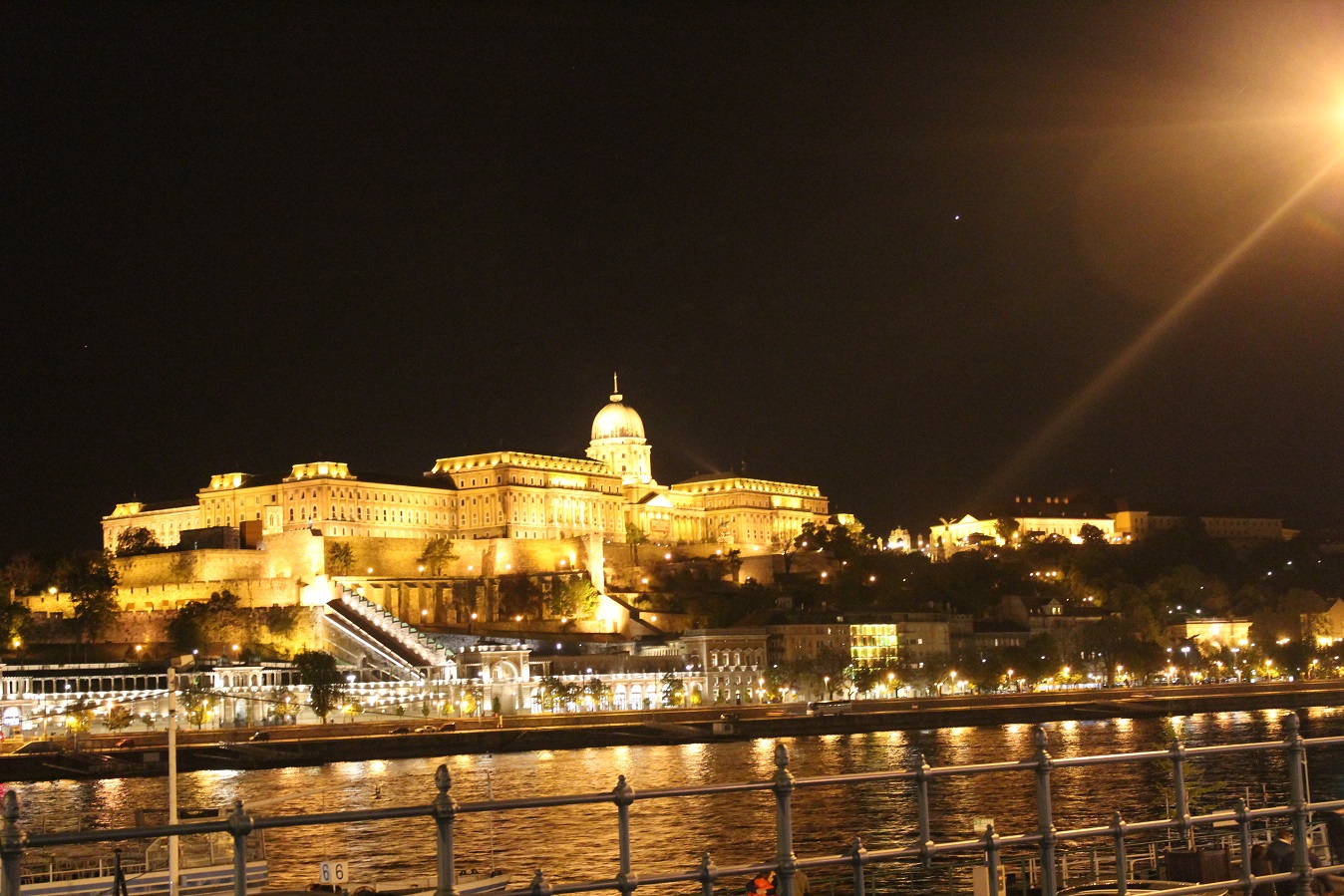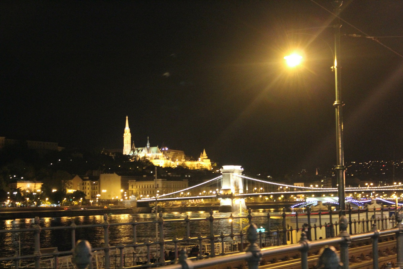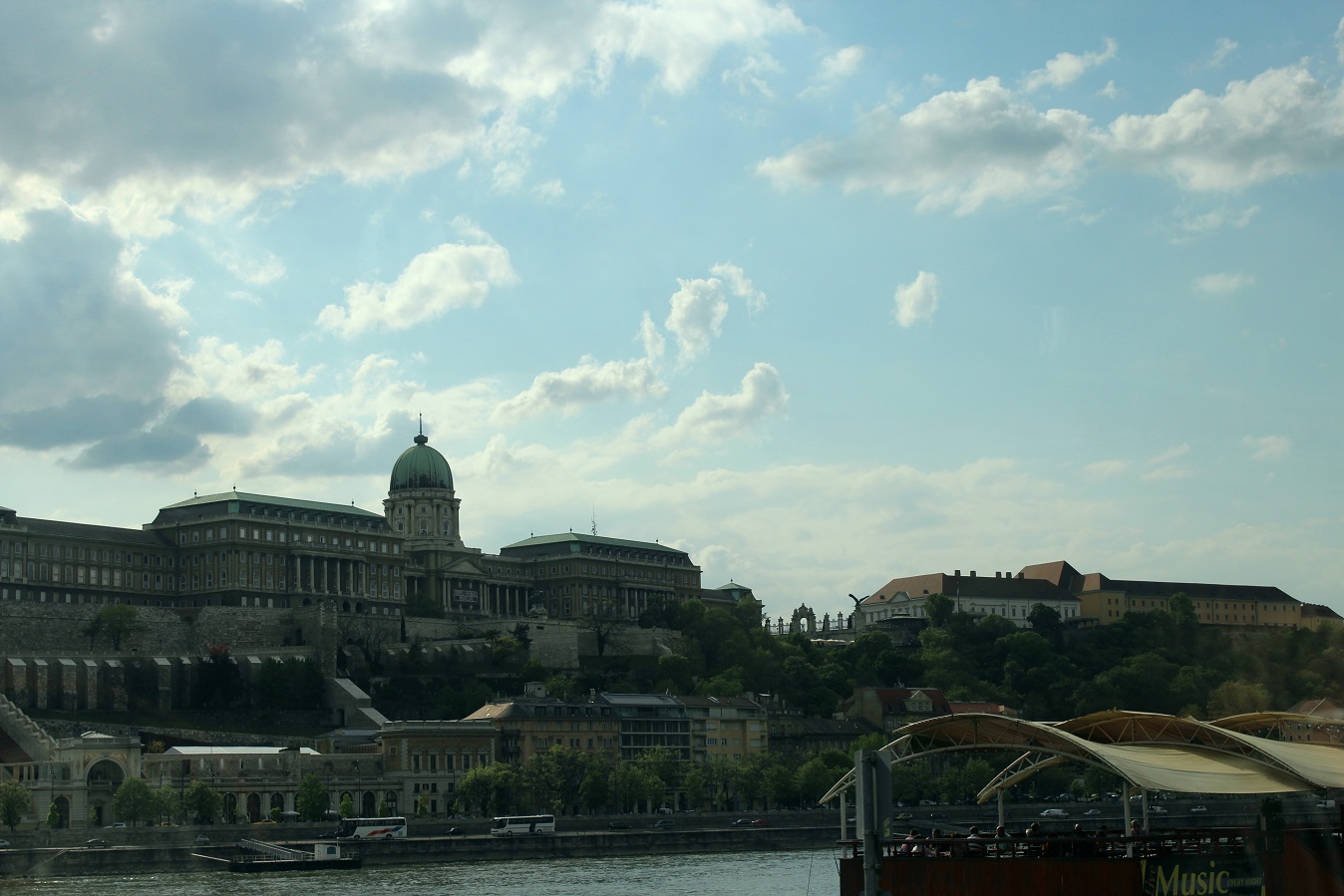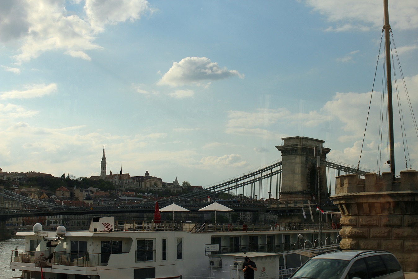 [And here’s where we’re heading, Budapest, the capital of Hungary. That’s Buda on the left, highlighted by Buda Castle (many following photos), and Pest on the right, where we stayed (the Marriott Hotel on the far right). That’s Chain Bridge connecting the two. [Photo on loan from Wikipedia.]]