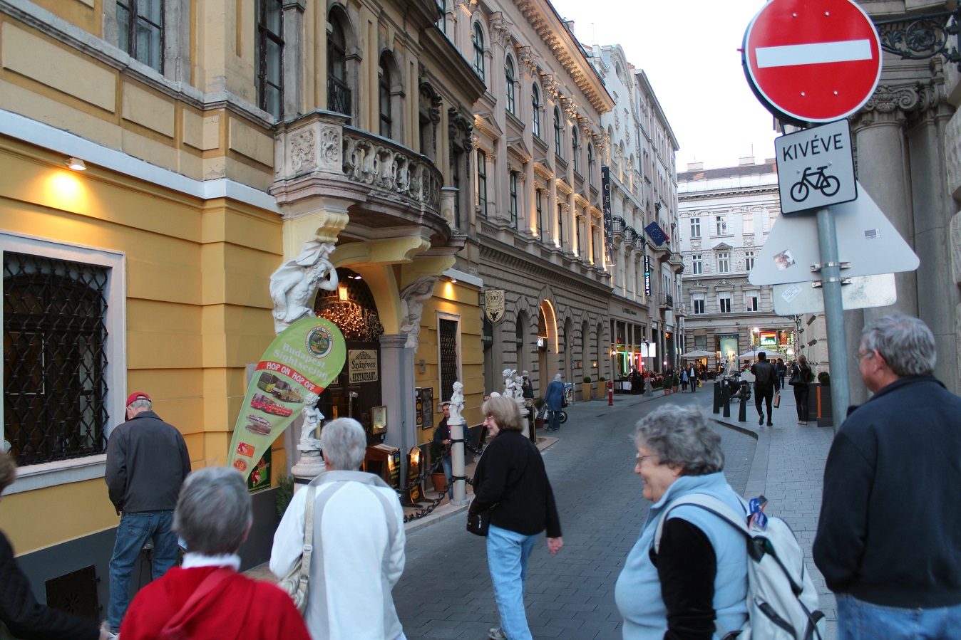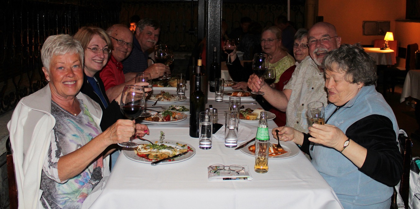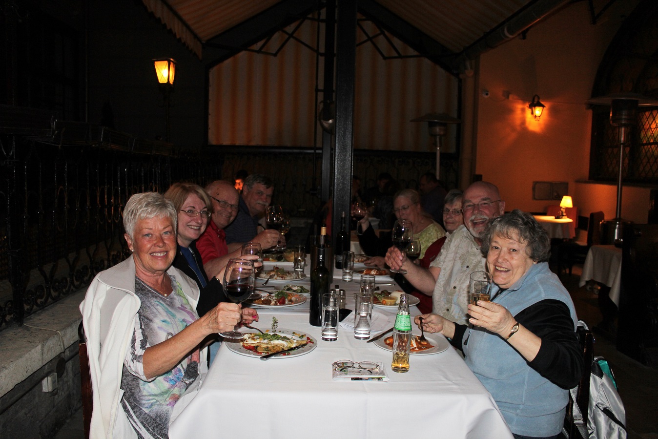 [And finally we’re joined by the rest of our party – Kathy & Bert, Anne & Bill, spent their pre-cruise days in Vienna while we were in Prague. Our first night together ISO a fine eating experience . . . and it was just a couple blocks from the hotel.]