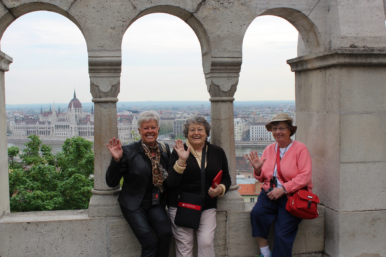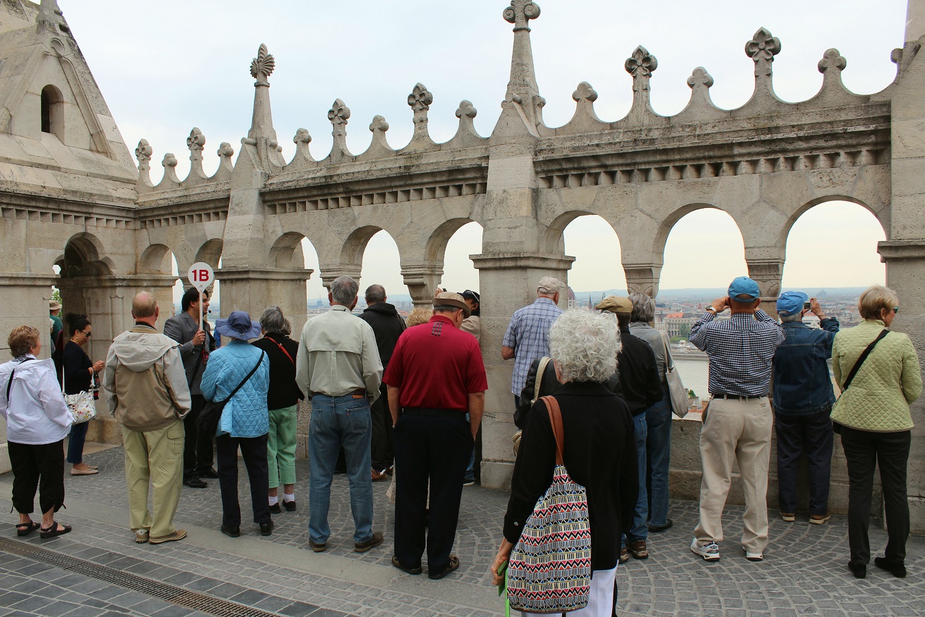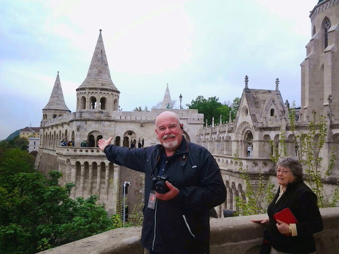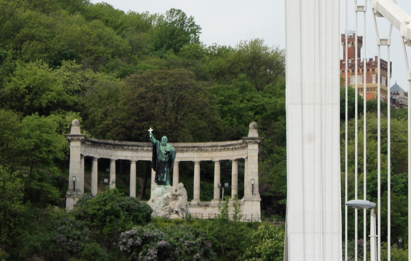 [St. Gellert on the Buda side of Elisabeth Bridge. Not surprisingly, he’s on Gellert Hill. We’re in a bus now for a guided tour of the city on Sunday morning. This brought some consternation to the cruisers who wondered why this didn’t come until our final day in the city? It was originally scheduled for Saturday, which made sense so we would then know where to go when we were on our own, but Viking worried about a big city bike race on Saturday (we never noticed it?). Well, I’m sure there was nothing nefarious involved – we truly enjoyed our time in Budapest.]