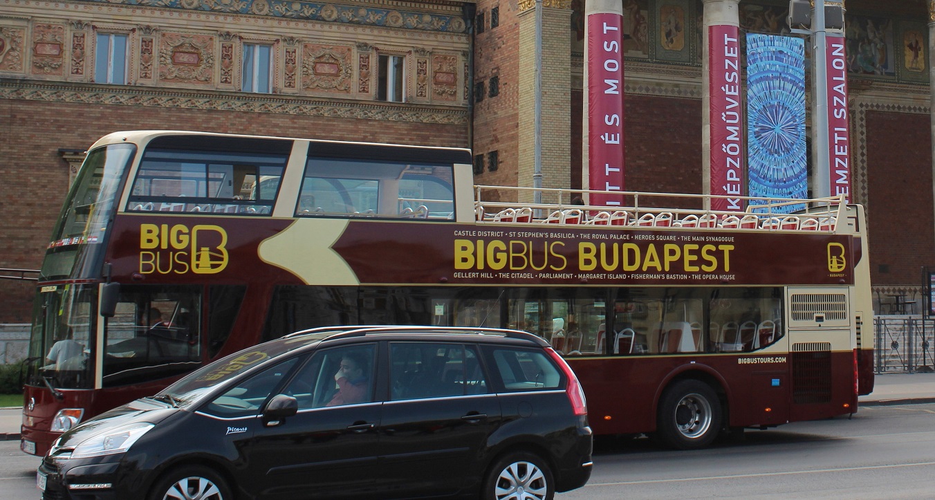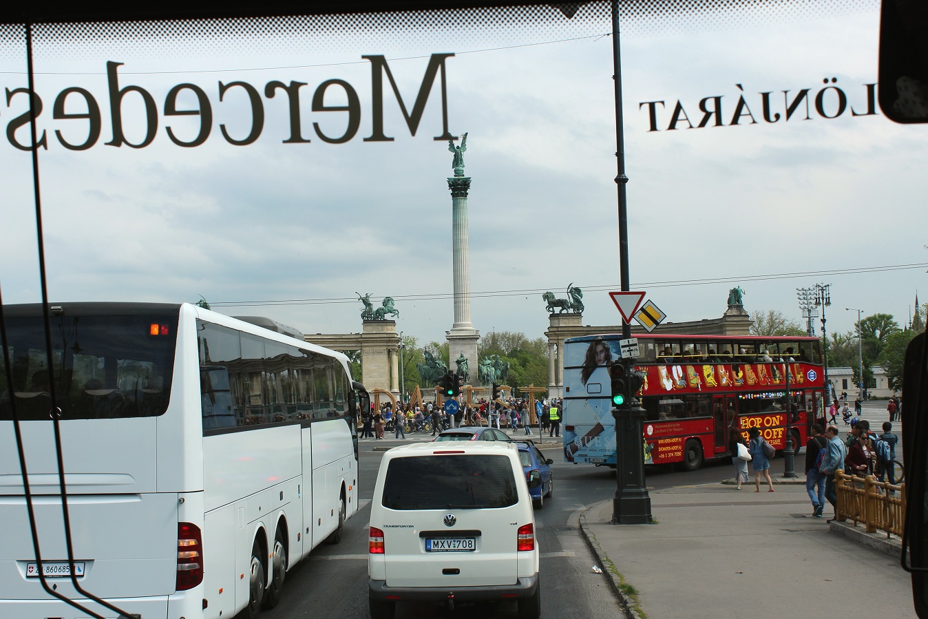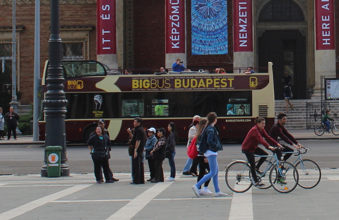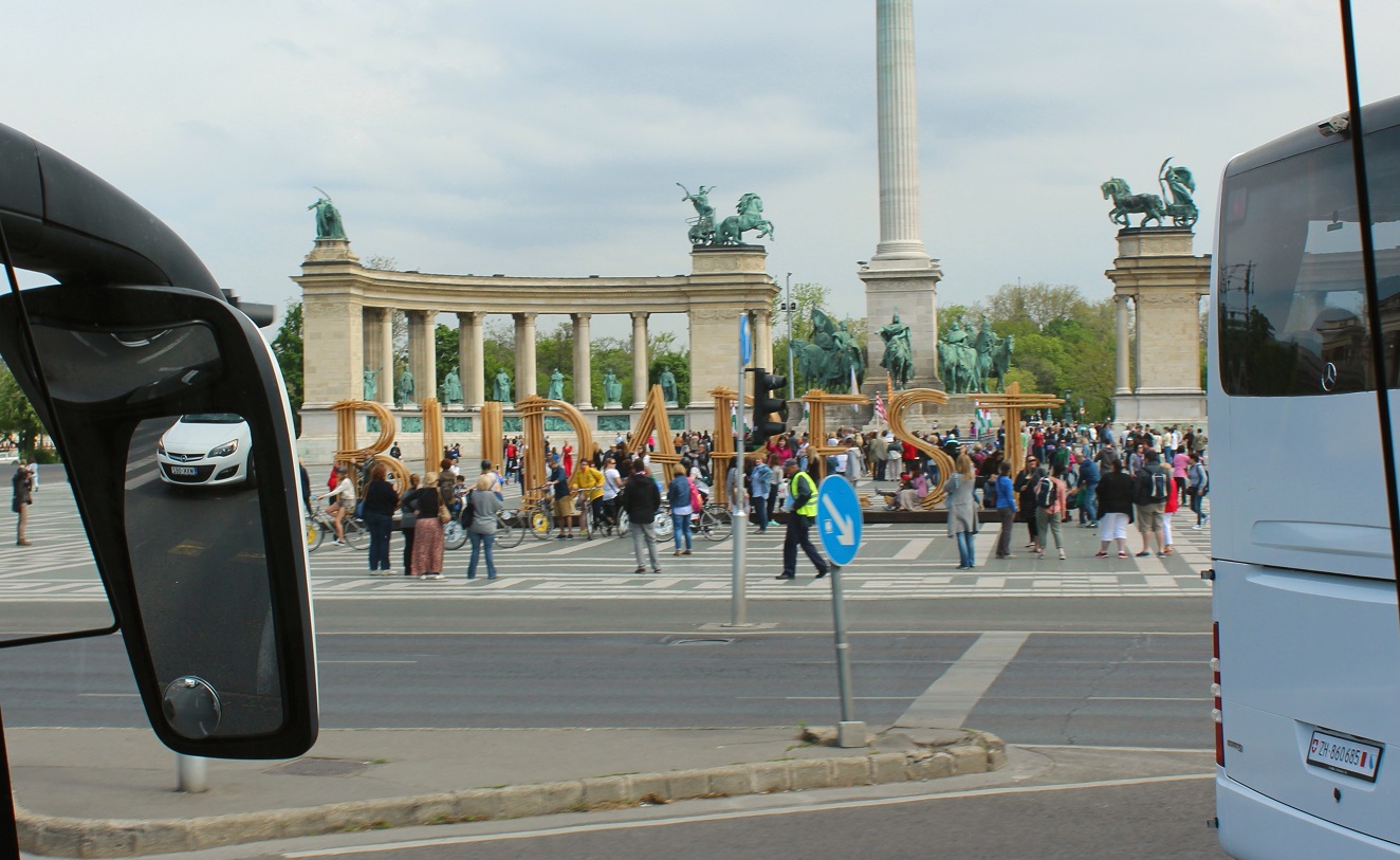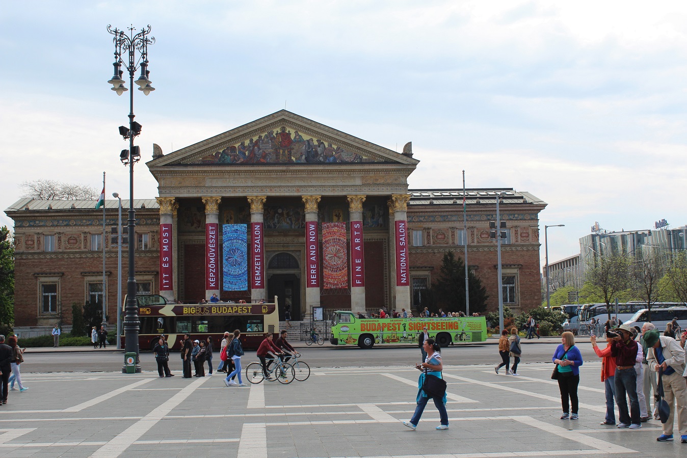 [The Palace of Art with BigBus Budapest across the street from the Square.]