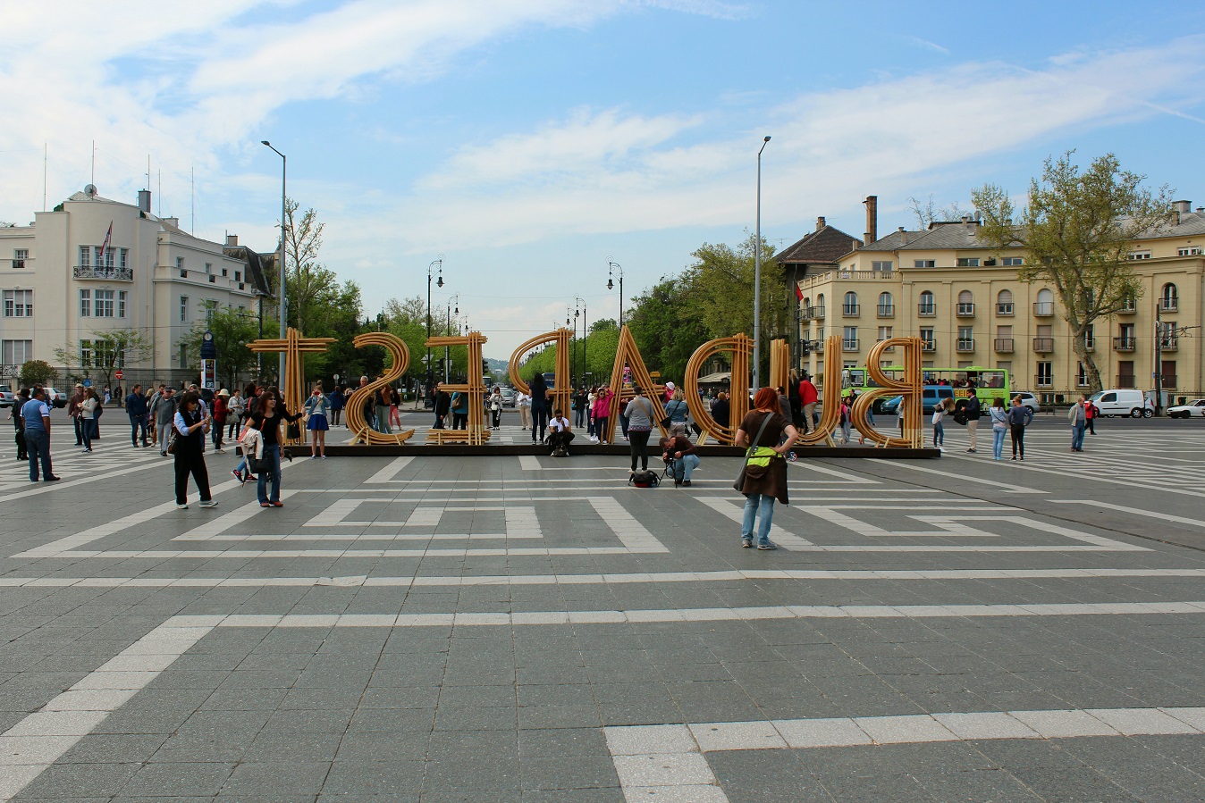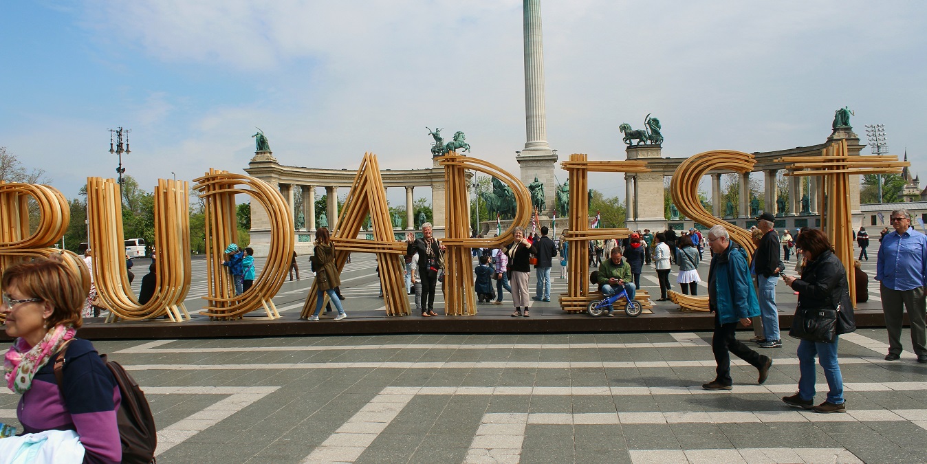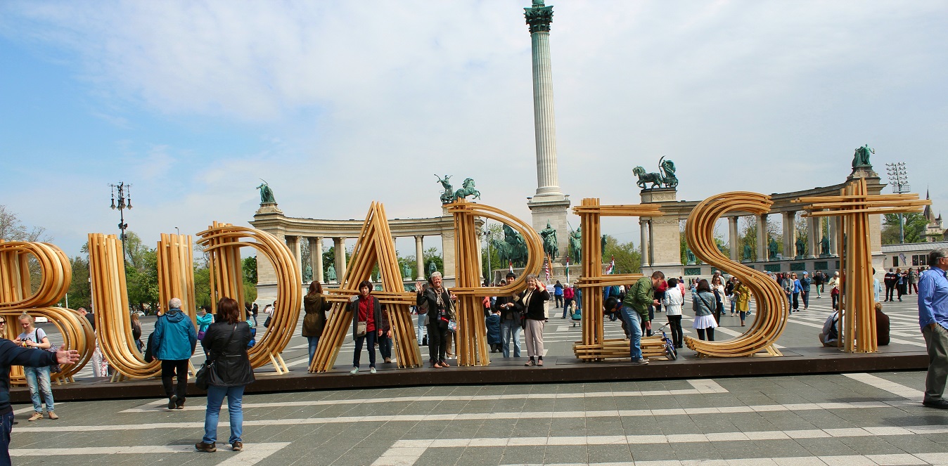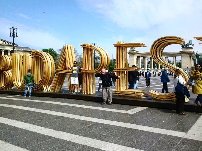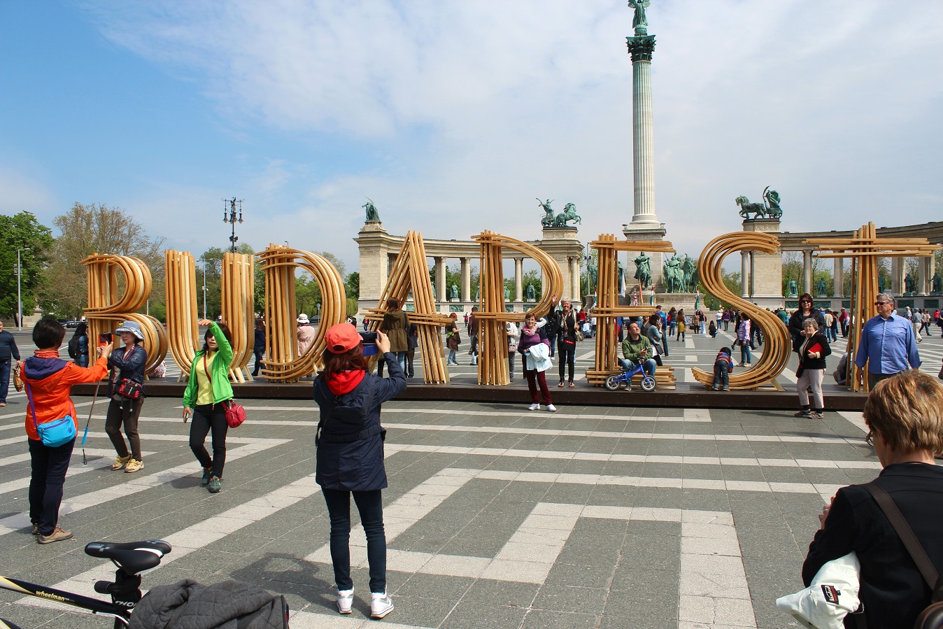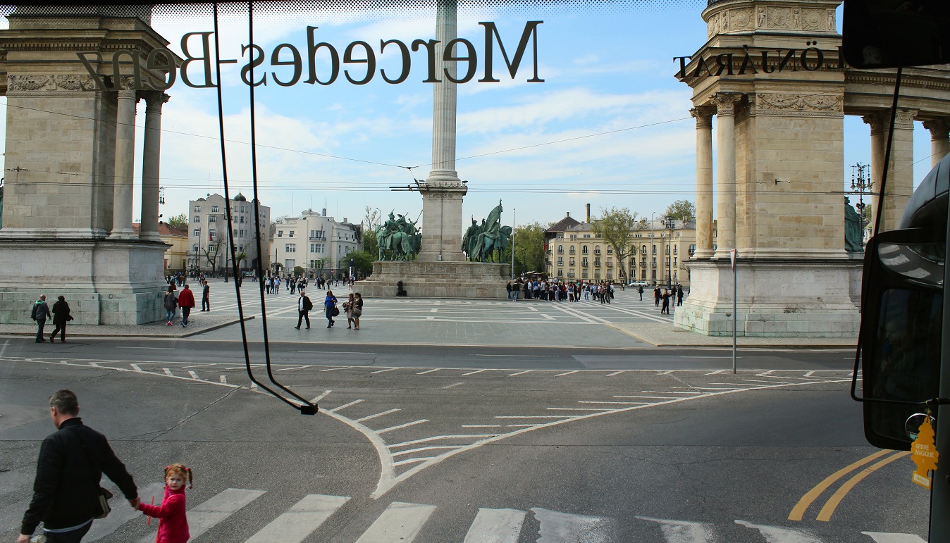 [The Palace of Art with BigBus Budapest across the street from the Square.]