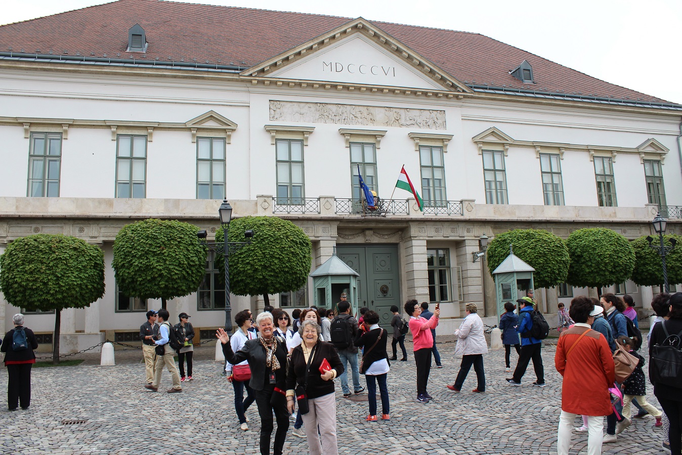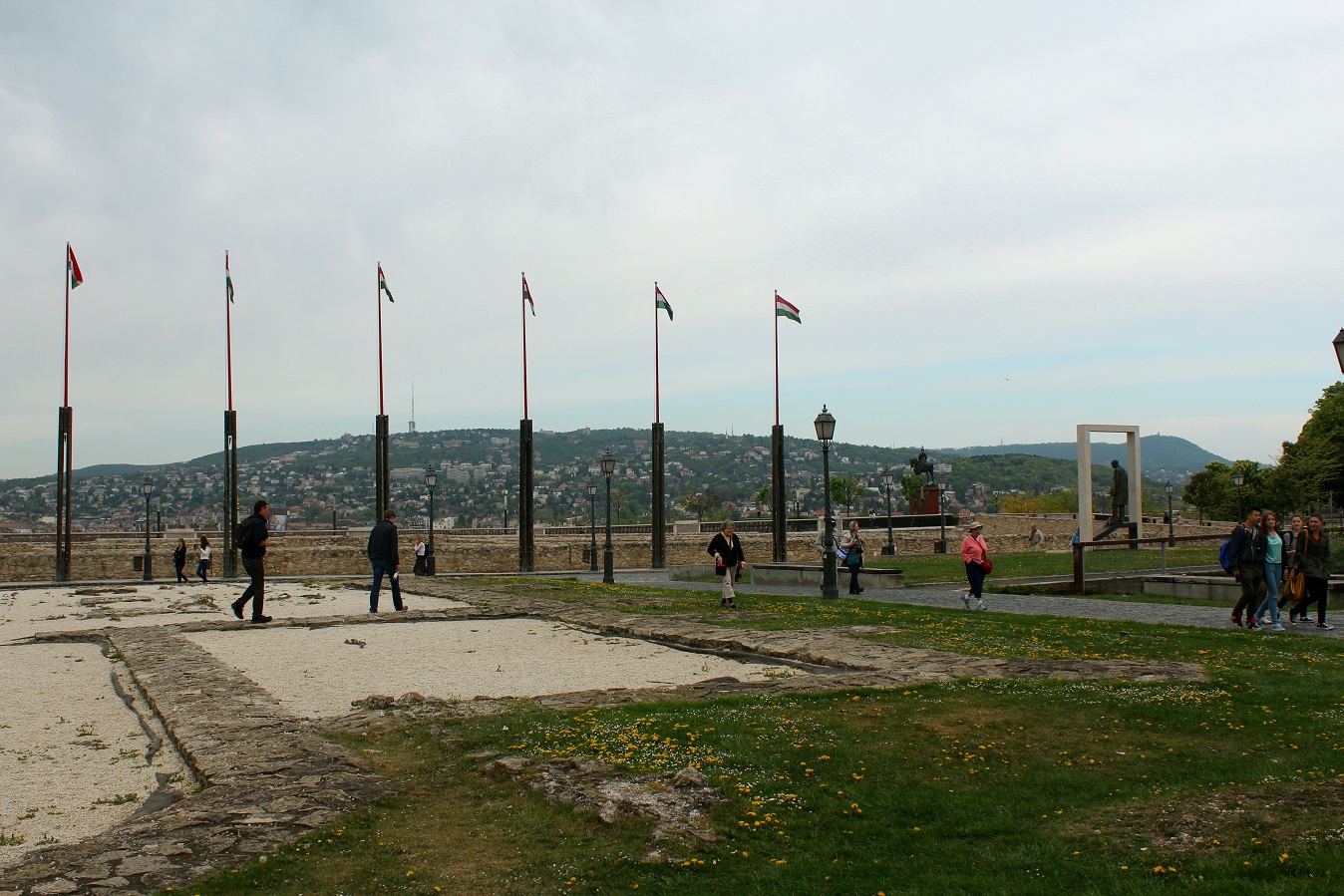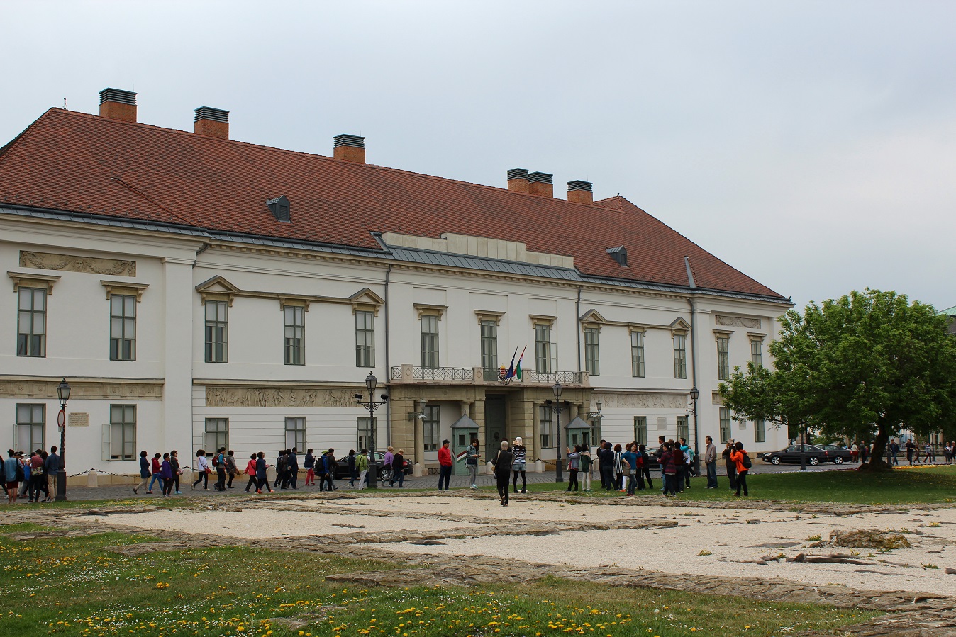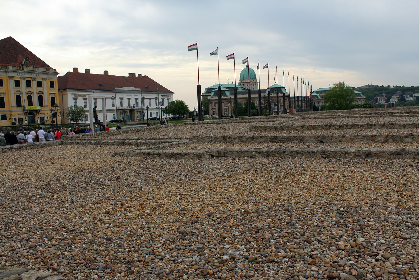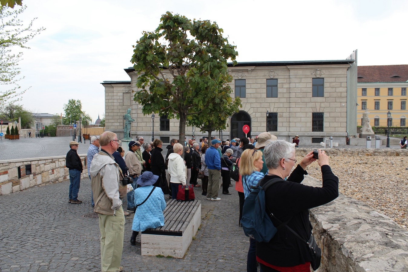 [We have arrived at Castle Hill on the “other side” of the river, a/k/a Buda. Rain was threatening and we did get spritzed on a bit. The white building is Sandor Palace, the Budapest equivalent of the White House – it’s where the president lives. Not even a fence around it? These remaining foundations in the foreground are from the 14th century castle keep and are being preserved as such.]
