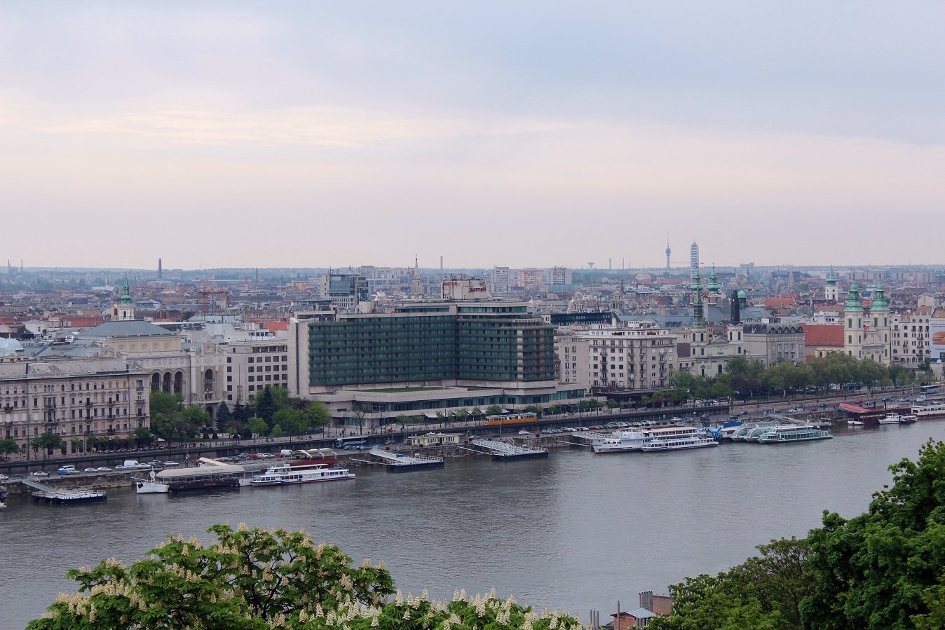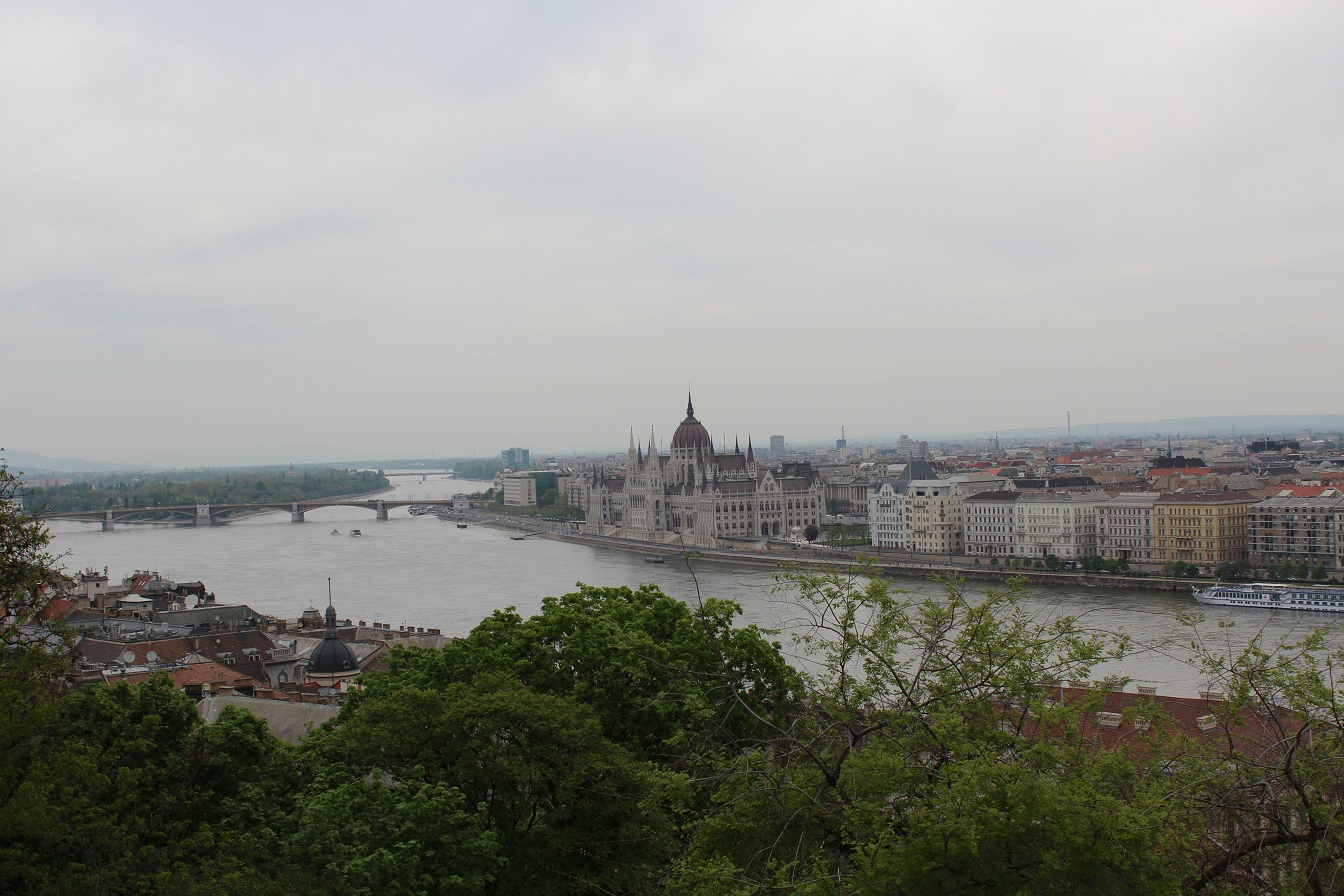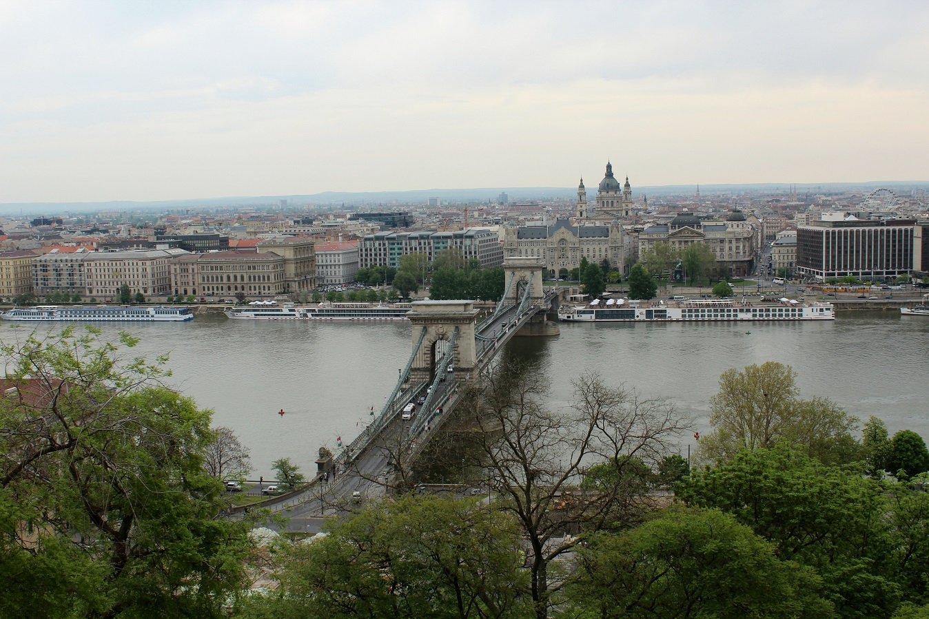 [Looking down on Chain Bridge, at our hotel, and at the Parliament where that might be our boat on the far right side.]